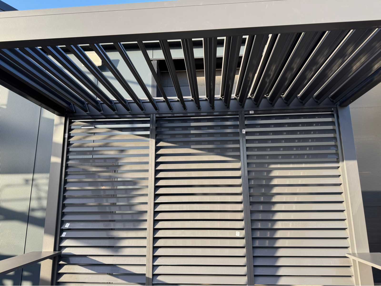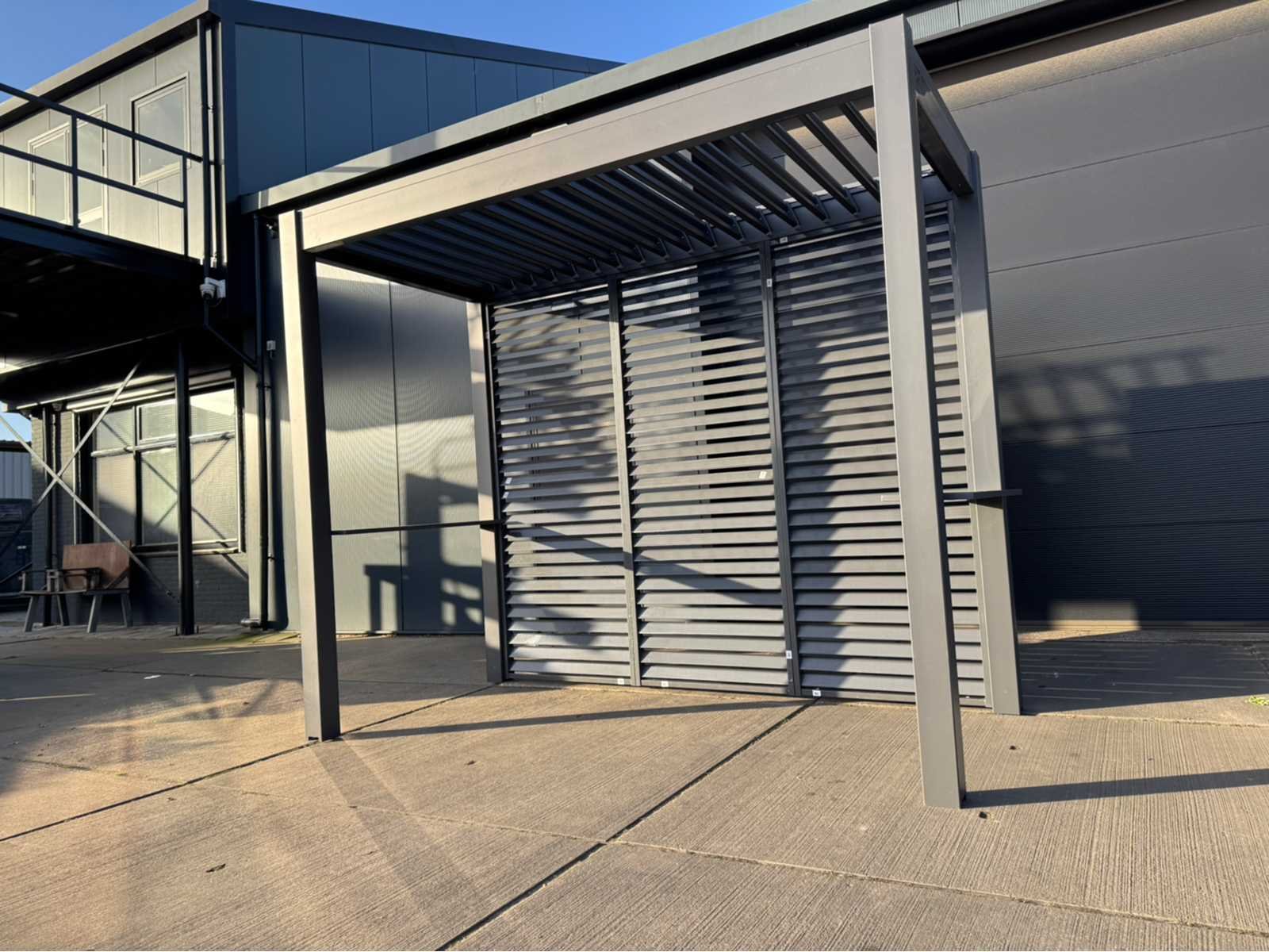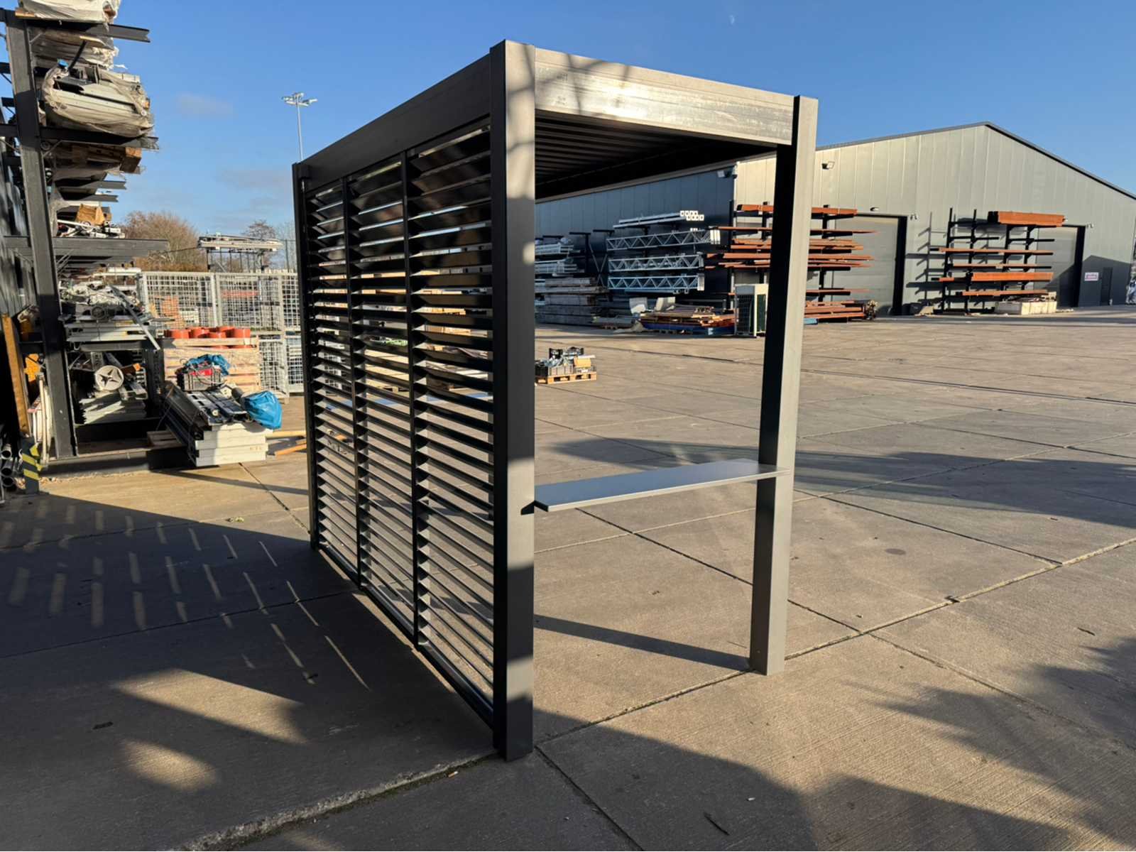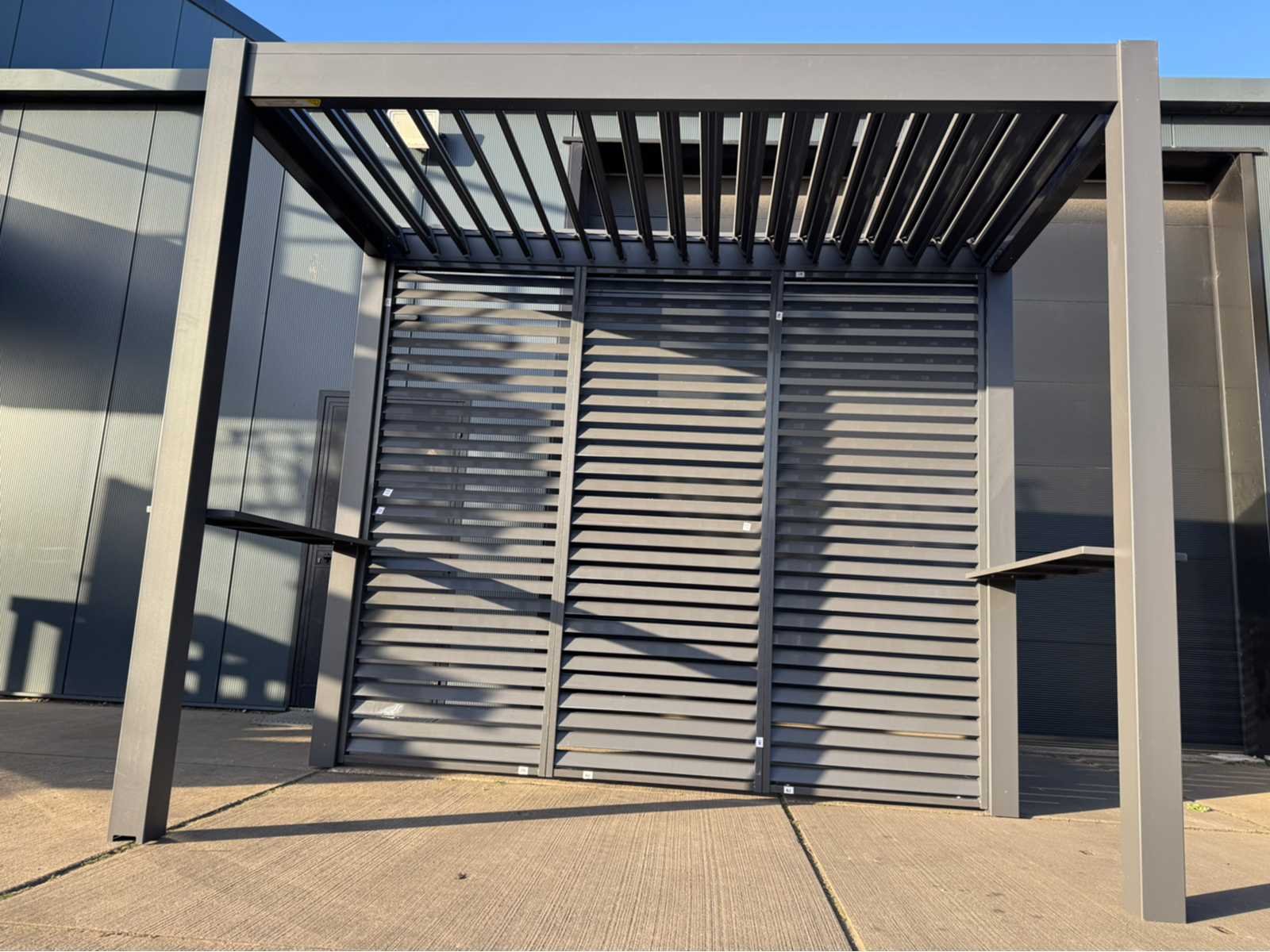 Ongebruikt; gedemonteerd geleverd in dozen; uiteraard inclusief al het benodigde klein materiaal zoals schroeven e.d; diepte is ca 1520mm; lamellen in het dak zijn open en dicht te doen dmv een handmatige slinger Lengte: 300cm Breedte: 152cm Hoogte: 255cm Materiaal: Aluminium