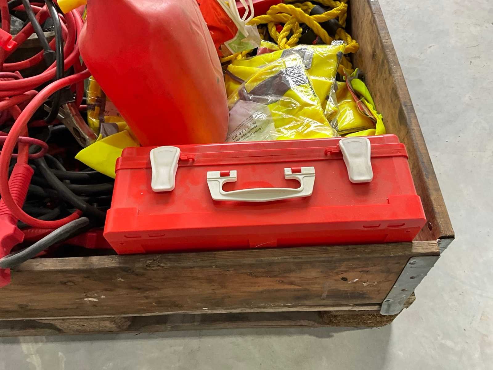 Partij startkabel sets, sleepkabels, wielmoersleutel, spiegels, noodhamers, veiligheidshesjes