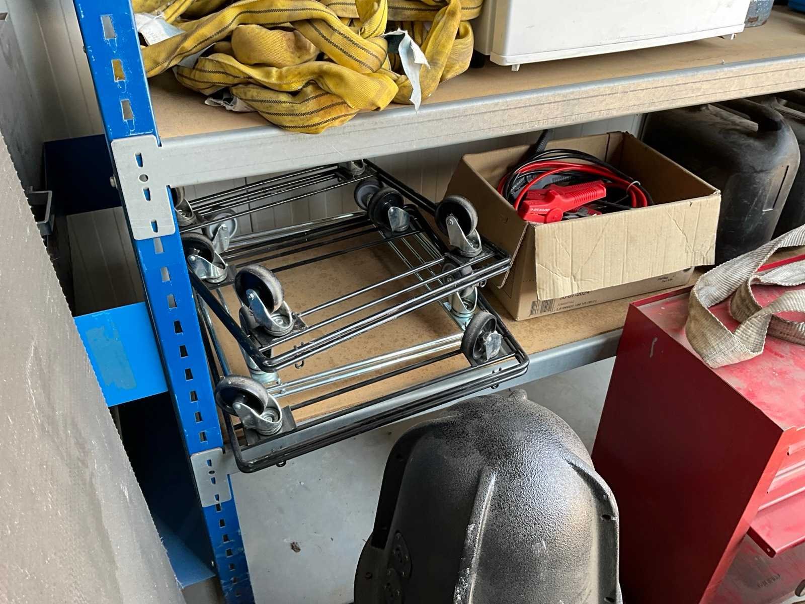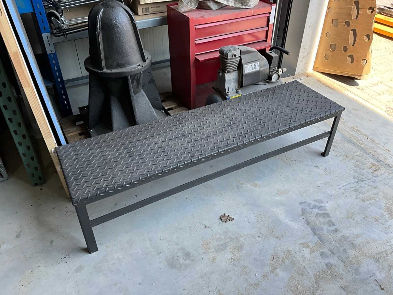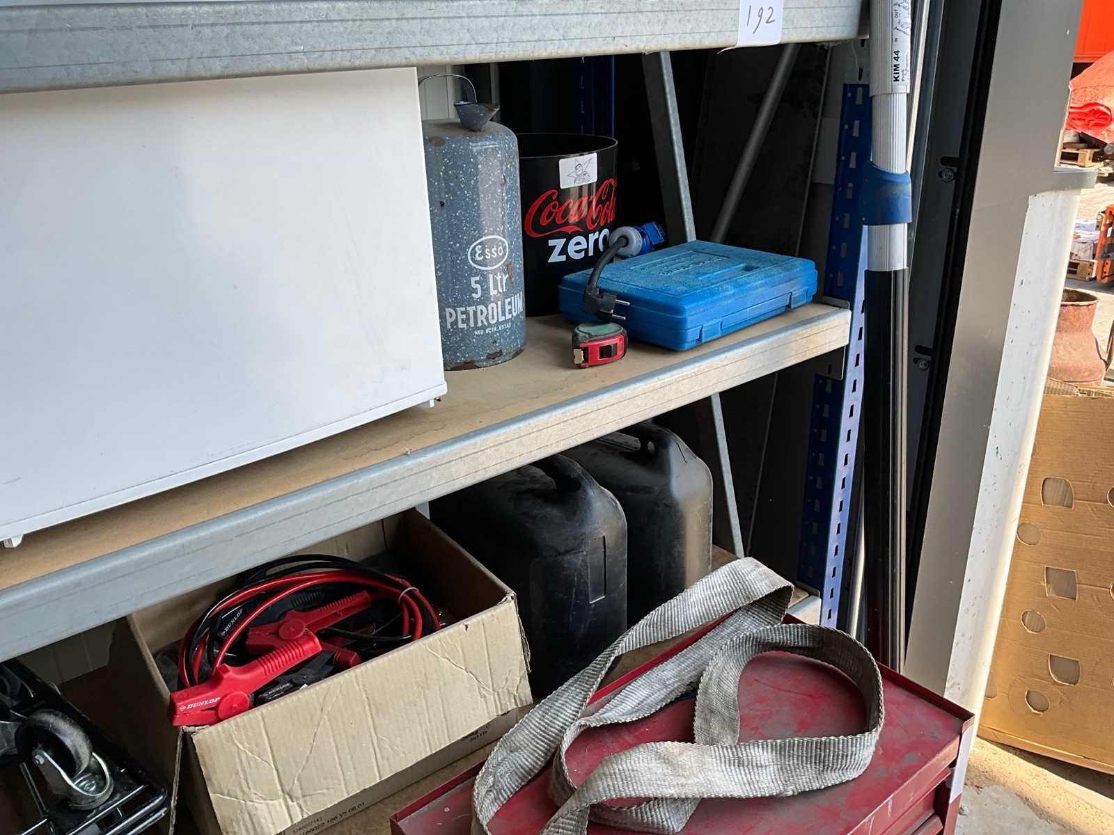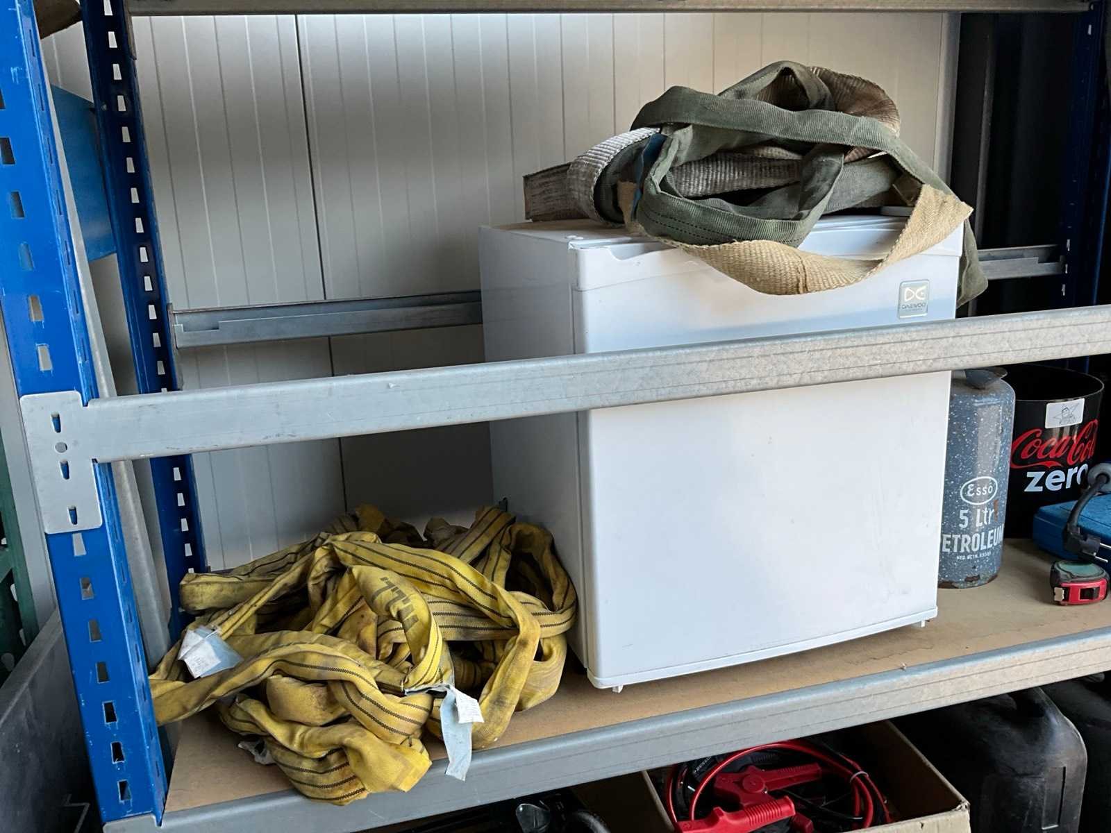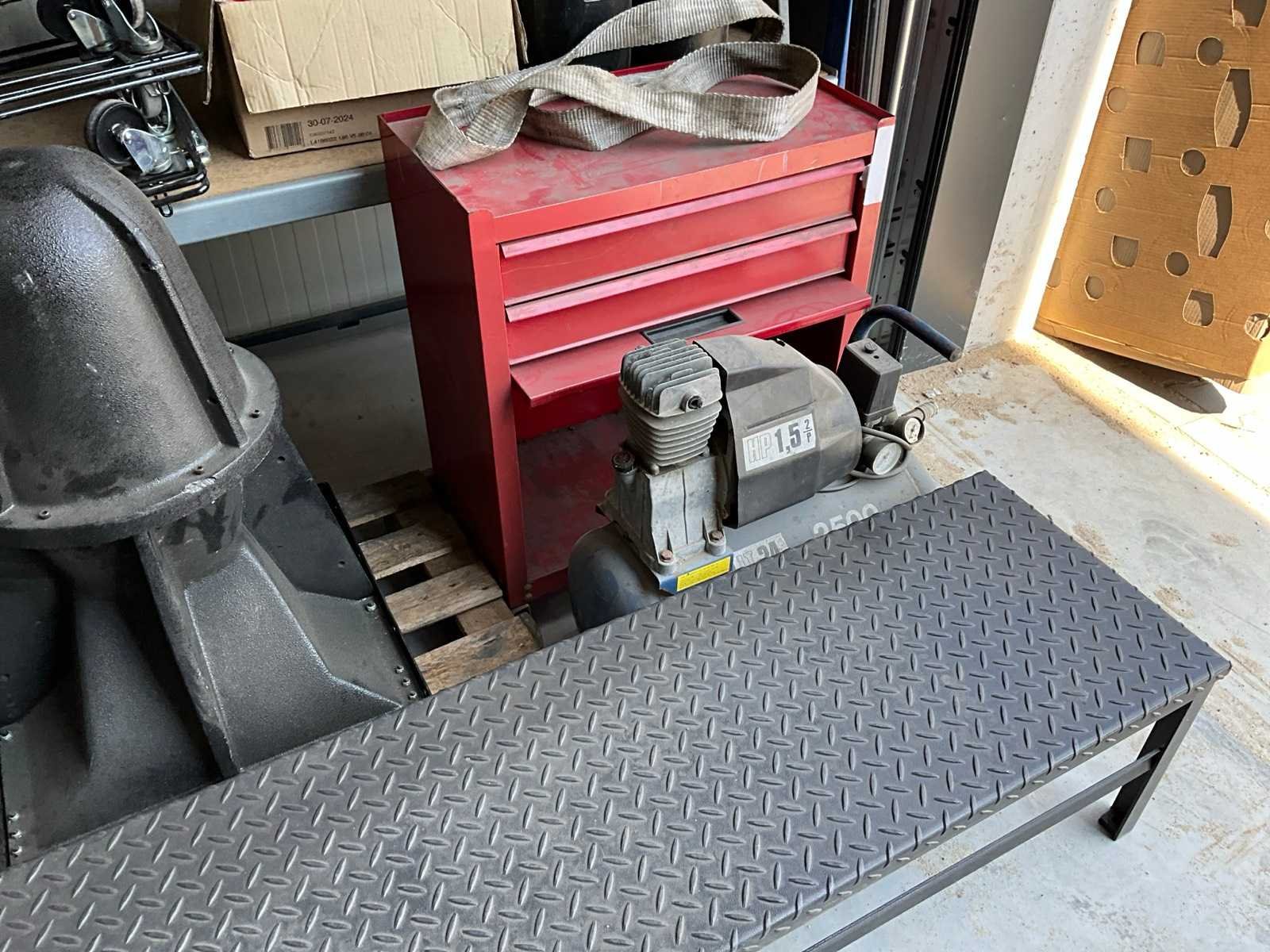 Voetenbank, compressor, gereedschapskar, houten binnendeur, startkabels, transport karren, jerrycans, Hijsbanden, koelkast, legbordstelling