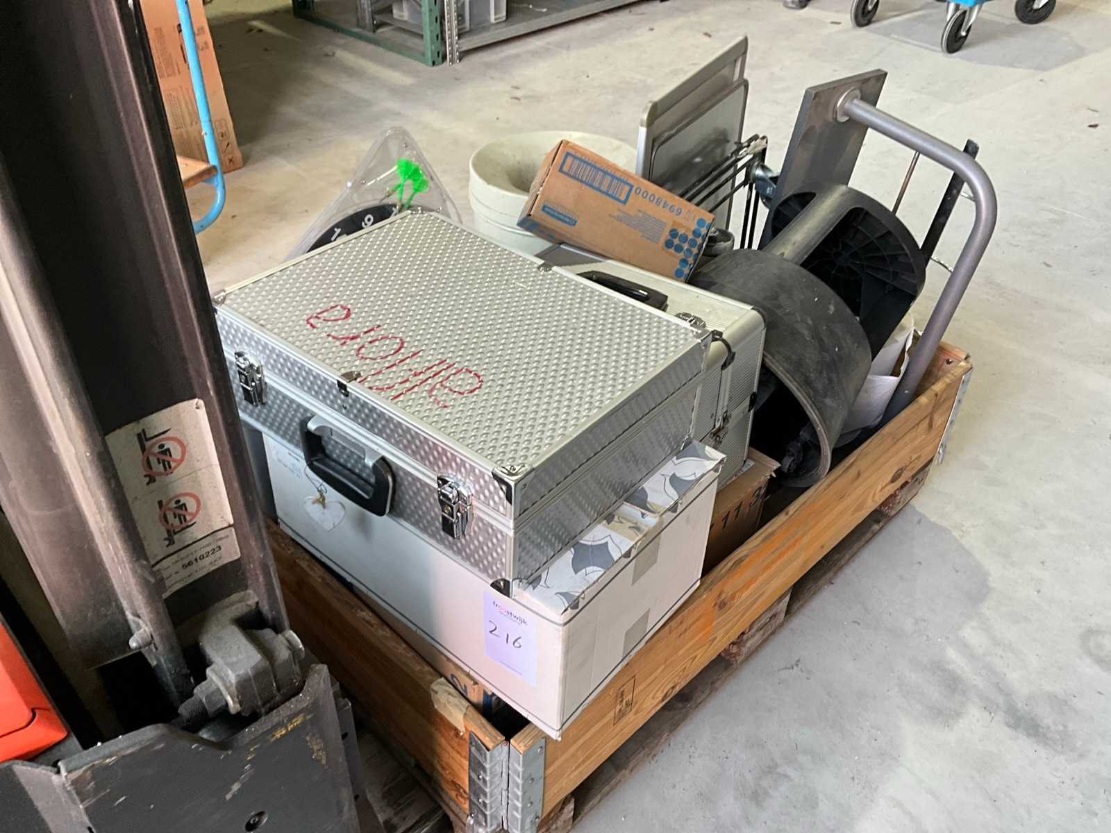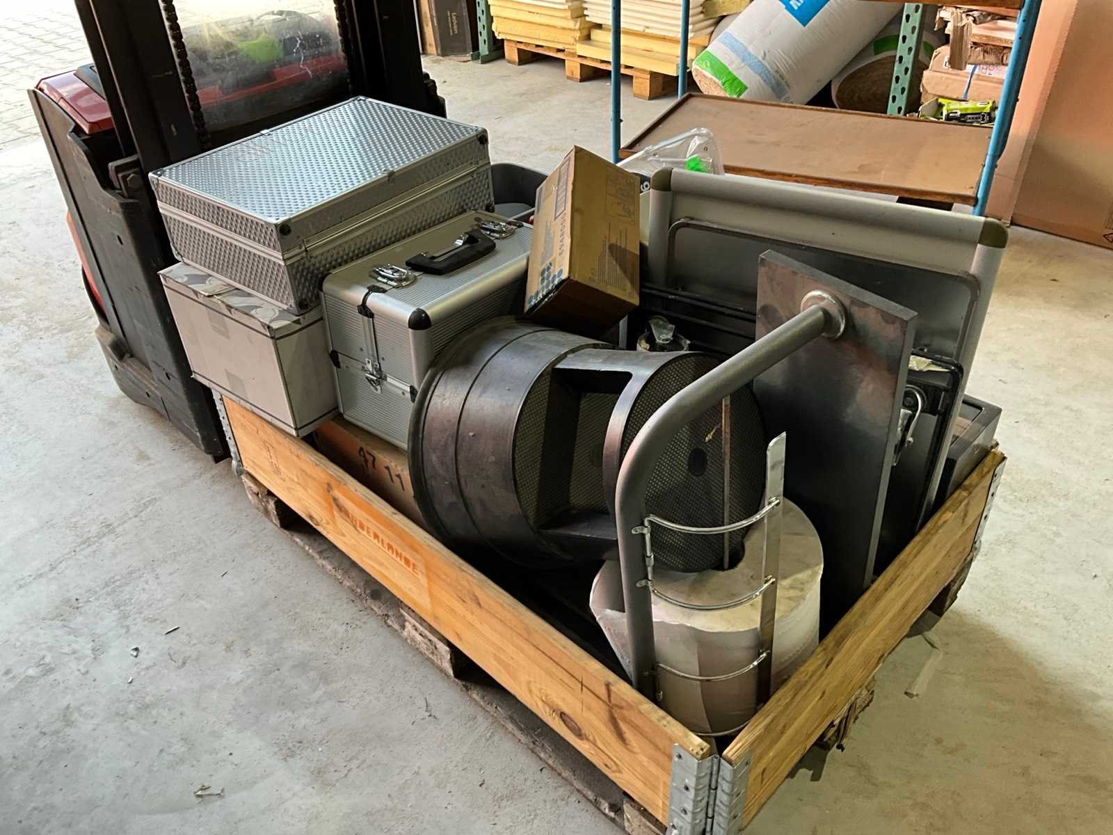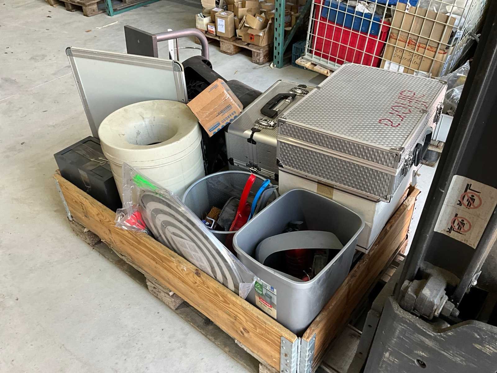 Gereedschapskoffers, opstapje, schoonmaak gereedschap, kluis, prullenbakken, brandblussers, zonder pallet en palletranden