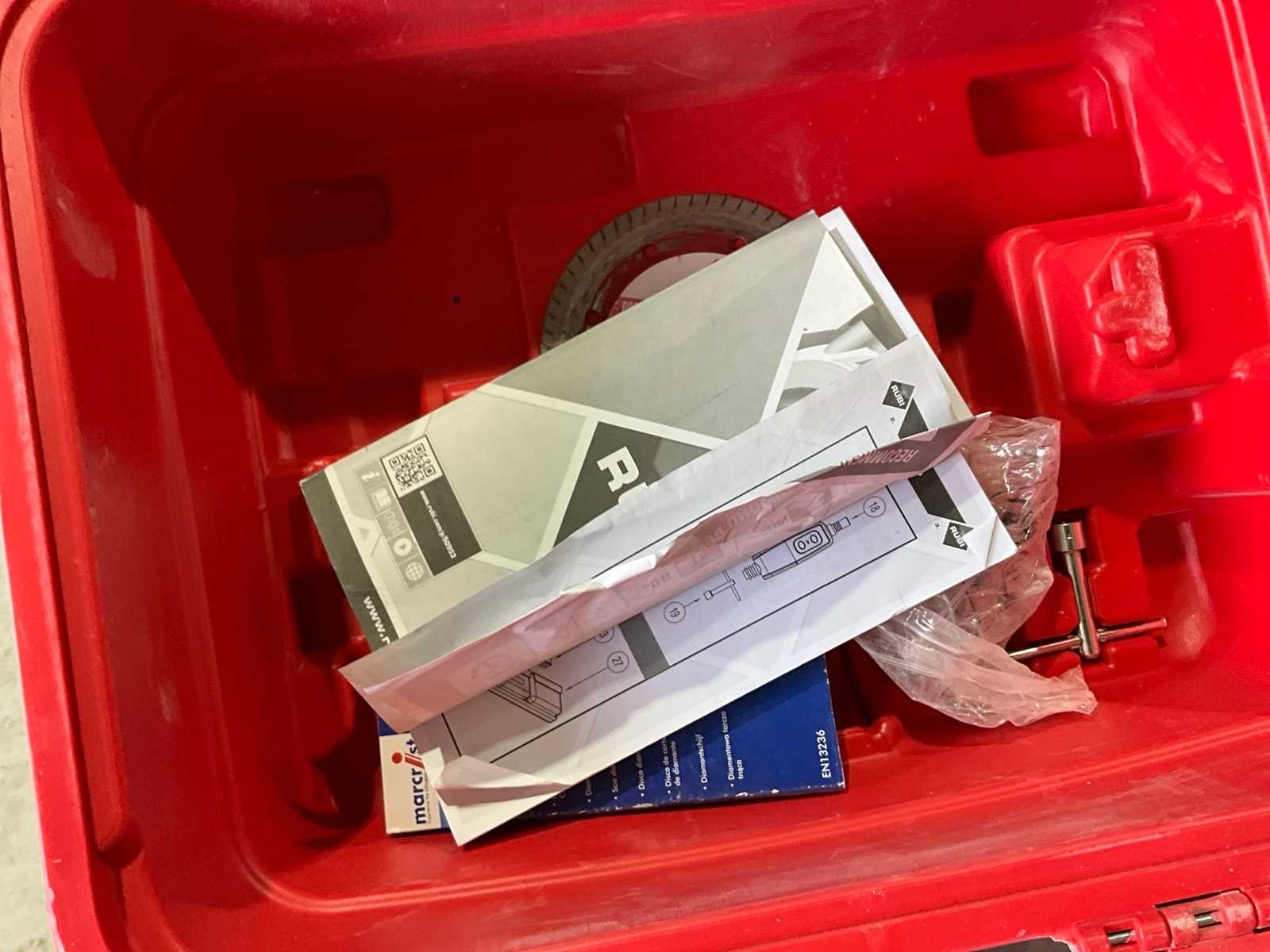 3x rails 1100mm lang, 2x zuignap, 2x snelspanner, reserve zaagblad Merk: Rubi Model: TC125 Spanning: 230V Toerental: 13800p/min Zaagdiepte: 25mm Vermogen: 1250W Met koffer: true Diameter zaagblad: 125