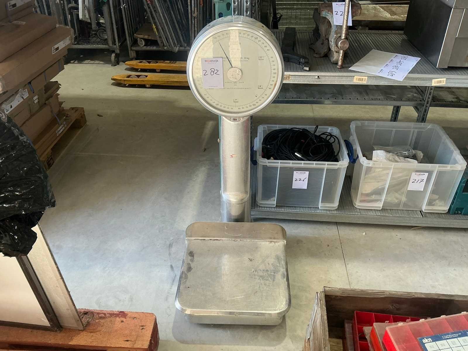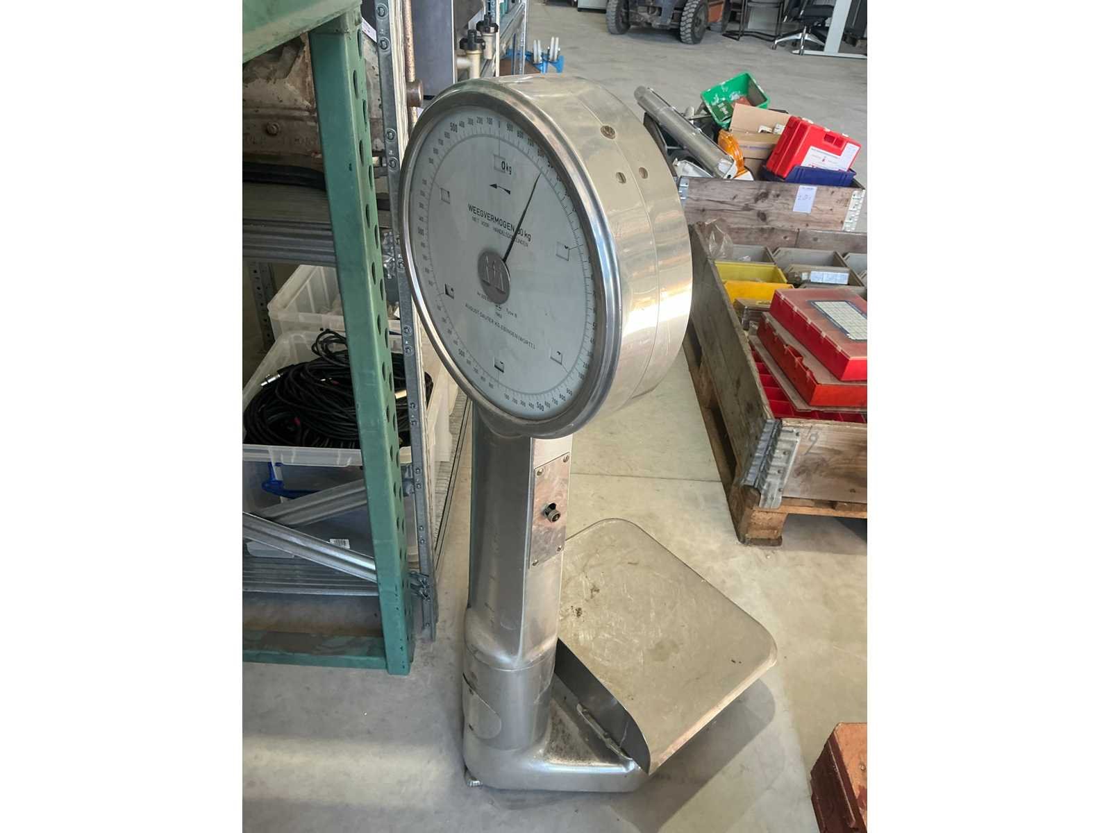 Merk: August Sauter Type: B Bouwjaar: 1963 Serienummer: 203 574 Weegbereik max: 30kg Plateau afm. l: 420mm Plateau afm. b: 360mm Totale afmeting L: 500mm Totale afmeting Breedte: 450mm Totale afmeting Hoogte: 1080mm