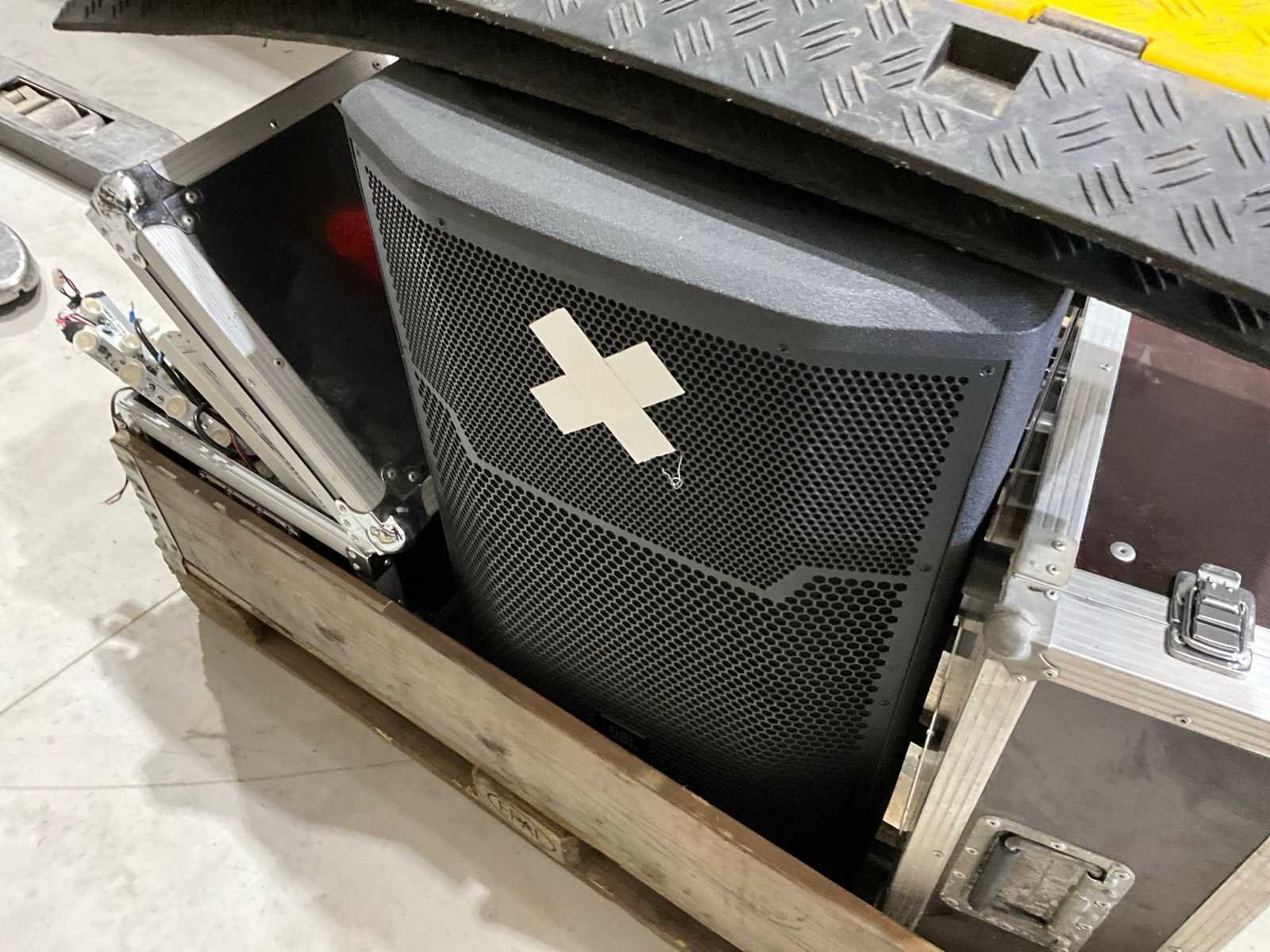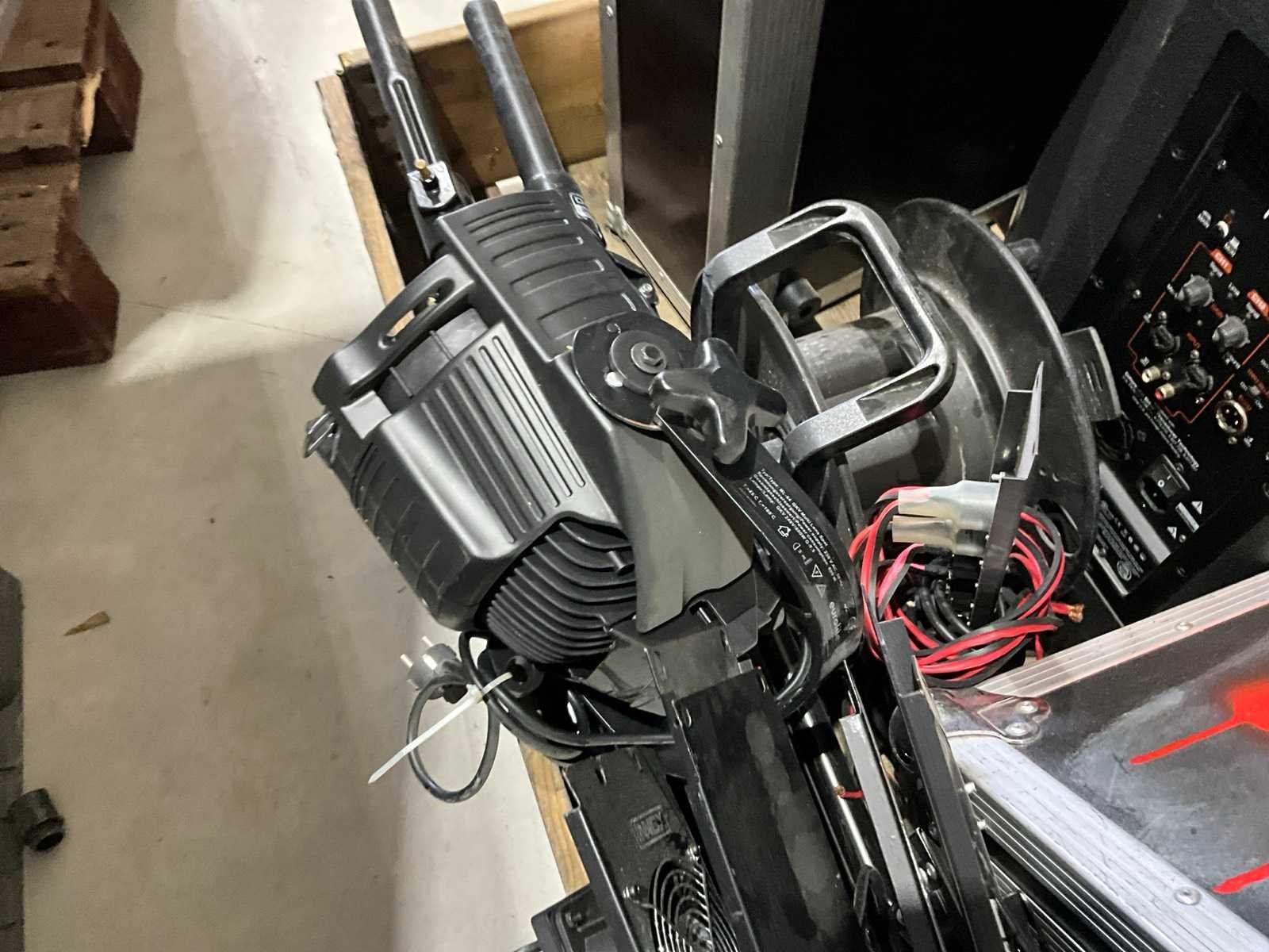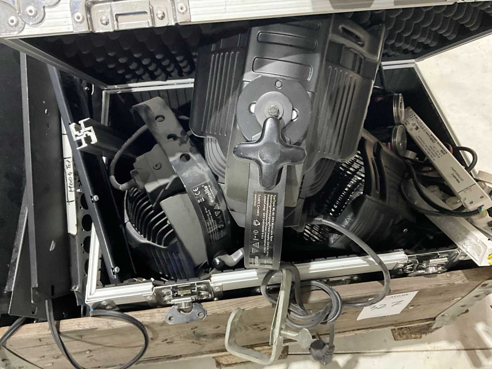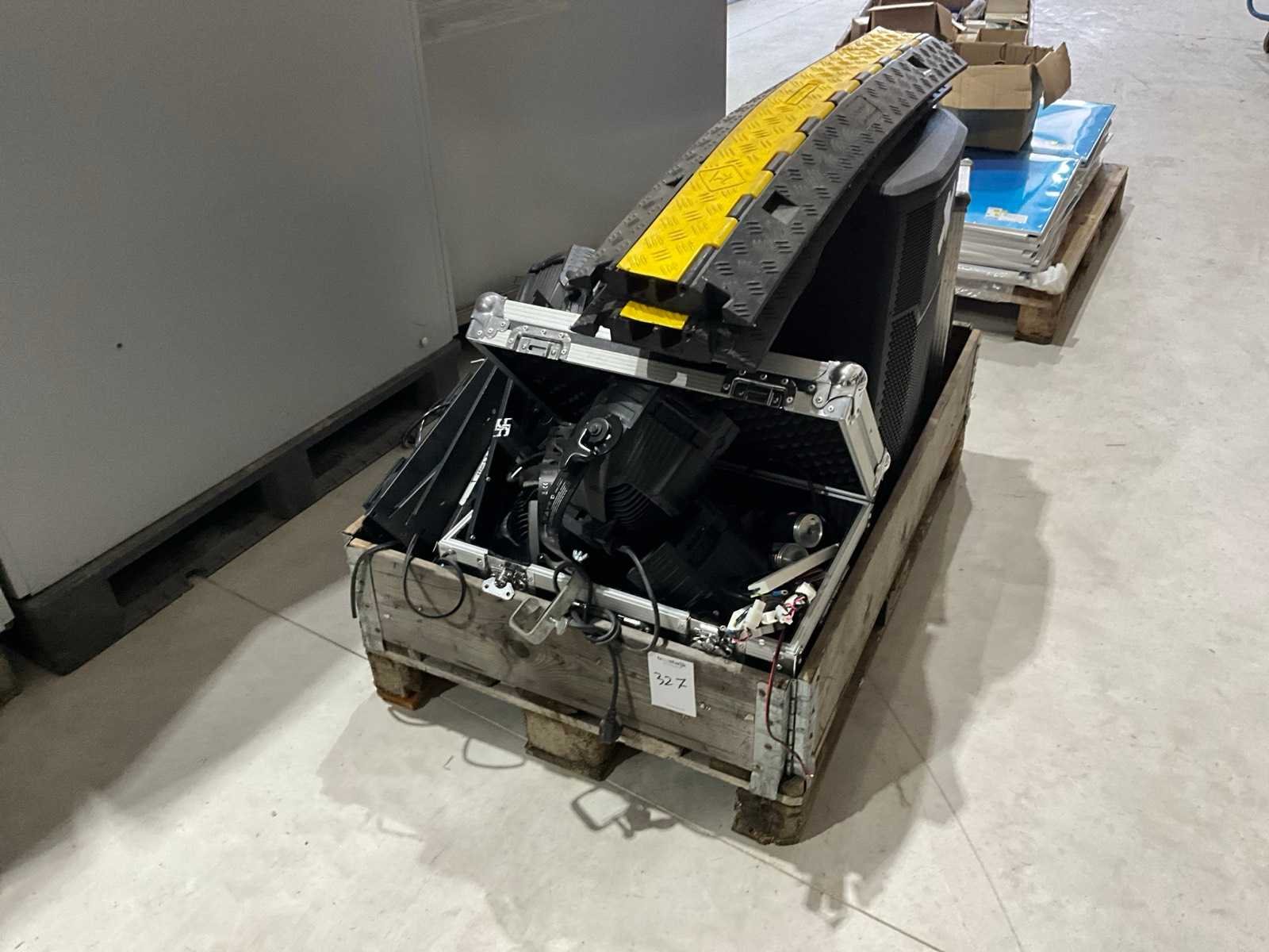 4x 600W spot, 2x statief, diverse lampen, JBL PRX715 speaker, lege kist