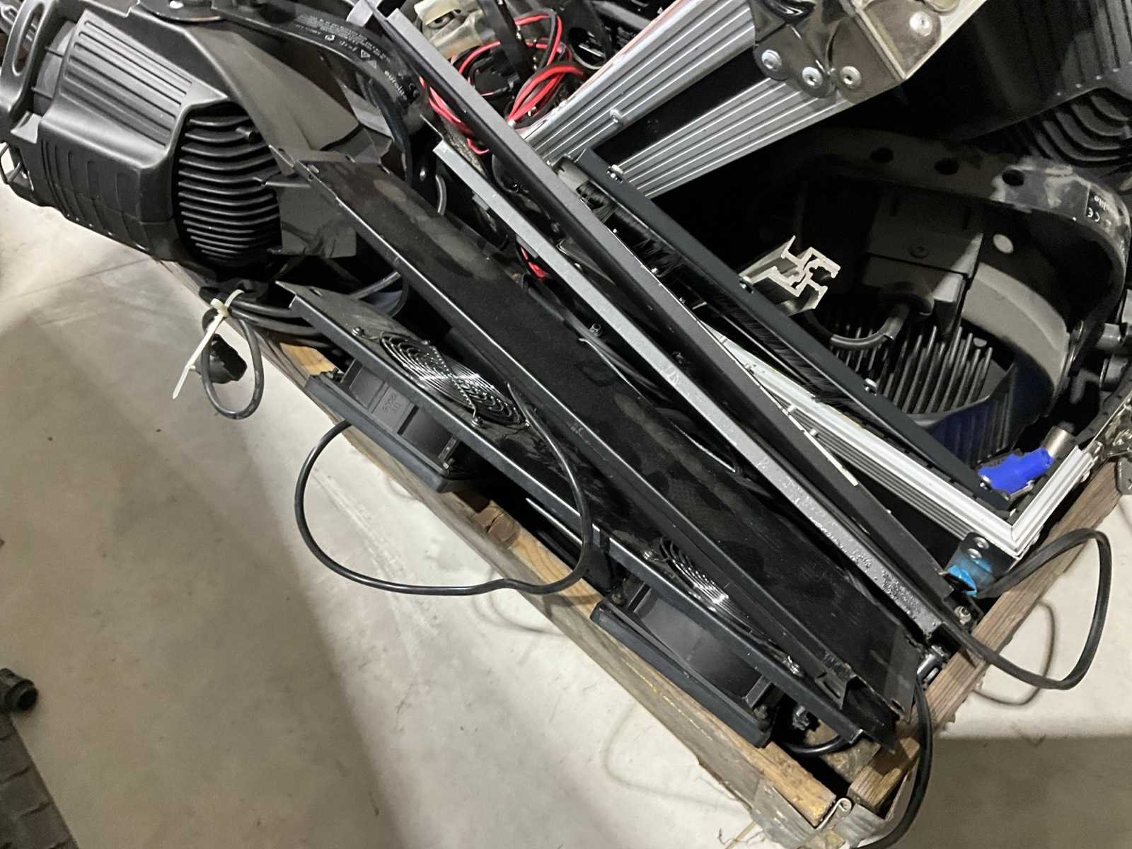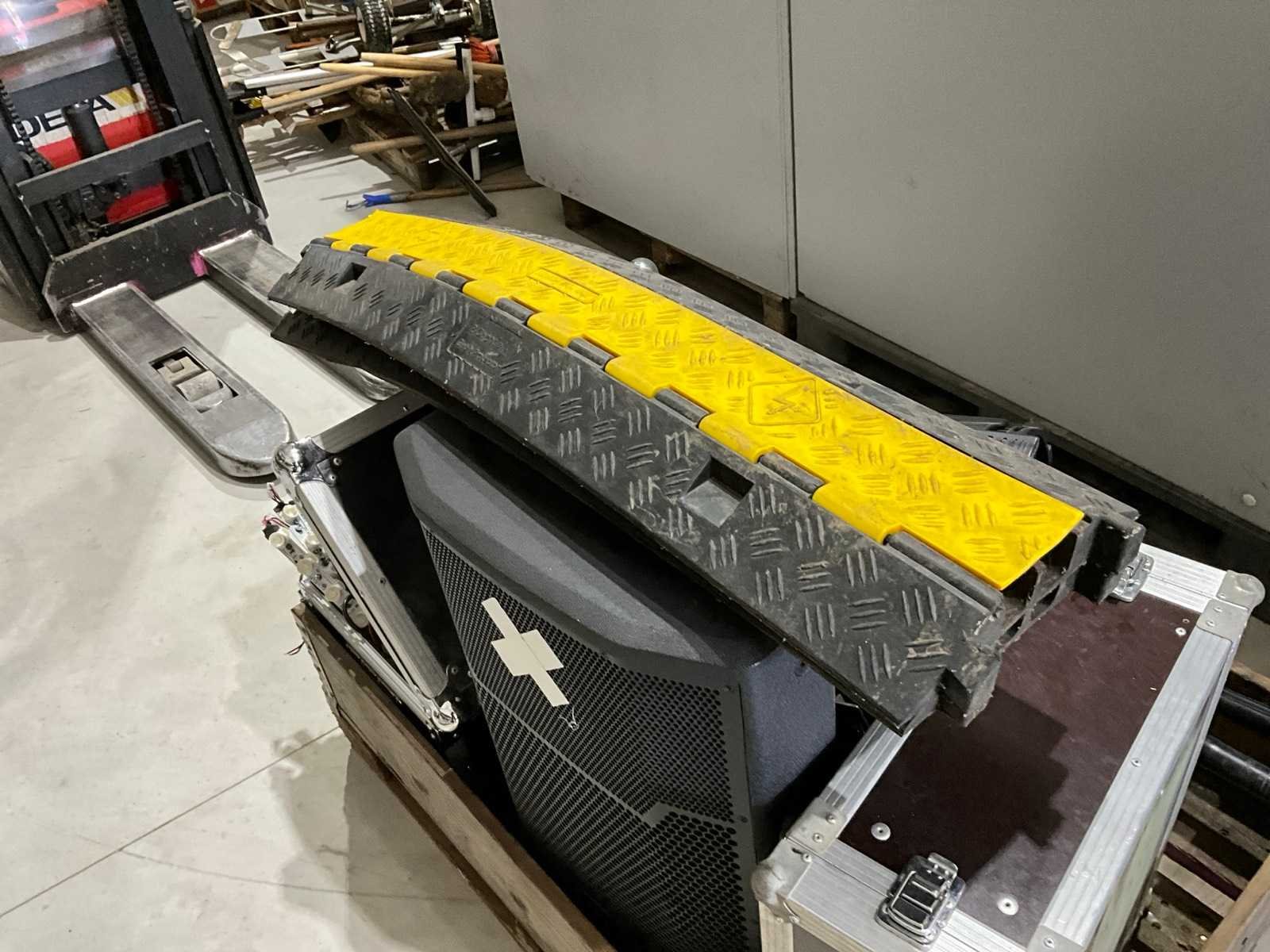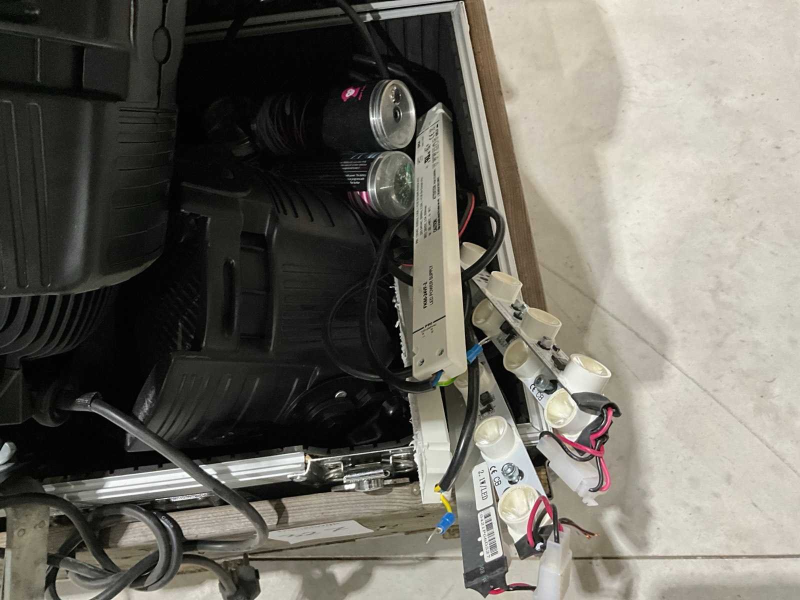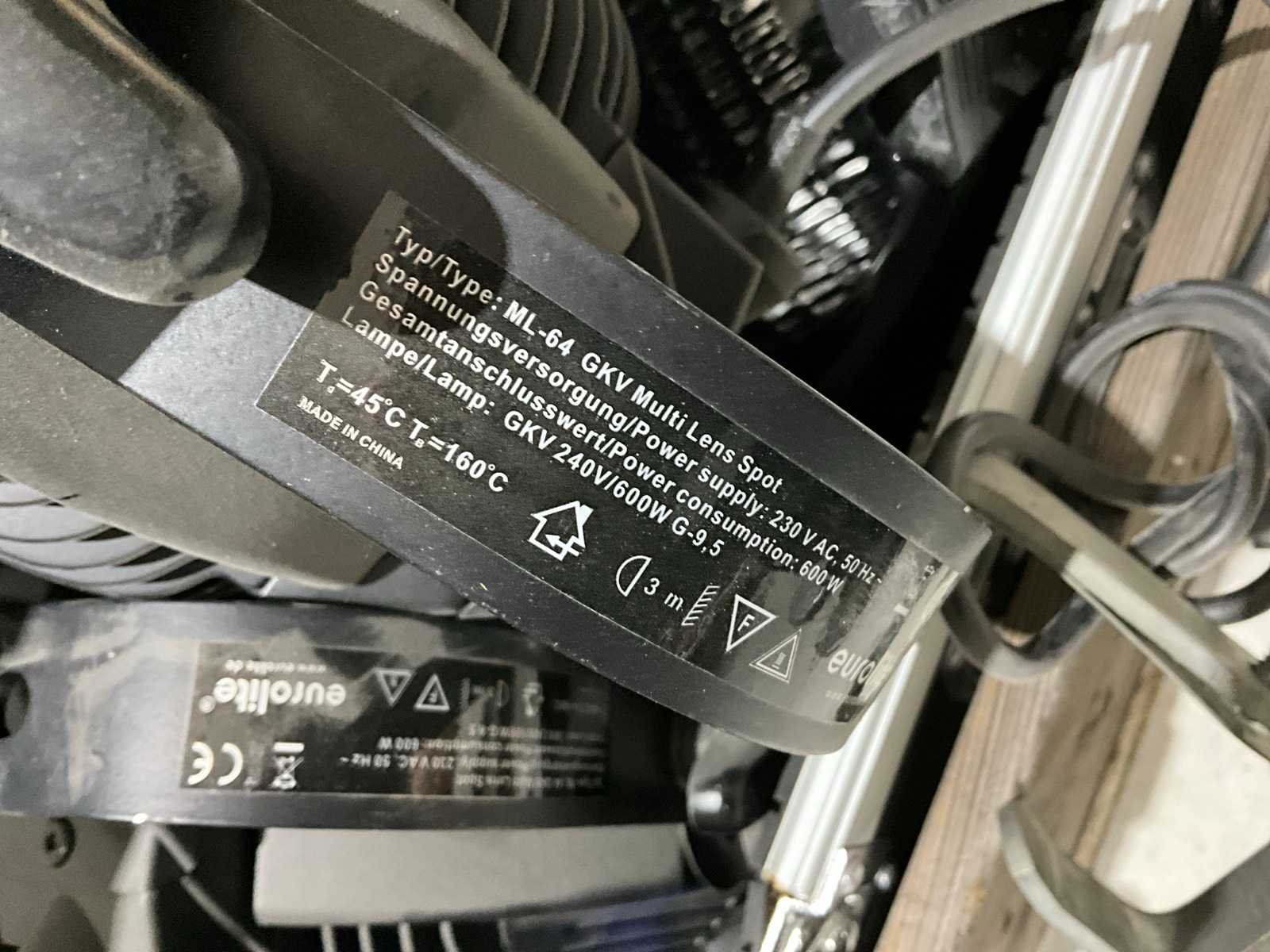 4x 600W spot, 2x statief, diverse lampen, JBL PRX715 speaker, lege kist