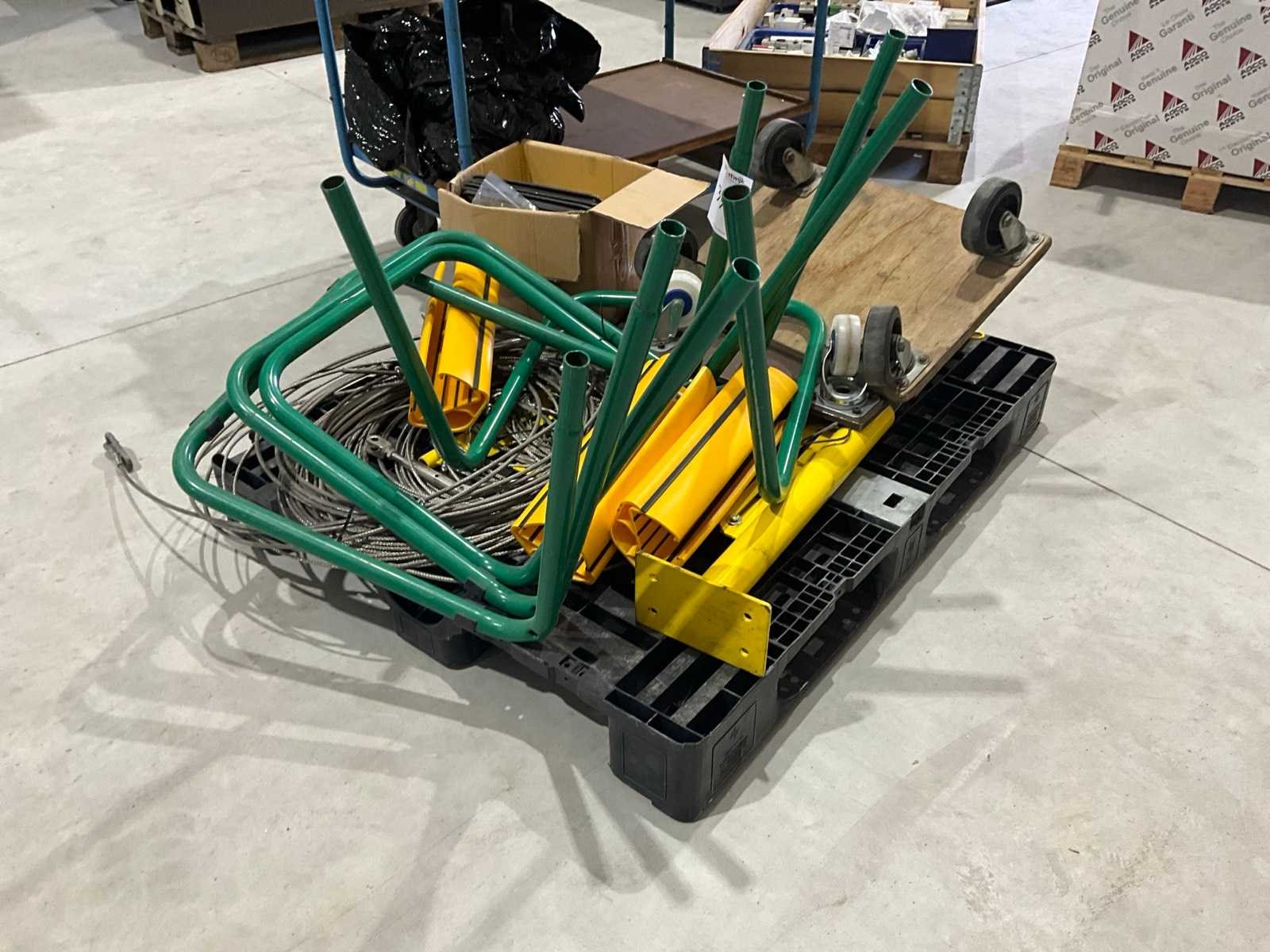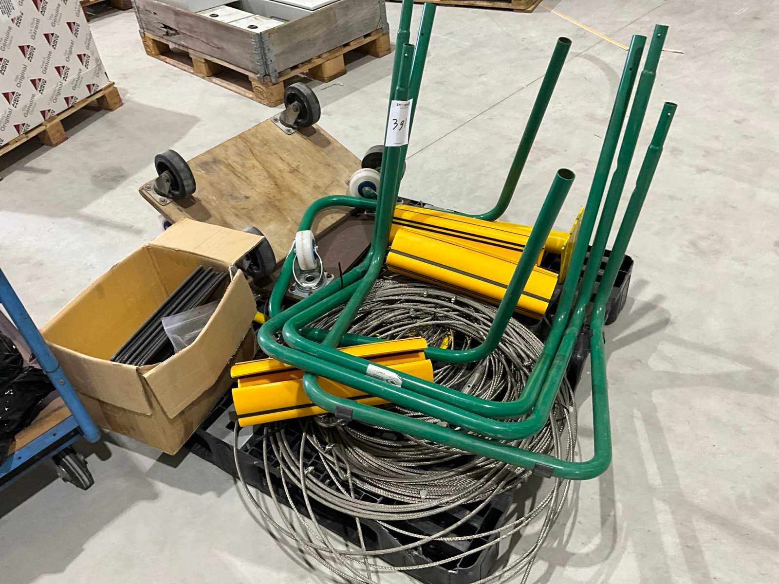 Transport karren, afvalzak houders, staalkabels, aanrij beveiliging stellingen