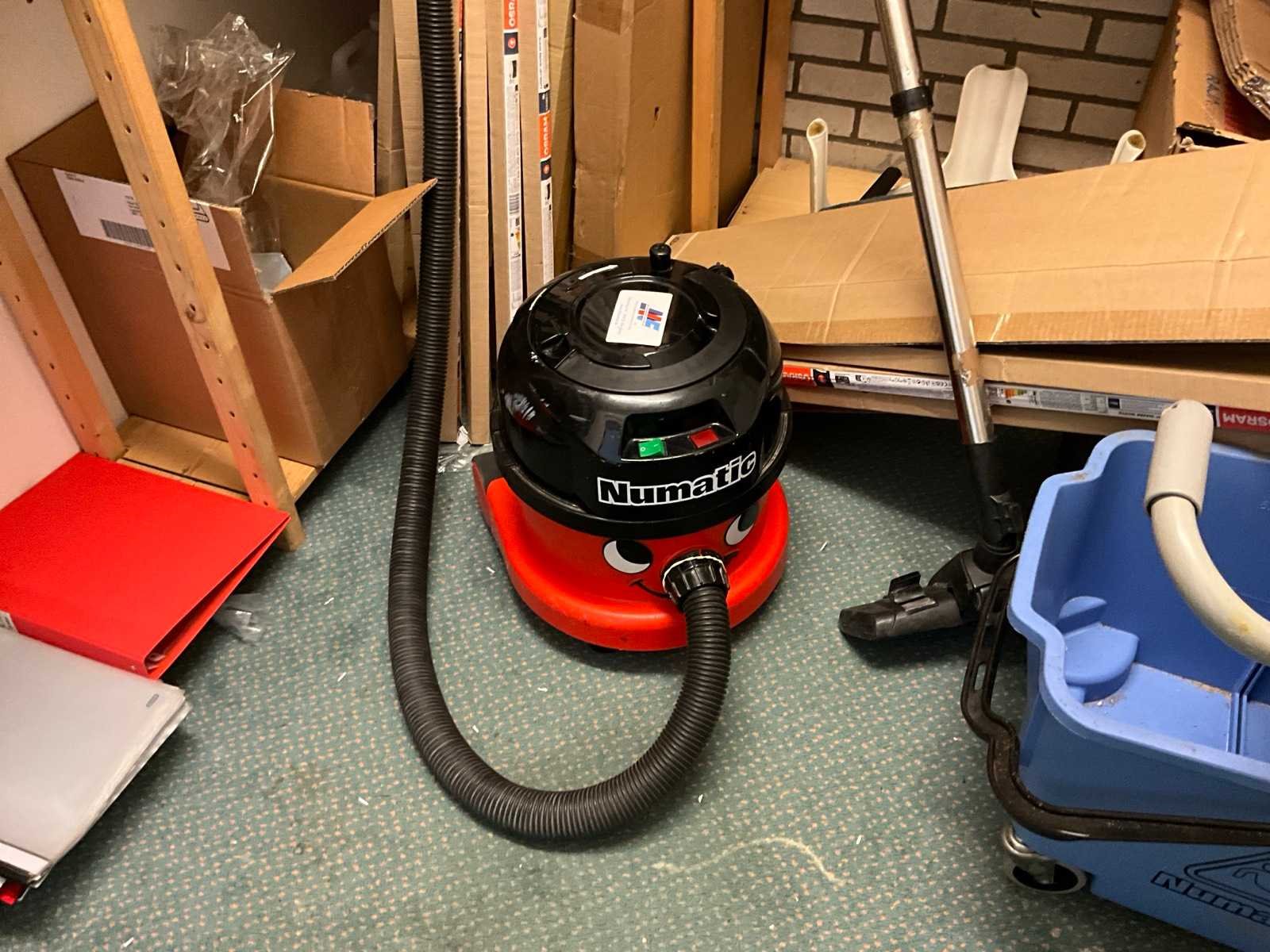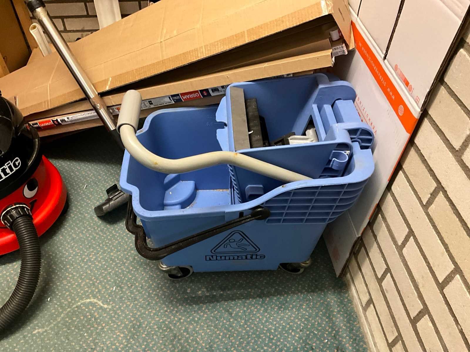 Betreft de inhoud van de ruimte; onder andere: houten Legbordstellingen, Numatic stofzuiger, kantoorgerei, banners, schoonmaakmiddelen, etc