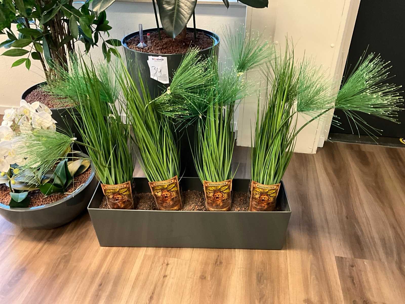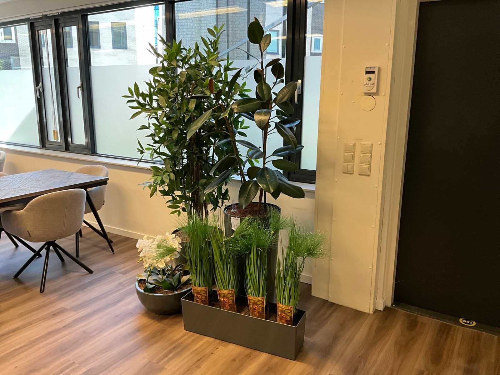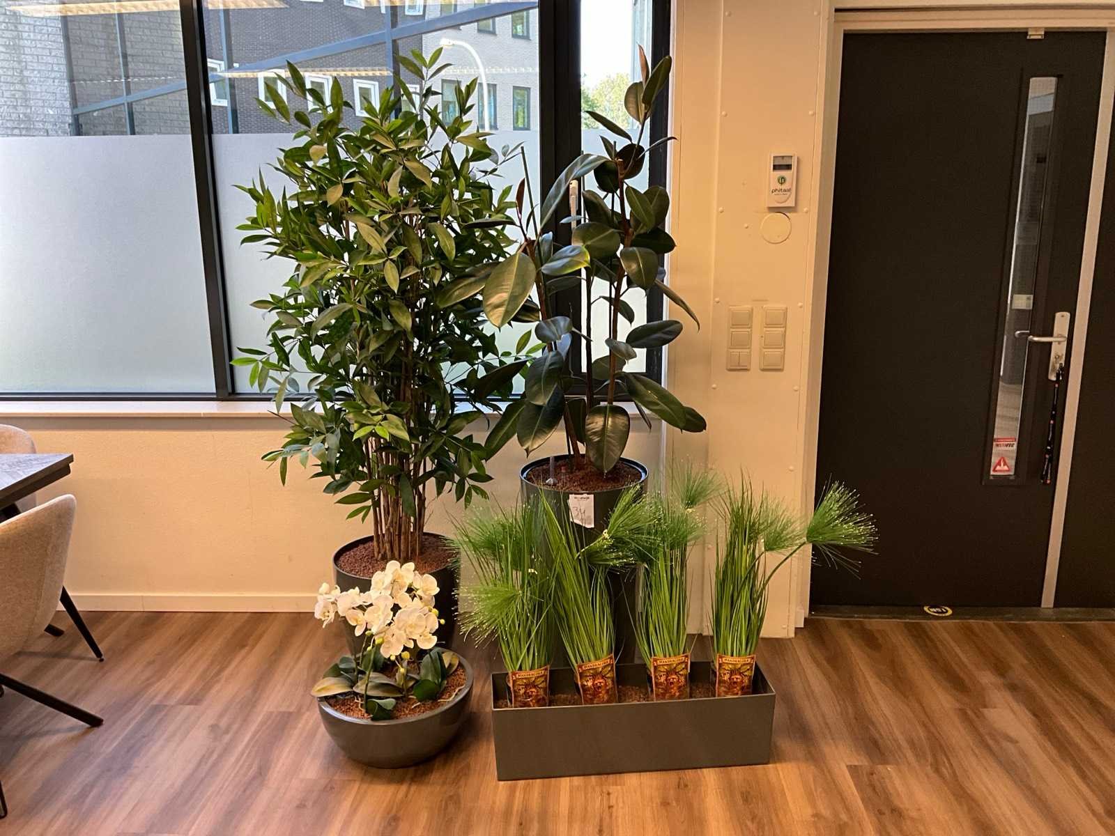 Bestaande uit 3x kunstplant en 1x hydrocultuurplant; in kunststof pot; hoogst gemeten plant: 200cm