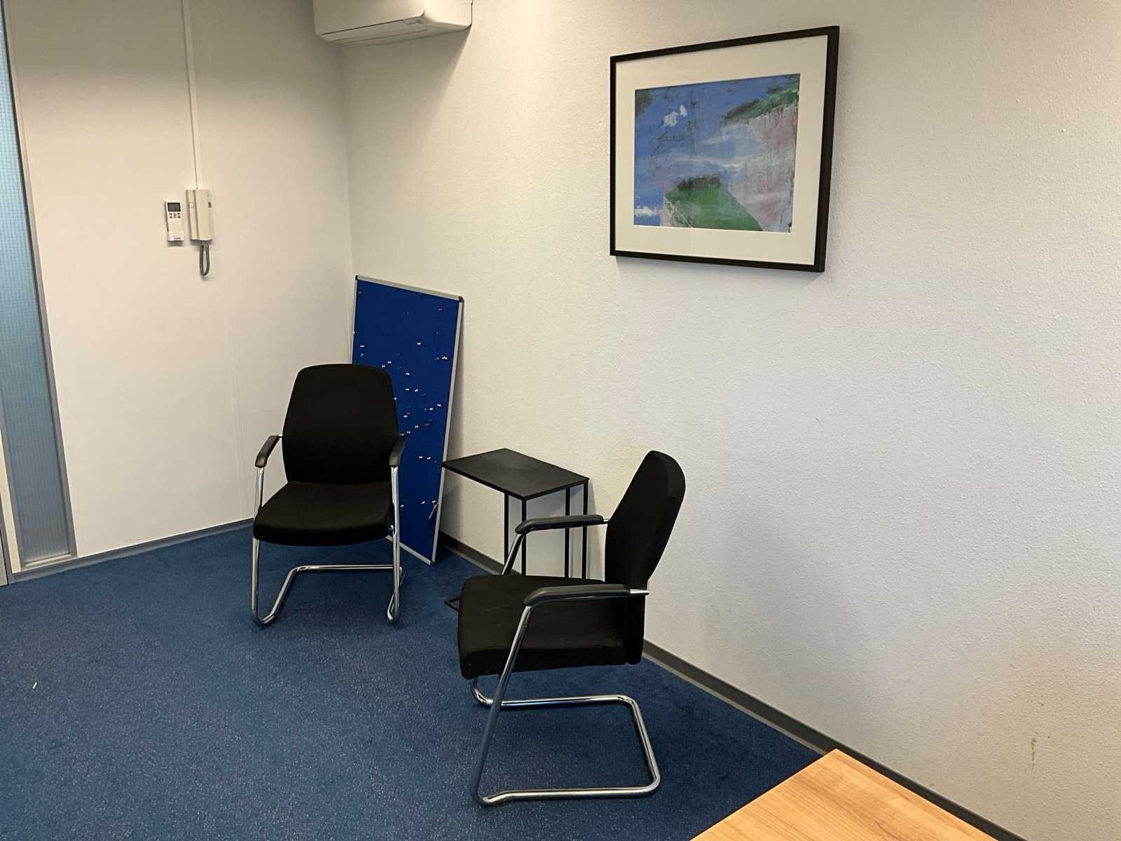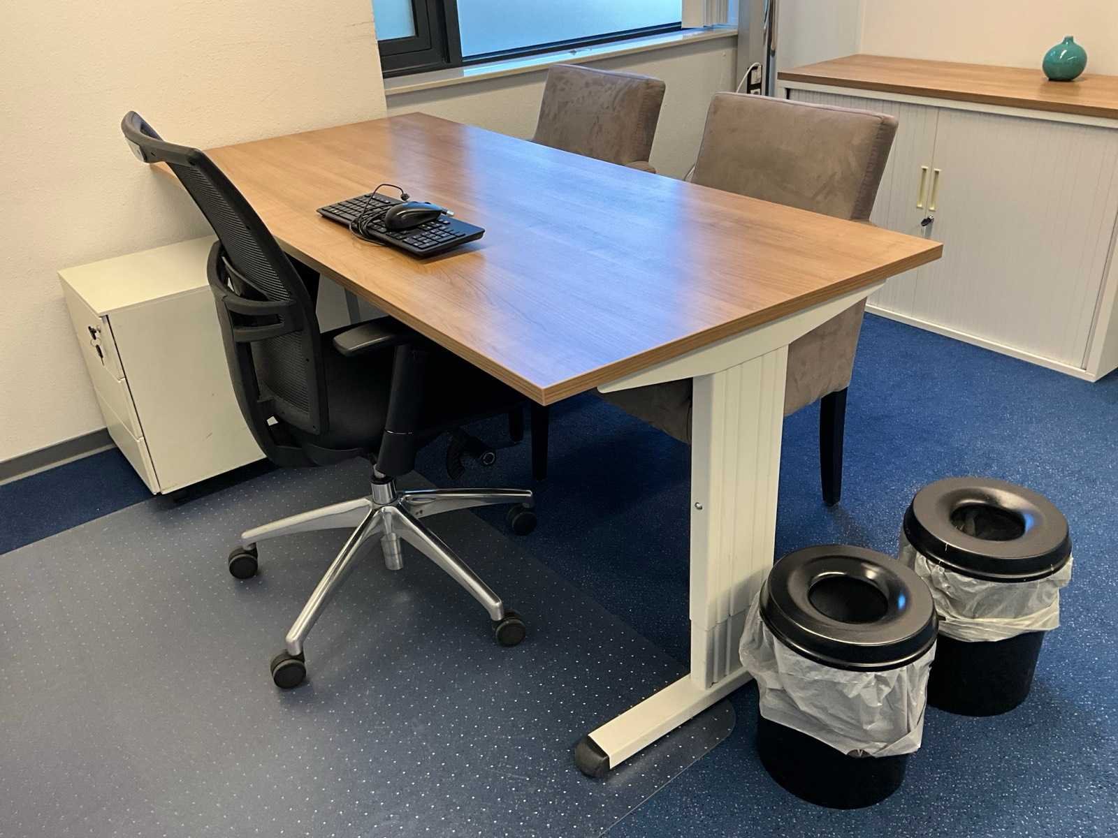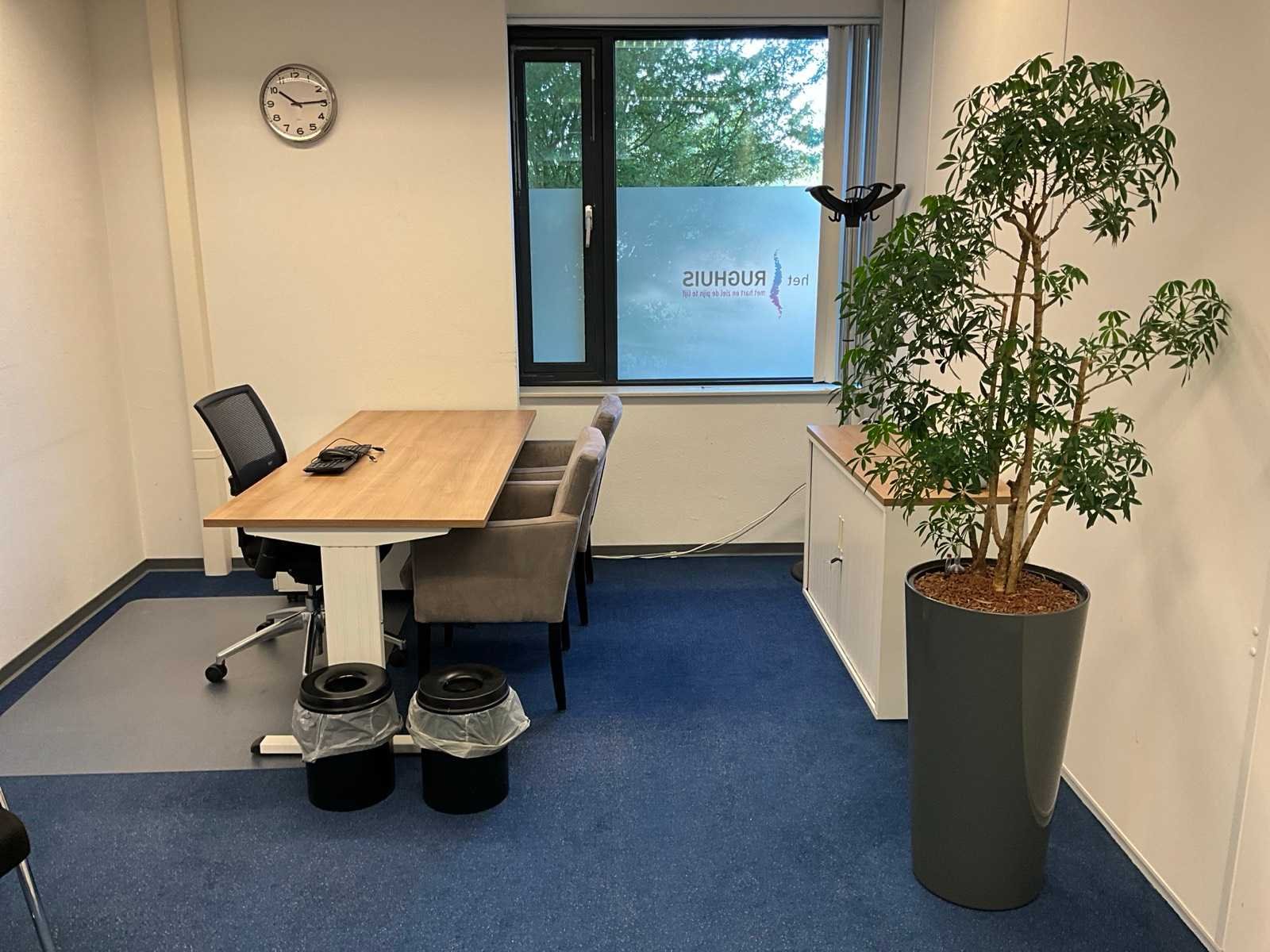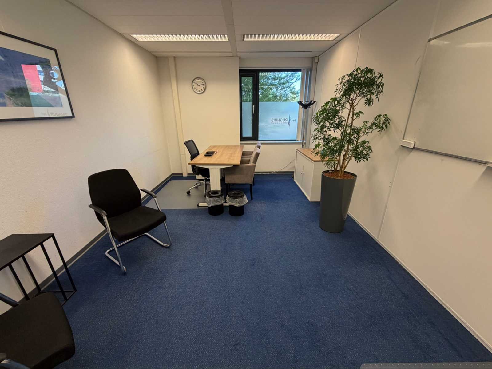 Bestaande uit inhoud kantoorruimte voorzien van onder andere: bureautafel 80x160cm in hoogte verstelbaar, ladeblok, bureaustoel, 2x De Arend eetkamerstoel, 2x vergaderstoel met sledeframe, roldeurkast H75xB120xD44cm, hydrocultuurplant in pot, bijzettafel, kapstok, wanddecoratie en whiteboard 90x120cm (wandgemonteerd)