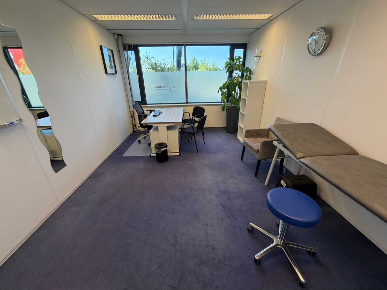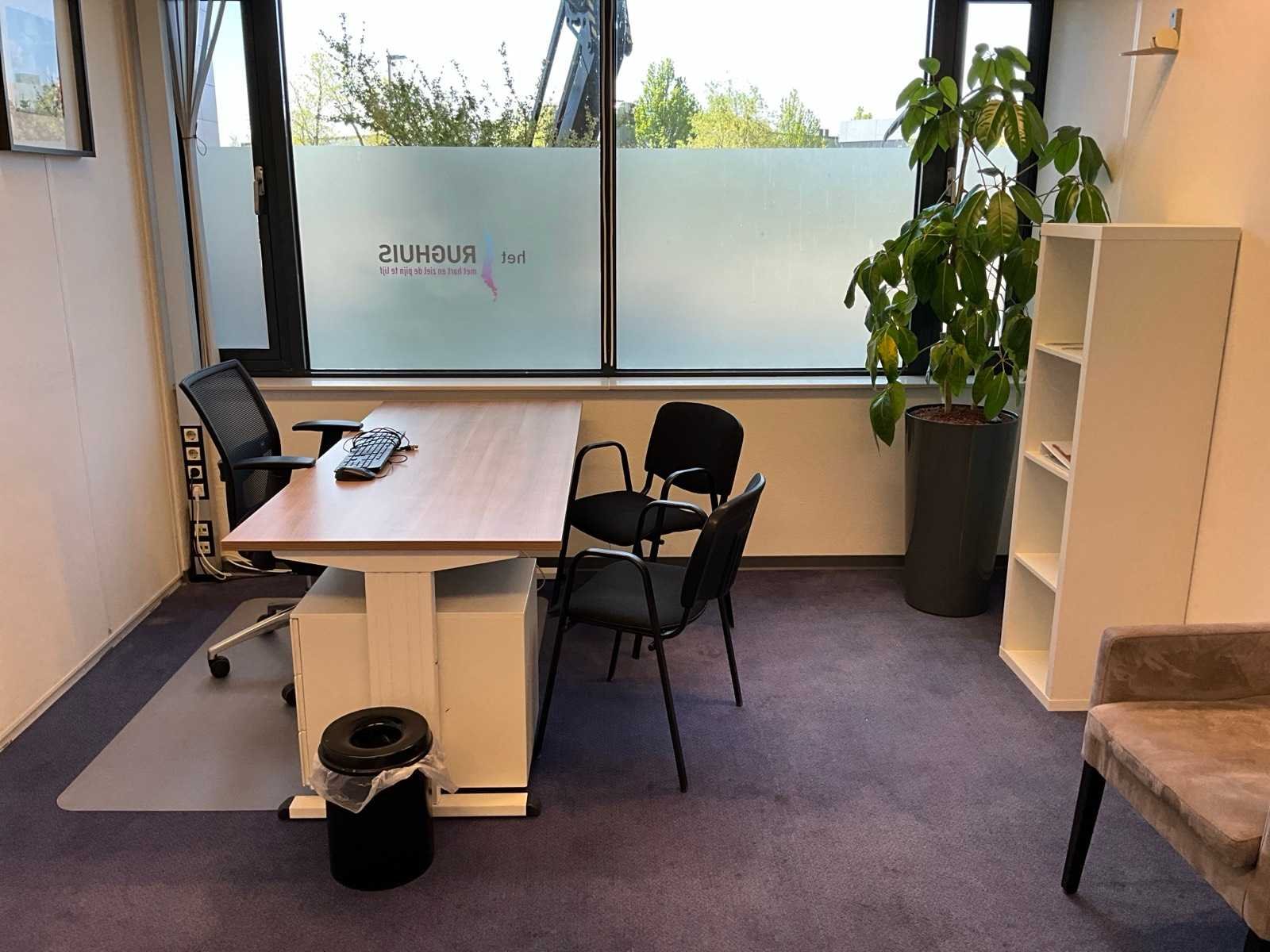 Bestaande uit inhoud kantoorruimte voorzien van onder andere: bureautafel 80x160cm in hoogte verstelbaar, ladeblok, bureaustoel, 2x vergaderstoel, De Arend eetkamerstoel, vakkenkast, hydrocultuurplant in pot, bijzettafel, kapstok en whiteboard 90x120cm (wandgemonteerd), verrijdbare kruk, behandeltafel 65x200cm, etc