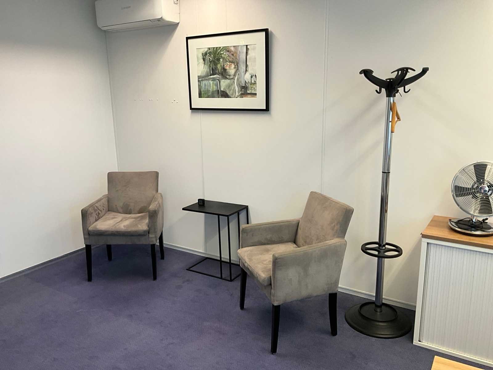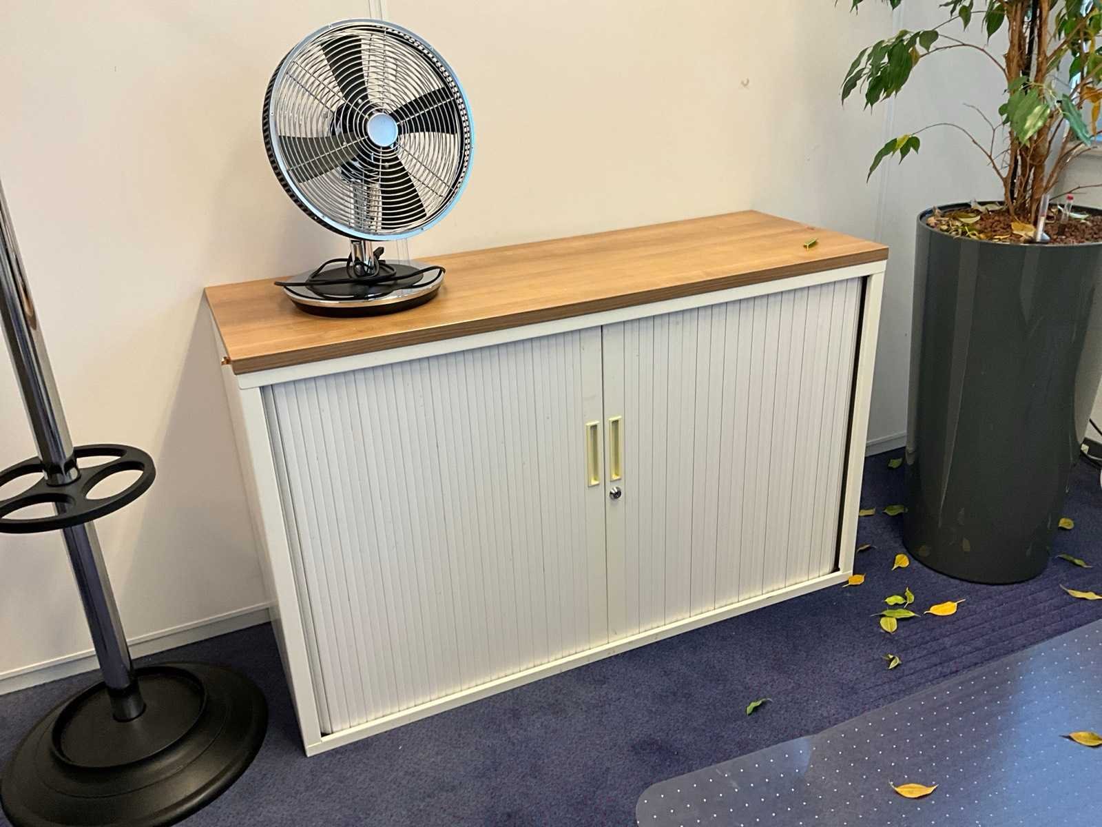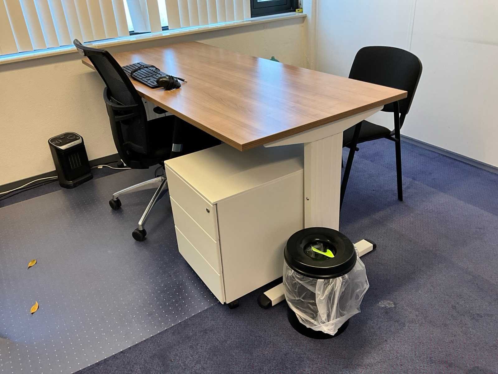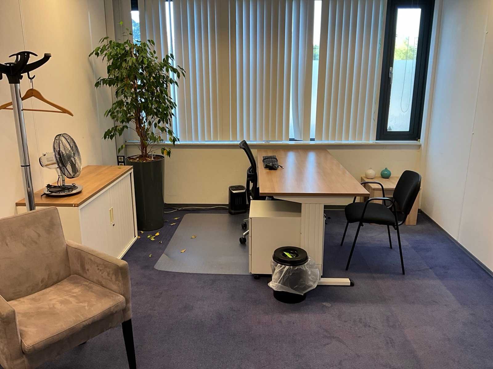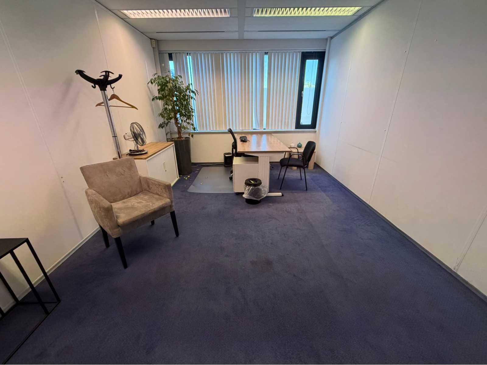 Bestaande uit inhoud kantoorruimte voorzien van onder andere: bureautafel 80x160cm in hoogte verstelbaar, ladeblok, bureaustoel, 2x De Arend eetkamerstoel, roldeurkast H75xB120xD44cm, hydrocultuurplant in pot, 2x bijzettafel, kapstok en whiteboard 90x120cm (wandgemonteerd), wanddecoratie, 1x vergaderstoel