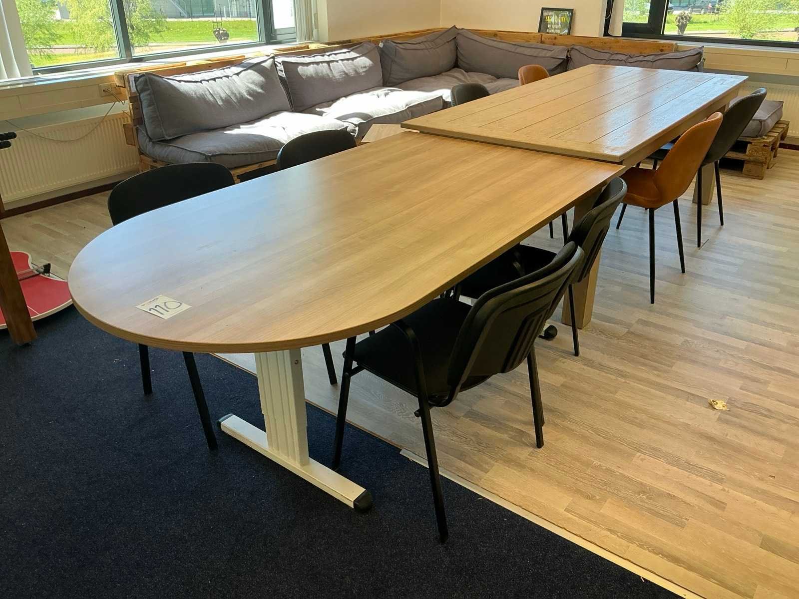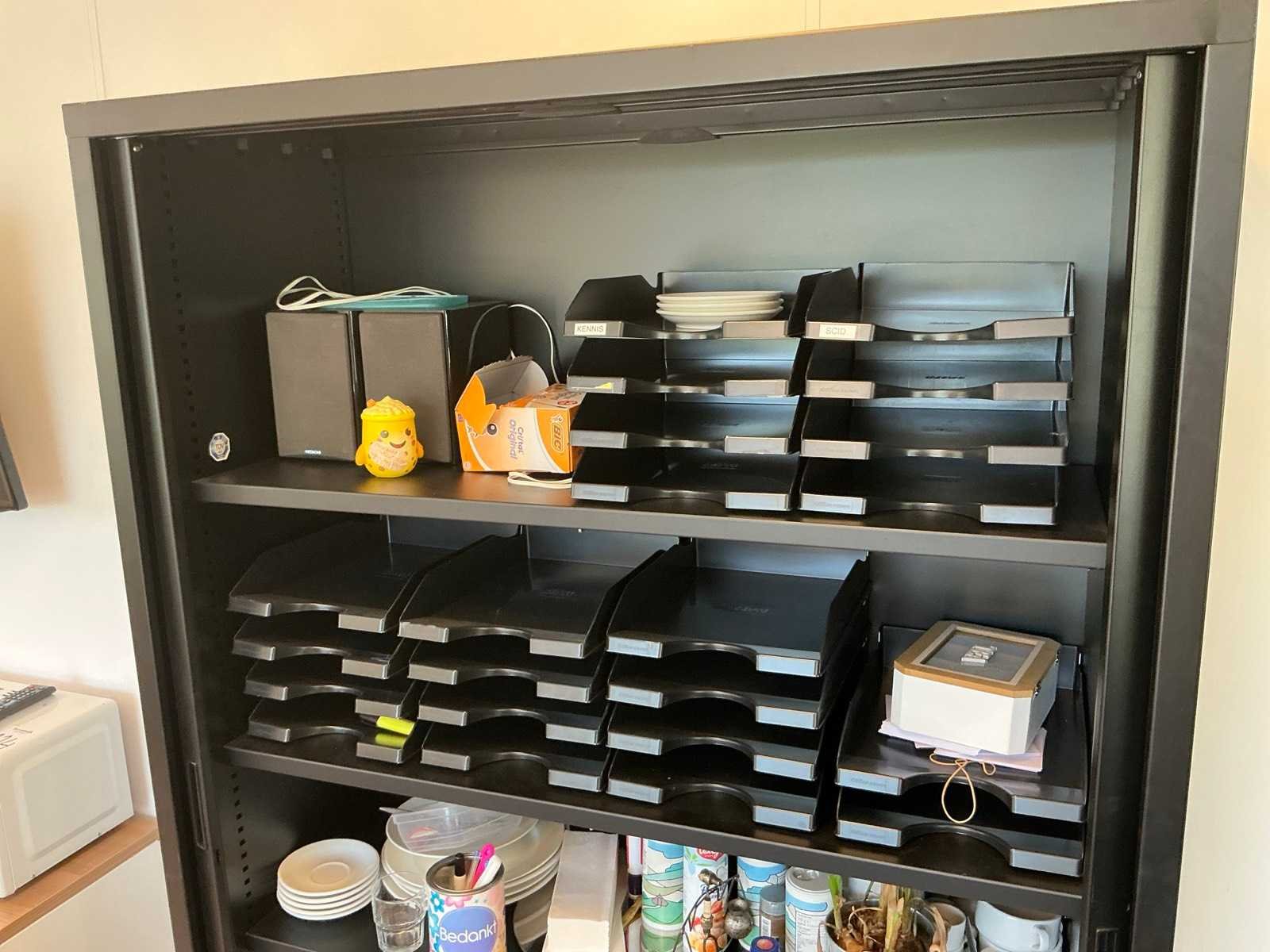 Bestaande uit 2x tafel waaronder (LxBxH:2200x1000x790mm) , 8 kantine stoelen, 2x dossierkast, wit (LxBxH:430x1200x750mm) en zwart (LxBxH:430x1200x1980mm) met inhoud. 3x prullenbak. Let op! Artikelen op witte dossierkast zijn niet inbegrepen.