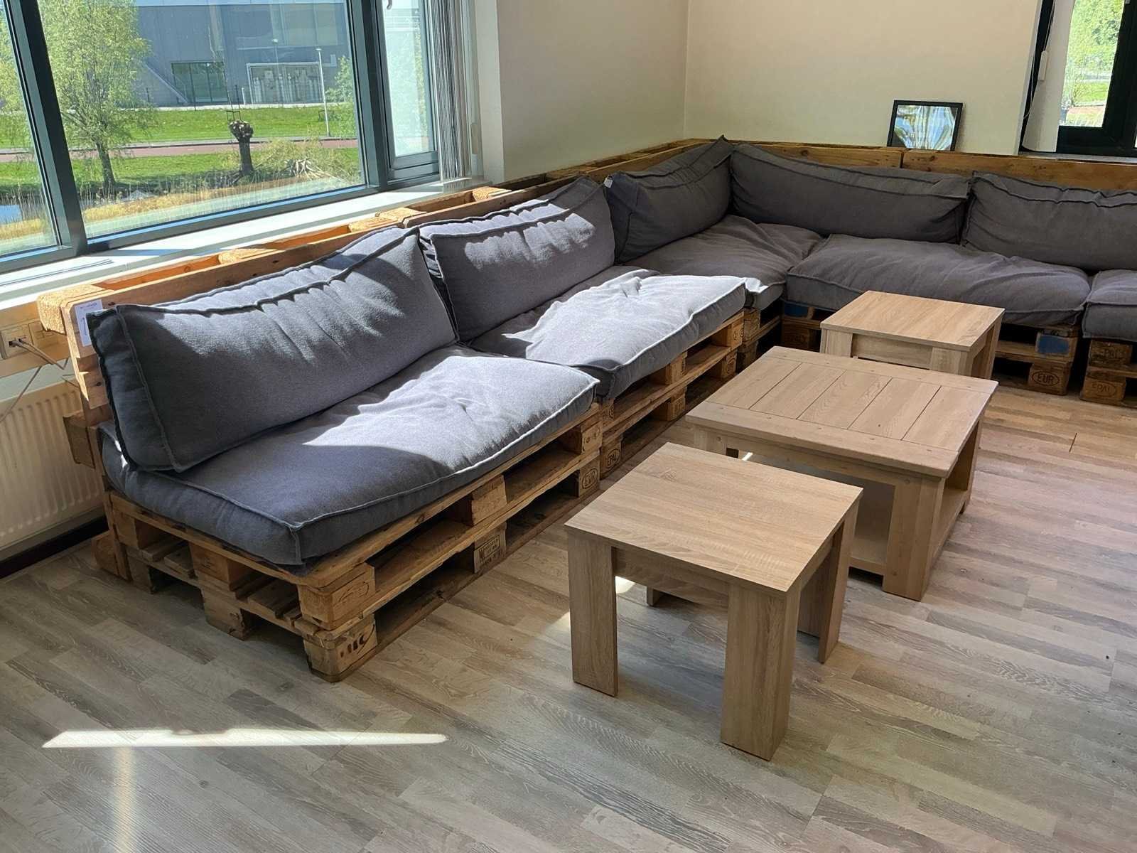 Bestaande uit L bankopstelling van pallets met kussens, en 3x tafel Lengte: 380cm Breedte: 340cm Hoogte: 80cm