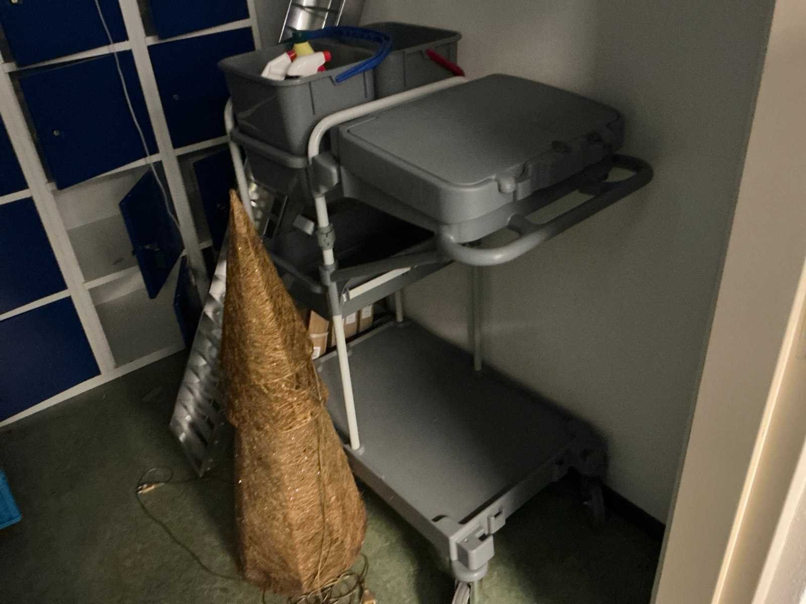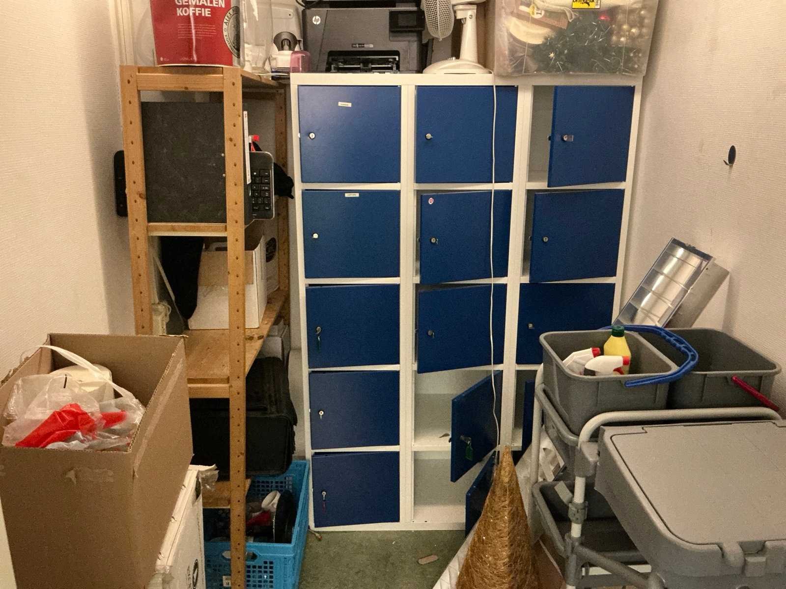 Bestaande uit inhoud ruimte waaronder: lockerkast, stellingkast, schoonmaakwagen, printer, ventilator en decoratie