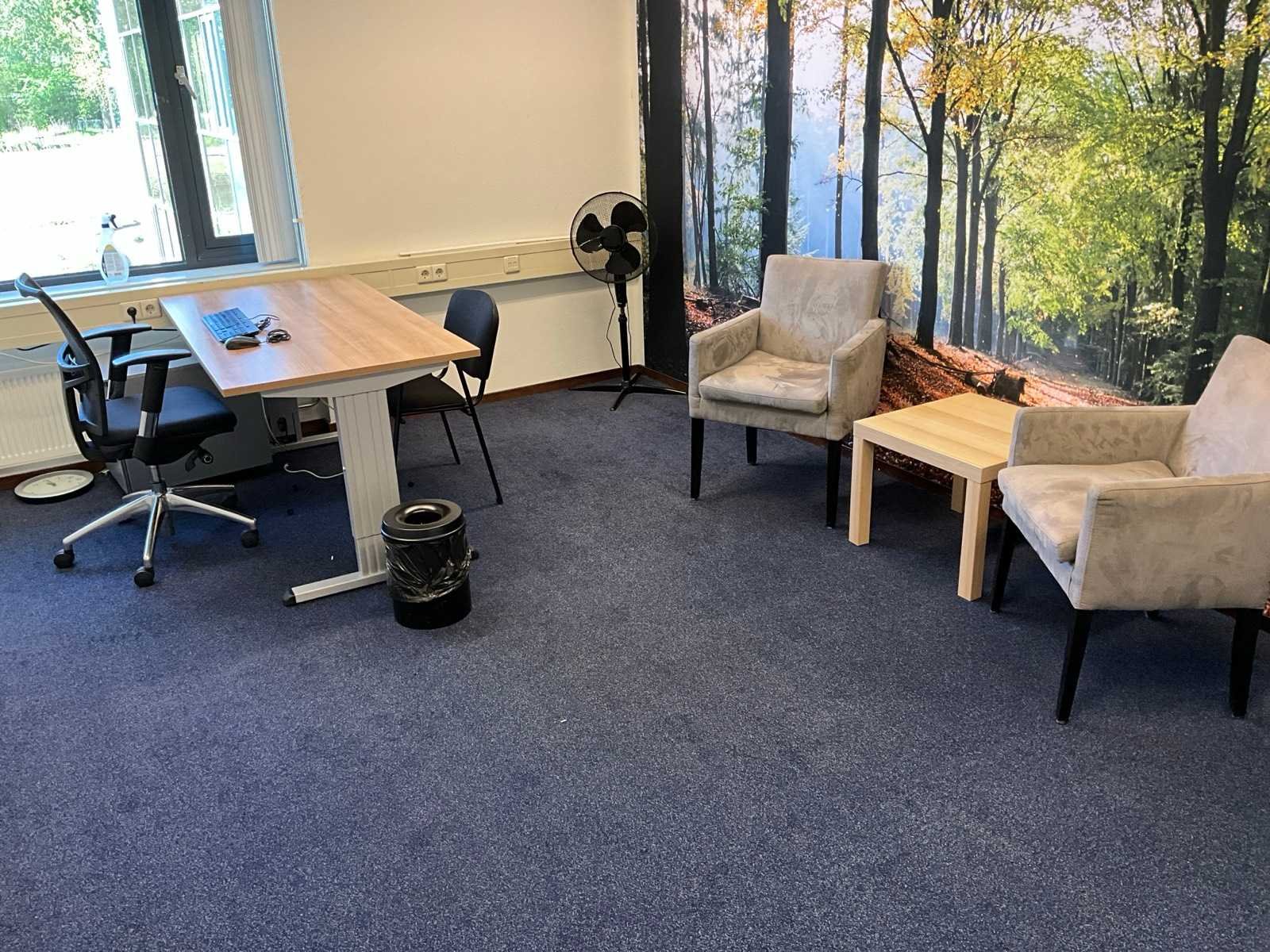 Bestaande uit inhoud kantoorruimte voorzien van onder andere: Bureau (LxBxH:800x1600:760mm), 1x bureaustoel, 2x wachtkamer stoel met tafel, kantinestoel, dossierkast, peesdoek (LxH:5150x2530mm) ventilator en whiteboard.