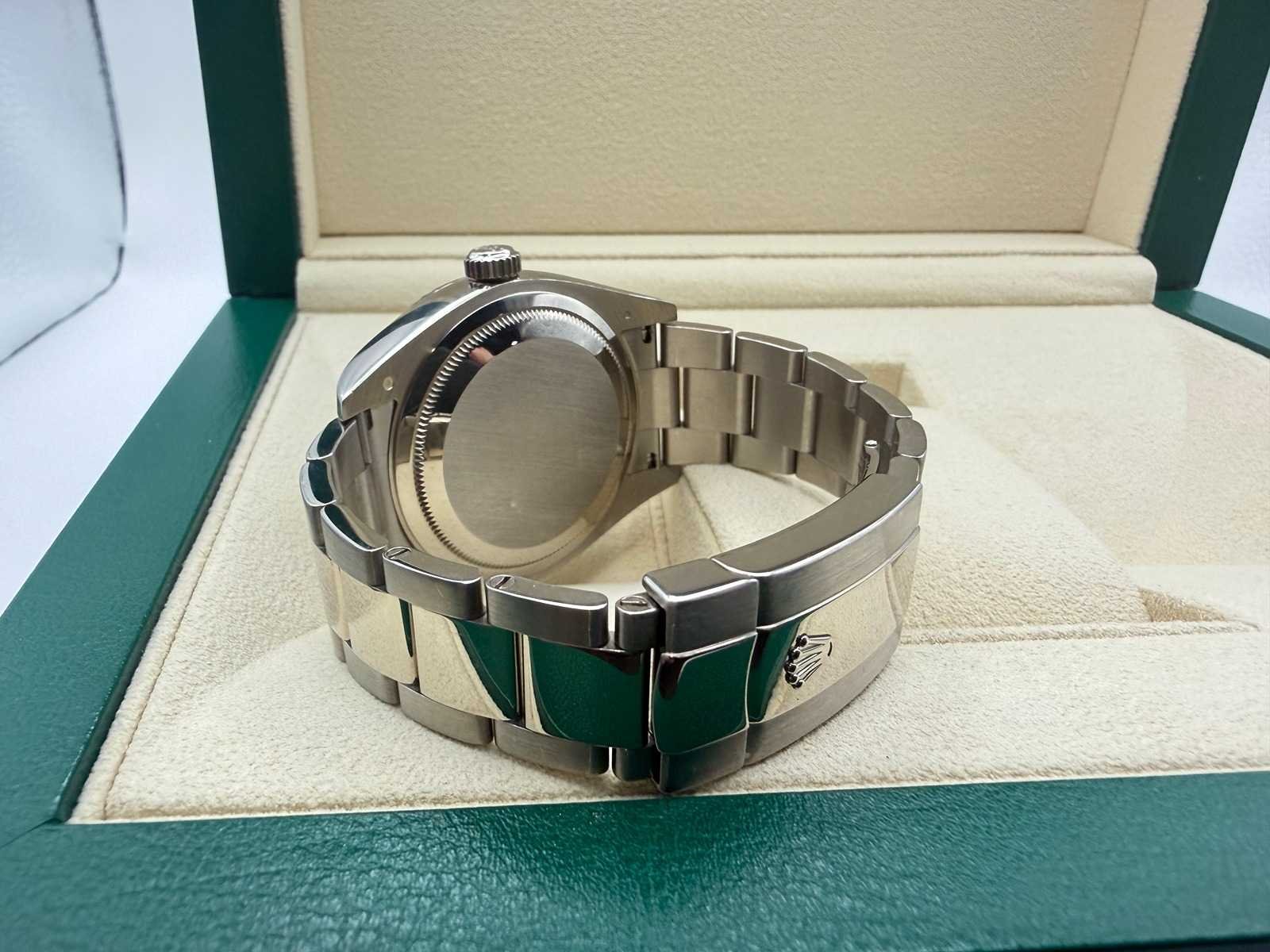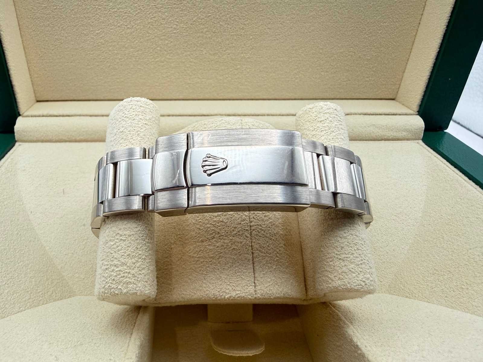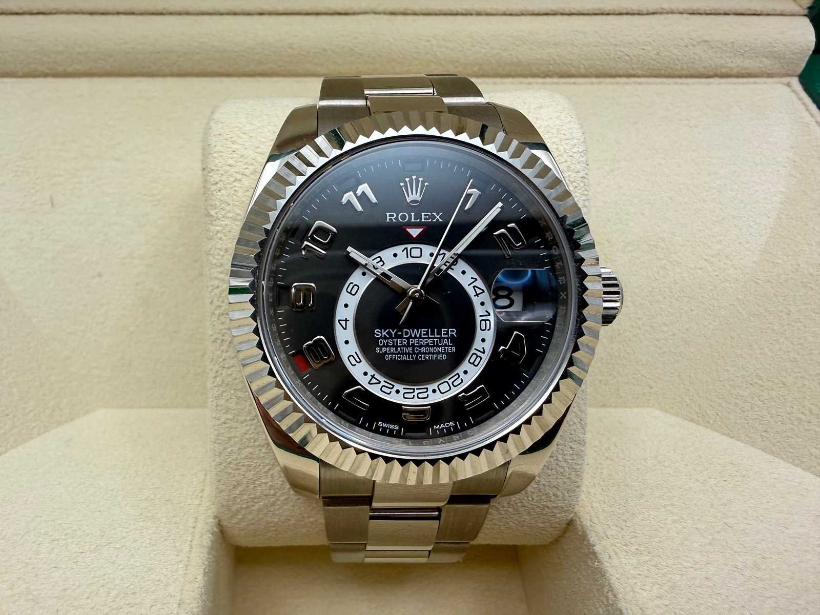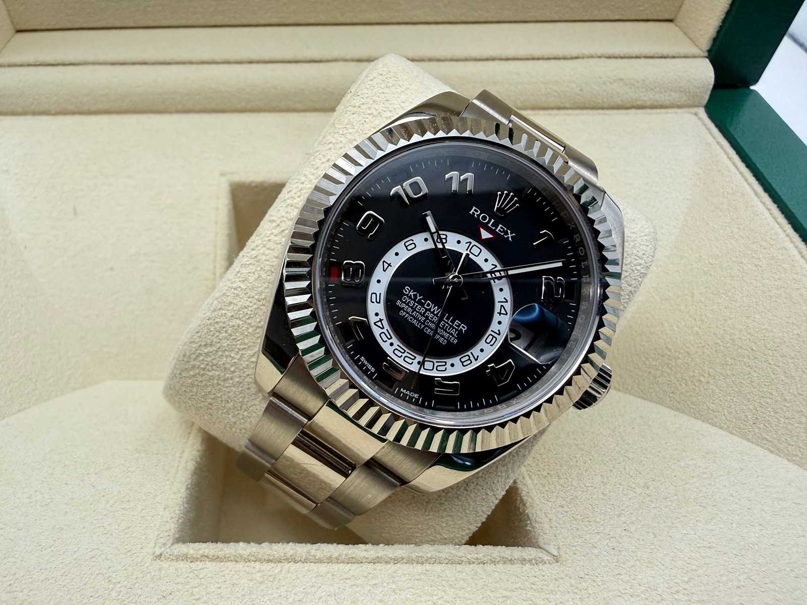 Key Highlights: Model: Rolex Sky-Dweller Reference: 326939 Year: 12/2015 Condition: Like new Case: 18k white gold Dial: Black Bezel: Fluted white gold bezel Bracelet: White gold Oyster bracelet Functions: Annual calendar & dual time zone Movement: Automatic Rolex manufacture movement Set: Full set with box, papers, warranty card & tag A refined and powerful Rolex, combining full white gold construction with a clean black dial—perfect for those seeking both prestige and functionality. Bezorgtermijn 3 dagen Merk: Rolex Model: Sky-Dweller Bouwjaar: 12-2015 Referentienummer: 326939 Materiaal kast: White Gold Materiaal horlogeband: White Gold Oyster Materiaal sluiting: White Gold Wijzerplaat: Black Kastmaat: 42MM