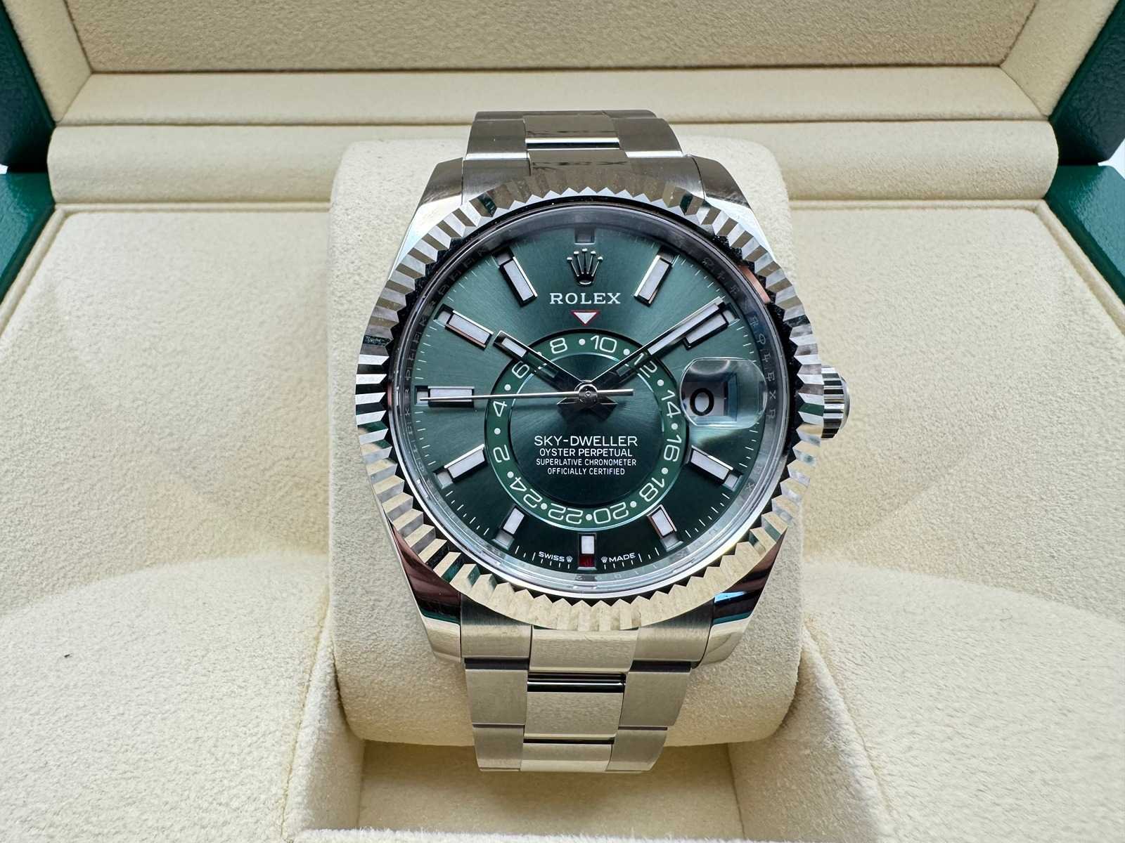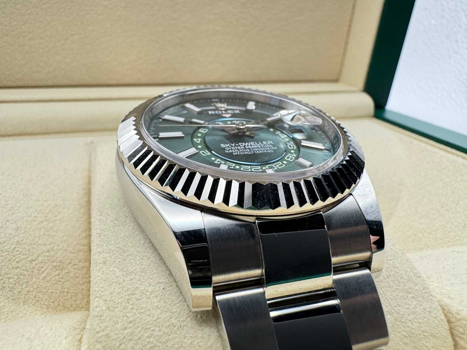 Key Features: Model: Rolex Sky-Dweller Reference: 336934 Condition: Brand new, unworn Material: Stainless steel Dial: Green Bracelet: Oyster Functions: Dual time zone, annual calendar, month and date display Movement: Automatic, Rolex Caliber 9002 Warranty: 5-year international Rolex warranty Set: Full set – Rolex box, warranty card, booklets, and cardholder A true collector’s piece – the green dial Sky-Dweller has become one of the most coveted modern Rolex watches. Bezorgtermijn 14 dagen Merk: Rolex Model: Skydweller Bouwjaar: 2026 Referentienummer: 336934 Materiaal kast: Steel / White Gold Materiaal horlogeband: Steel Materiaal sluiting: Steel Wijzerplaat: Mint Green Kastmaat: 42 mm