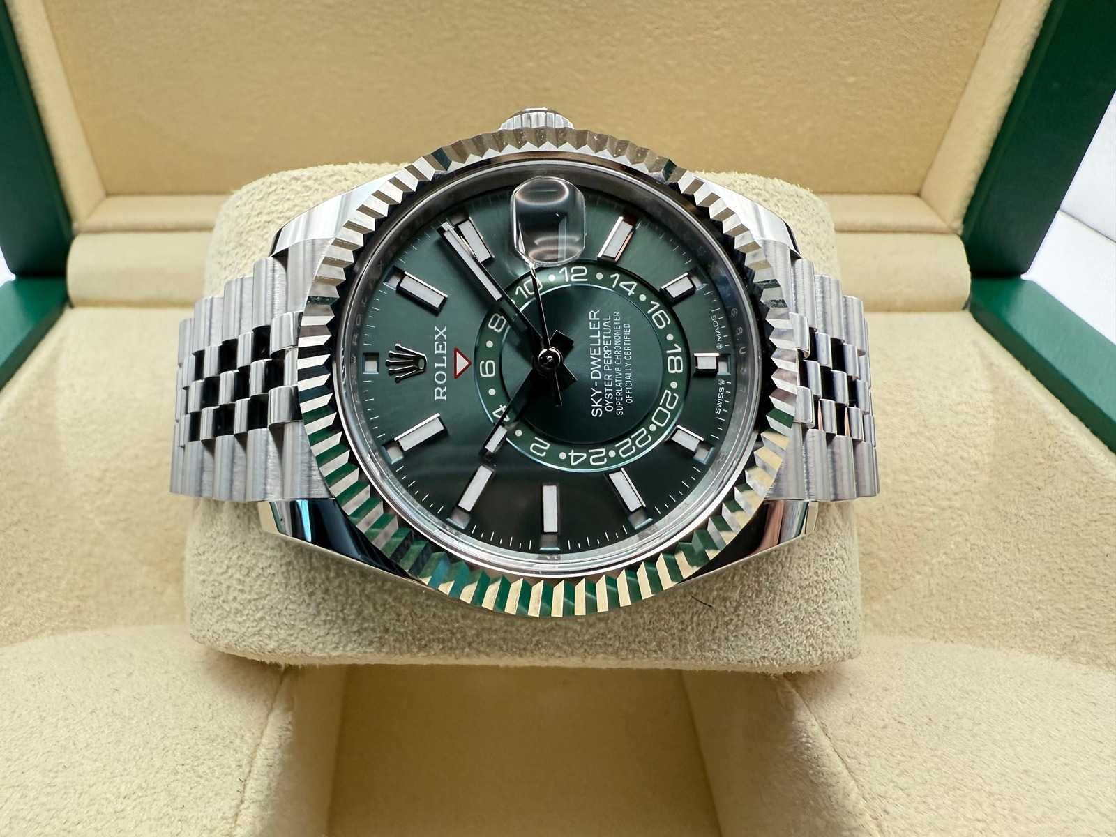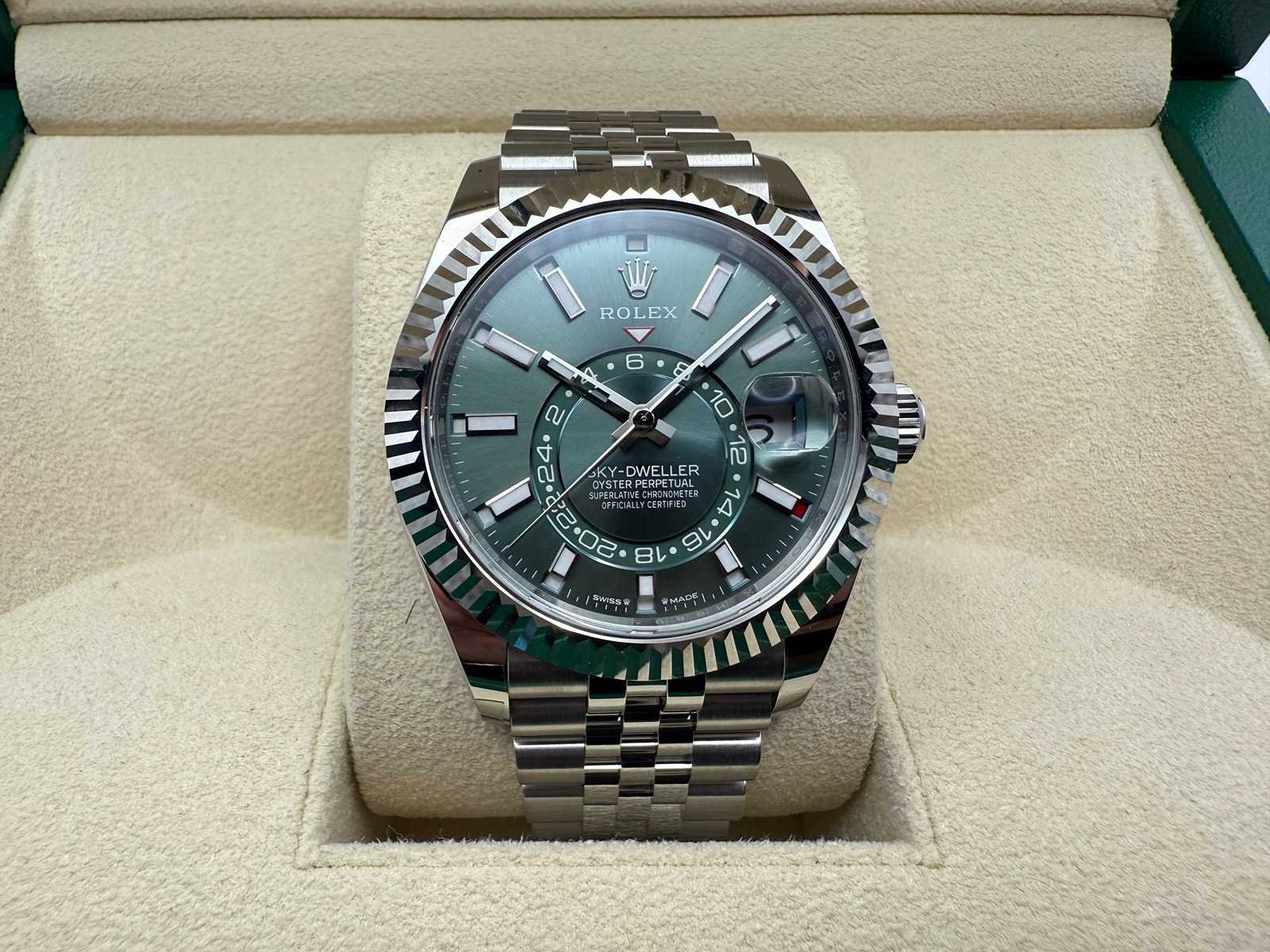 Key Features: Model: Rolex Sky-Dweller Ref. 336934 Condition: Brand new, unworn, with full factory stickers Year: 2025 Material: Stainless steel with white gold bezel Dial: Green Bracelet: Jubilee Full set: Includes box, papers, warranty card, and Rolex tag International Rolex Warranty until 2030 Bezorgtermijn 14 dagen Merk: Rolex Model: Skydweller Bouwjaar: 2026 Referentienummer: 336934 Materiaal kast: Steel / White gold Materiaal horlogeband: Steel Jubilee Materiaal sluiting: Steel Wijzerplaat: Mint Green Kastmaat: 42 mm