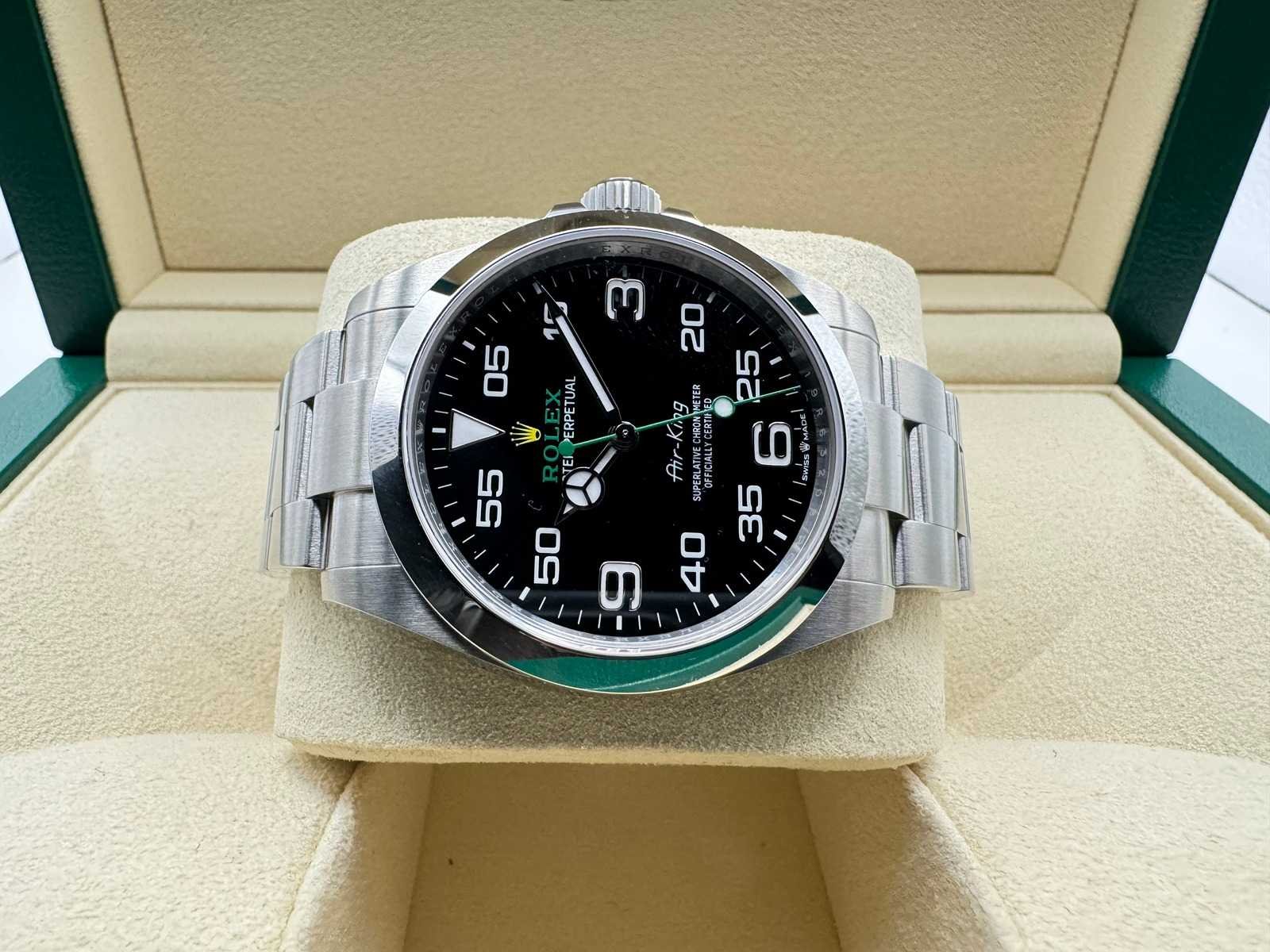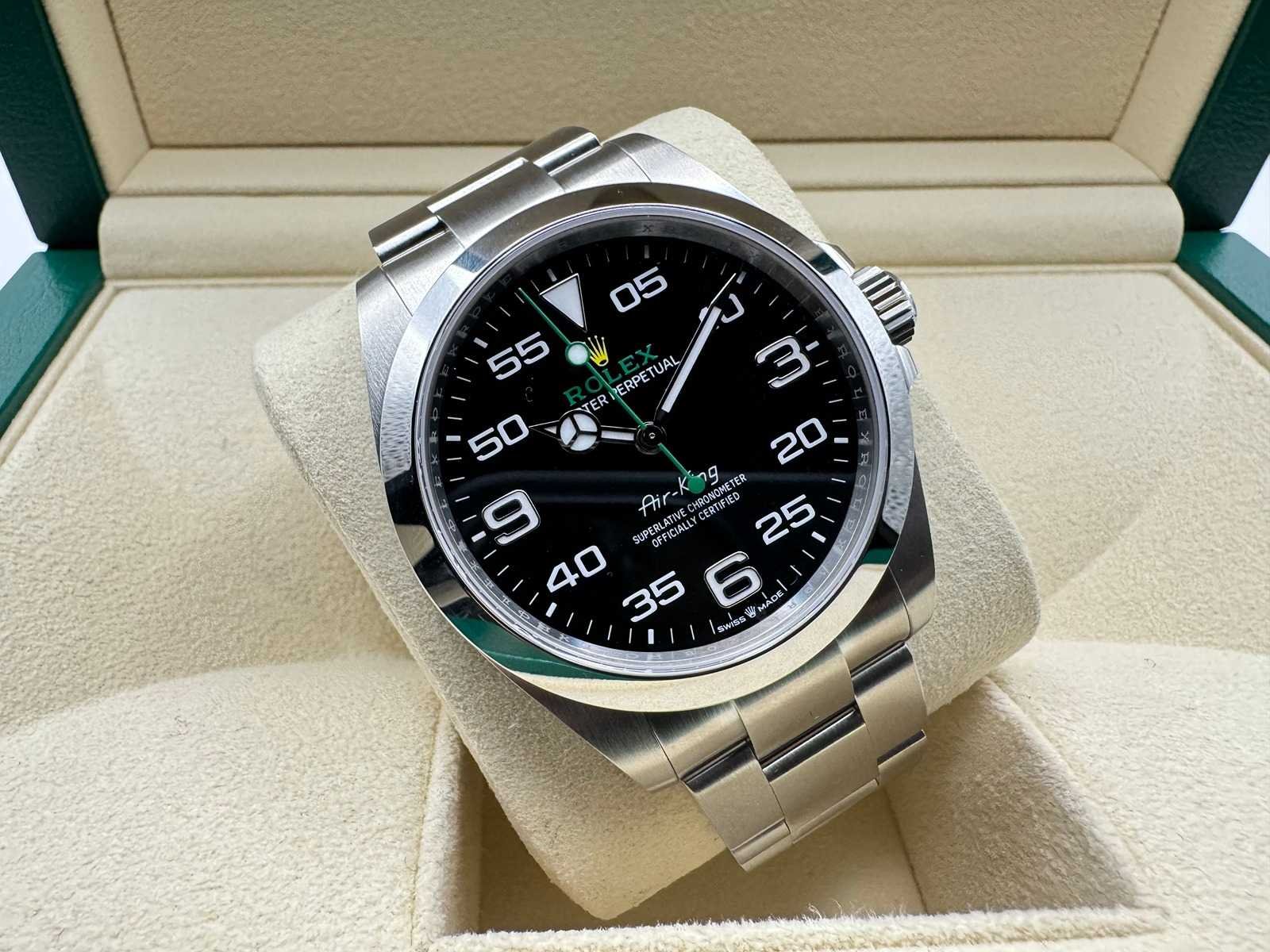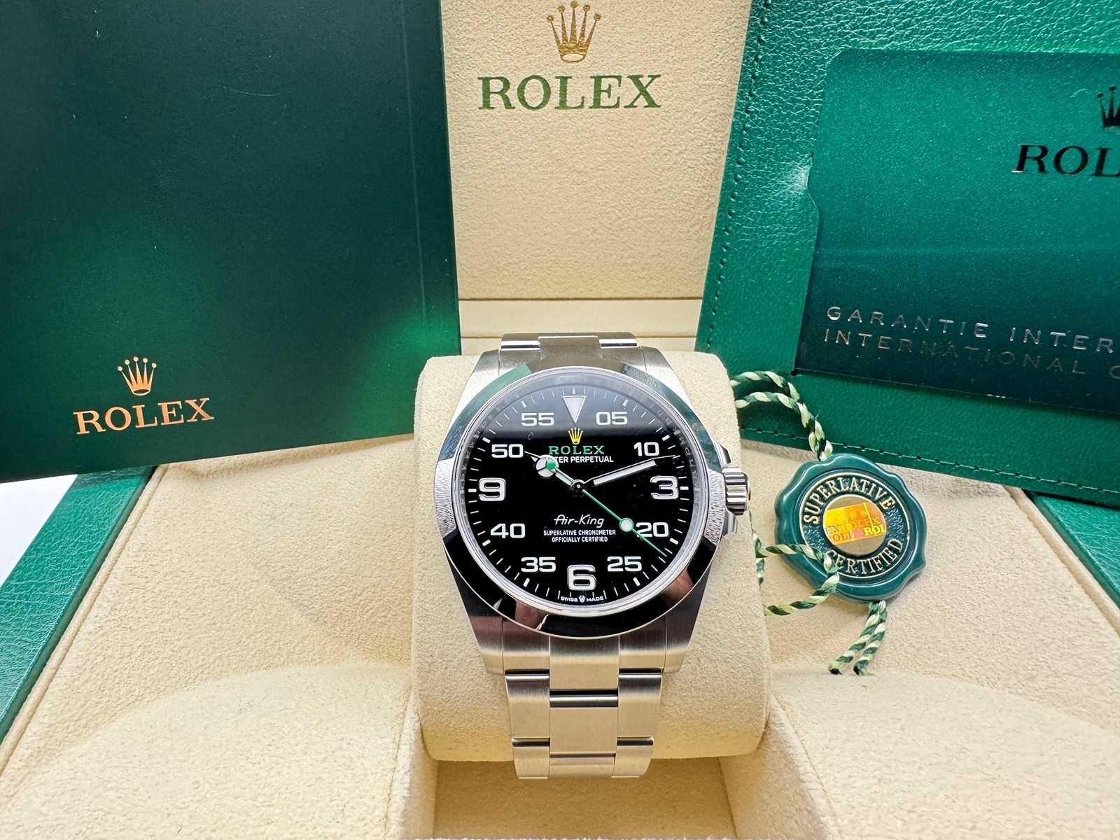 Air-King (Ref. 126900) – Brand New, Full Set, 5-Year Warranty Presenting the brand new Rolex Air-King (Reference 126900), a modern tribute to aviation heritage and Rolex’s precision engineering. Crafted from durable stainless steel, this timepiece features a bold black dial with distinctive markers, combining functionality and style. This Air-King is offered as a full set, including all original packaging and documentation, and is covered by Rolex’s 5-year international warranty. Condition: Brand new, unworn Set: Complete – original box, Rolex warranty card, booklets, leather pouch, and Rolex tag Model: Air-King (Ref. 126900) Features: Stainless steel case and bracelet Black dial with striking minute and hour markers Smooth bezel for a streamlined look Engineered for precision and durability Warranty: Full 5-year international Rolex warranty The Rolex Air-King Ref. 126900 is the perfect blend of Rolex tradition and contemporary design, making it an ideal choice for everyday wear or as a standout piece in any collection. Backed by Rolex’s 5-year warranty, this timepiece offers both style and peace of mind. Merk: Rolex Model: Airking Bouwjaar: 2026 Referentienummer: 126900 Materiaal kast: Steel Materiaal horlogeband: Steel Materiaal sluiting: Steel Wijzerplaat: Black Kastmaat: 40 mm