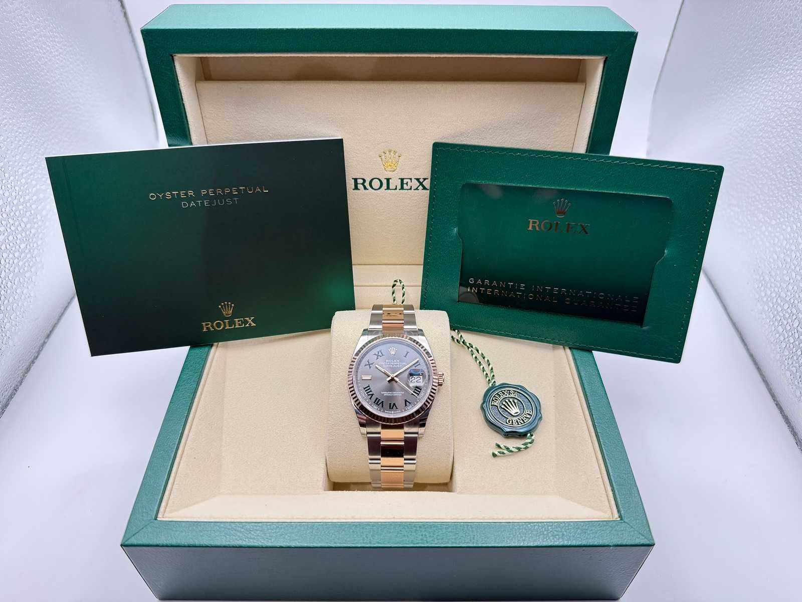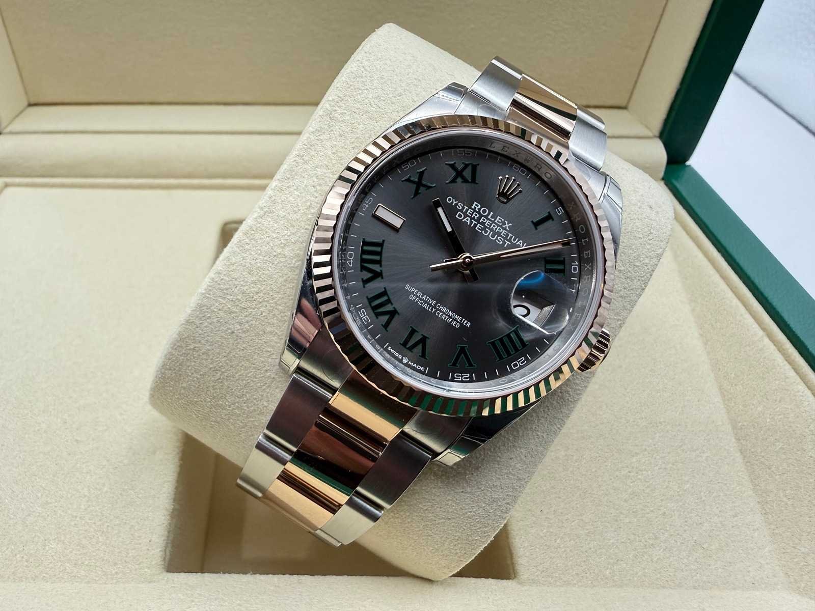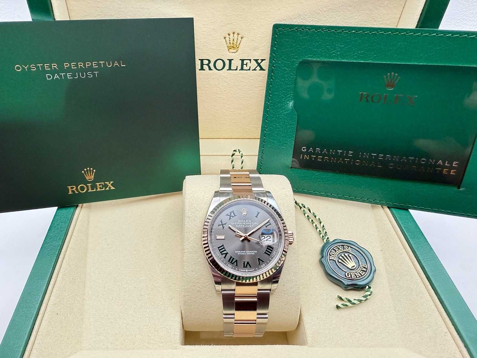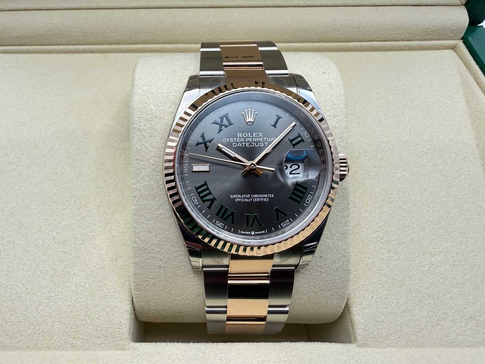 Key Features – Rolex Datejust 36 126231 Wimbledon Dial (Oyster, Unworn 2026) ⌚ Model: Rolex Datejust 36 – Ref. 126231 Year: 2026 Condition: Unworn Case Size: 36 mm Case Material: Oystersteel & 18k Everose Gold (Rolesor) Bezel: 18k Everose Gold fluted bezel Dial: Iconic Wimbledon dial (rhodium with green Roman numerals) Crystal: Scratch-resistant sapphire crystal with Cyclops date magnifier Movement: Rolex Caliber 3235 (automatic, COSC-certified chronometer) Power Reserve: Approx. 70 hours Water Resistance: 100 meters / 330 ft Bracelet: Oyster bracelet (sporty and robust) Clasp: Oysterclasp with Easylink comfort extension Functions: Hours, minutes, seconds, date Bezorgtermijn 14 dagen Merk: Rolex Model: Datejust 36 Bouwjaar: 2026 Referentienummer: 126231 Materiaal kast: Steel / Rose Materiaal horlogeband: Steel / Rose Oyster Fluted Materiaal sluiting: Steel / Rose Wijzerplaat: Wimbledon Kastmaat: 36 MM
