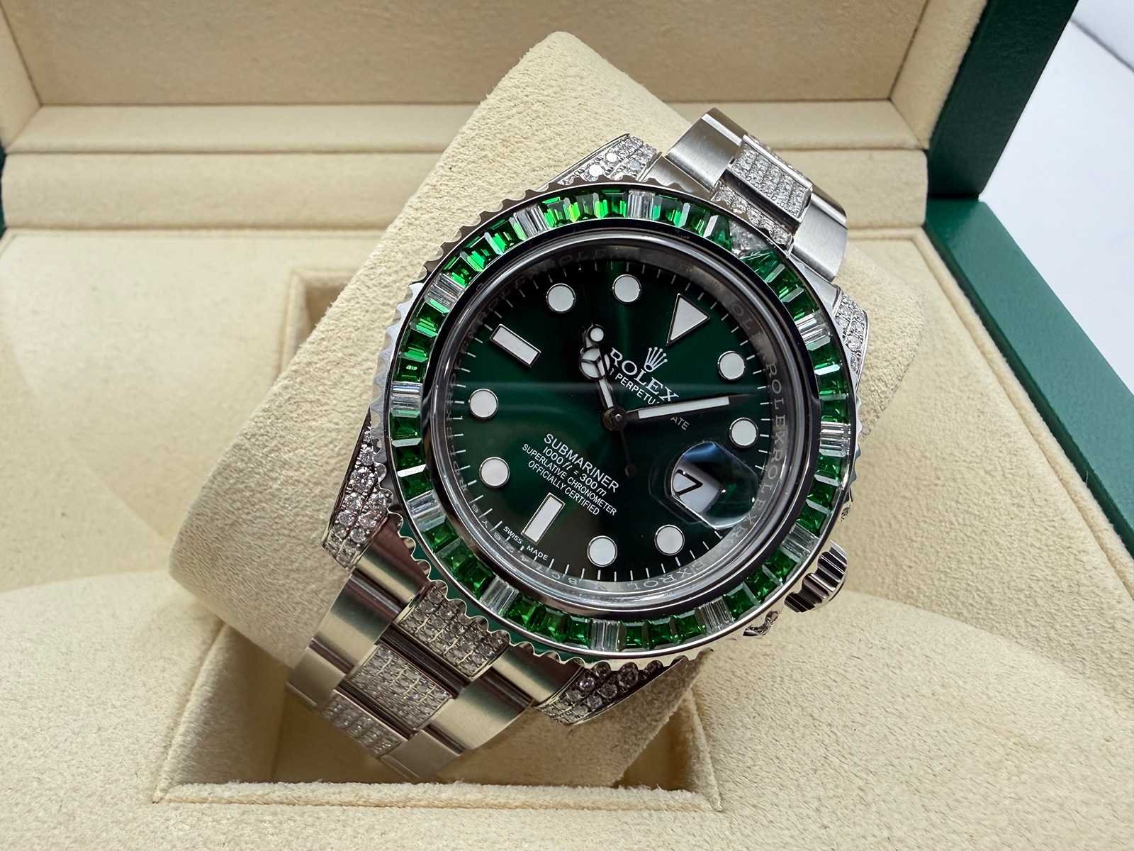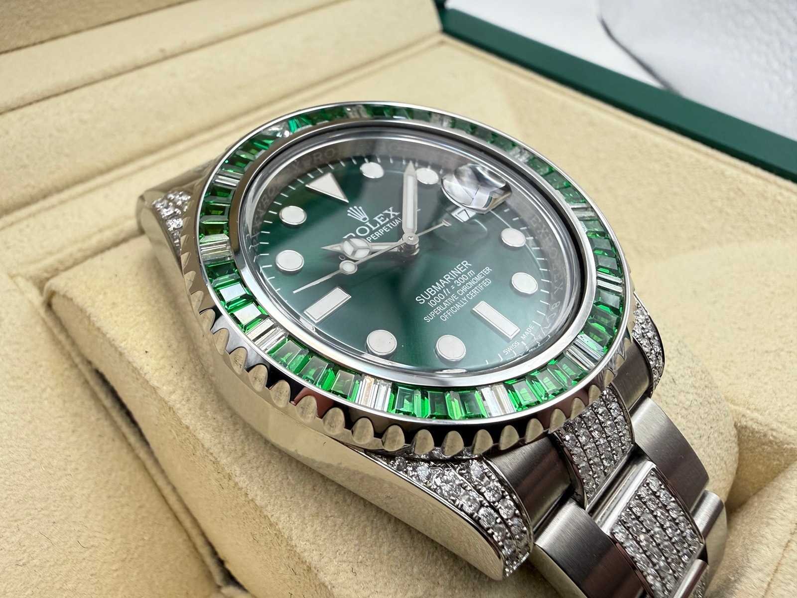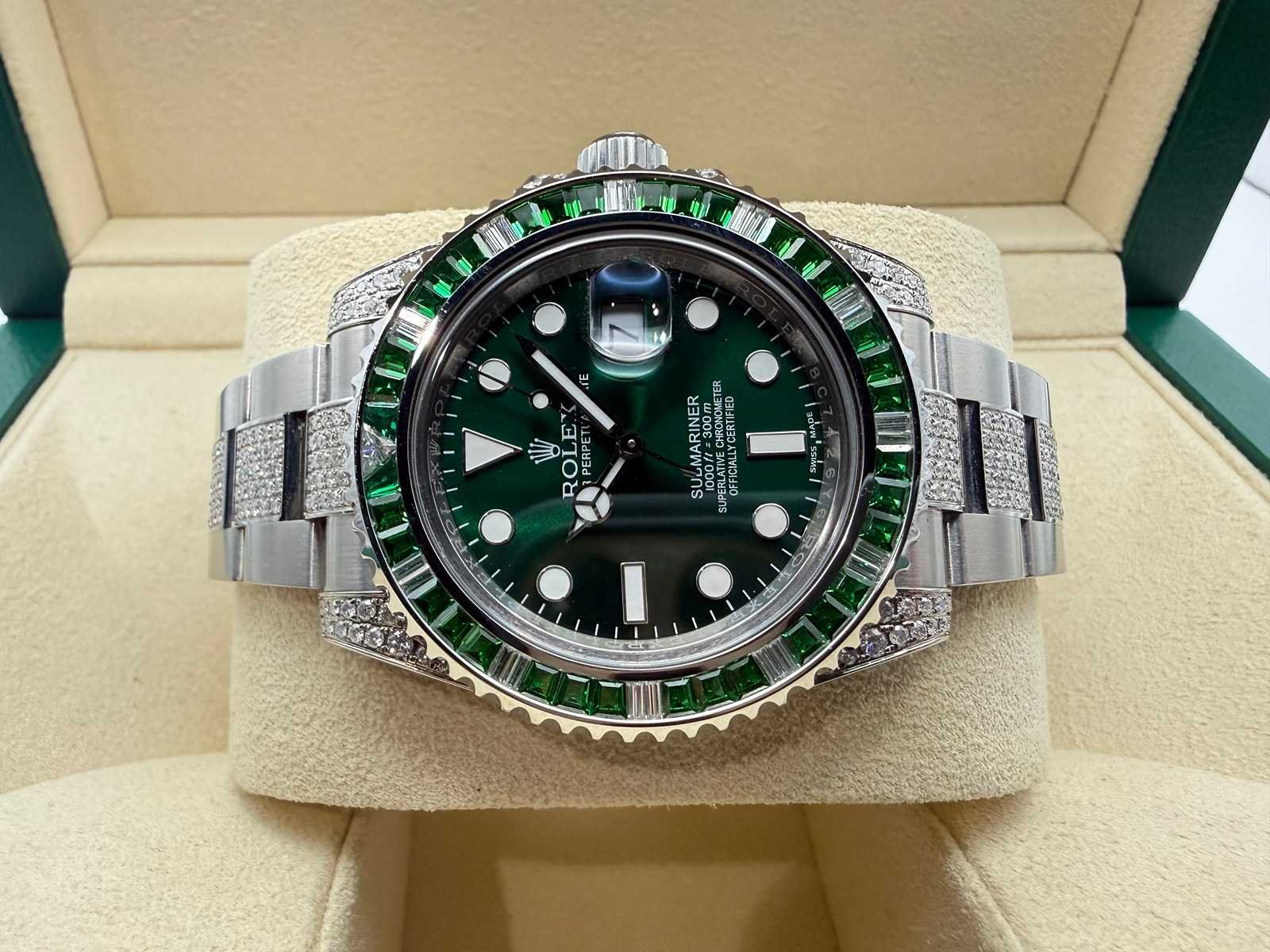 Key Features: Model: Rolex Submariner Date Reference: 116610LN Year: 2018 Condition: Excellent Diamonbds: Natural Dial: Green Bracelet: Oyster (center links set with diamonds, outer links stainless steel) Bezel: Baguette diamonds Set: Comes with Rolex box, guarantee card, and tag Bezorgtermijn 14 dagen Merk: Rolex Model: Submariner Date Bouwjaar: 2018 Referentienummer: 116610LN Materiaal kast: Steel / Diamonds Materiaal horlogeband: Steel / Diamonds Materiaal sluiting: Steel / Diamonds Wijzerplaat: Green Kastmaat: 41 mm