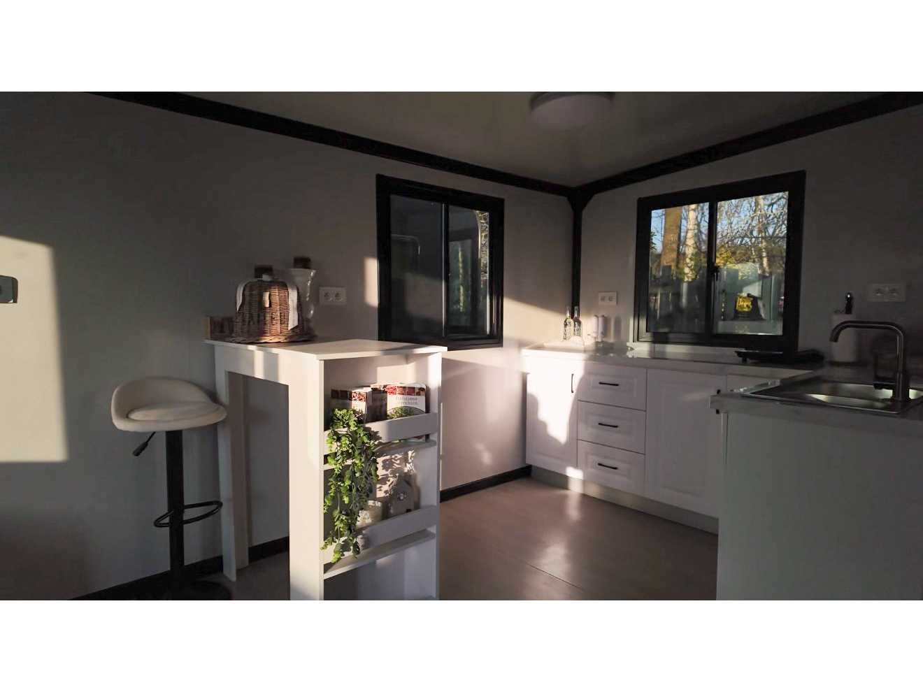 Voorzien van geïsoleerde wanden en dak; 2 slaapkamers; leefruimte met hoekkeuken; badkamer met douche, wc en wastafel; elke ruimte voorzien van verlichting en stopcontacten 230V; meterkast; PVC vloer; aluminium ramen en deuren; afsluitbaar; water, stroom en afvoer kan makkelijk aangesloten worden is voorbereid; ongebruikt en staat transport klaar (let op meubilair niet inbegrepen) (transport afmetingen 590x220x248 cm, gewicht 3100 kg) Merk: Rhino-Houses Model: 36,5 m2 Product type: 2 slaapkamers, badkamer en keuken Gewicht: 3100 Lengte: 5900 Breedte: 6200 Hoogte: 2480