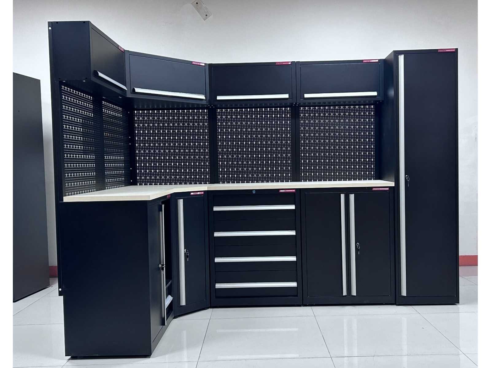 Voorzien van poeder coating; 30 mm houten werkblad; kleur zwart; ongebruikt in dozen (transport afmeting 1,9 m3) Merk: Stahlworks Model: TC-204 Product type: 155x55x203 / 280x55x203 cm Materiaal: SPCC steel