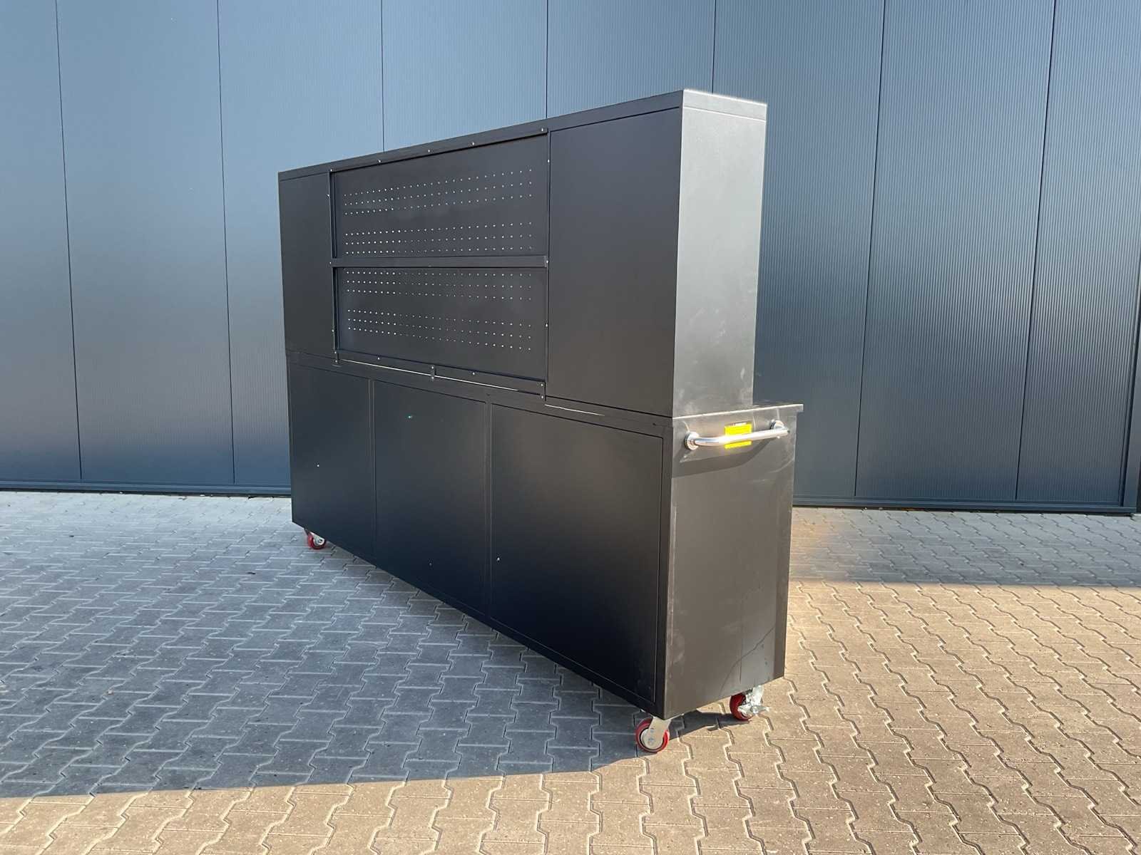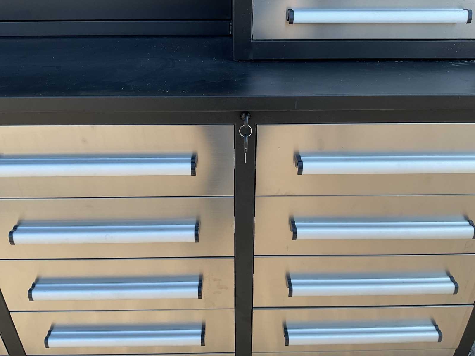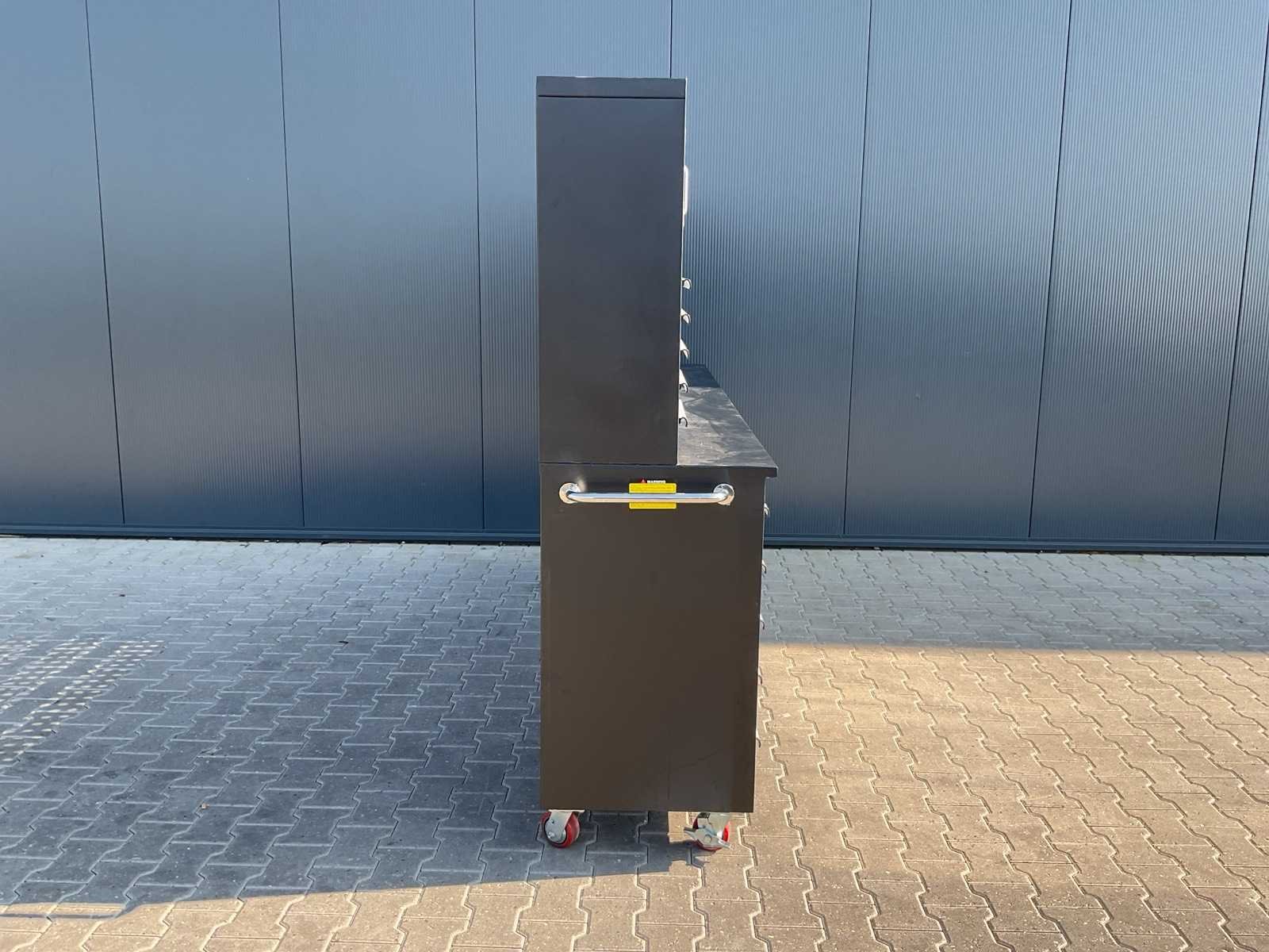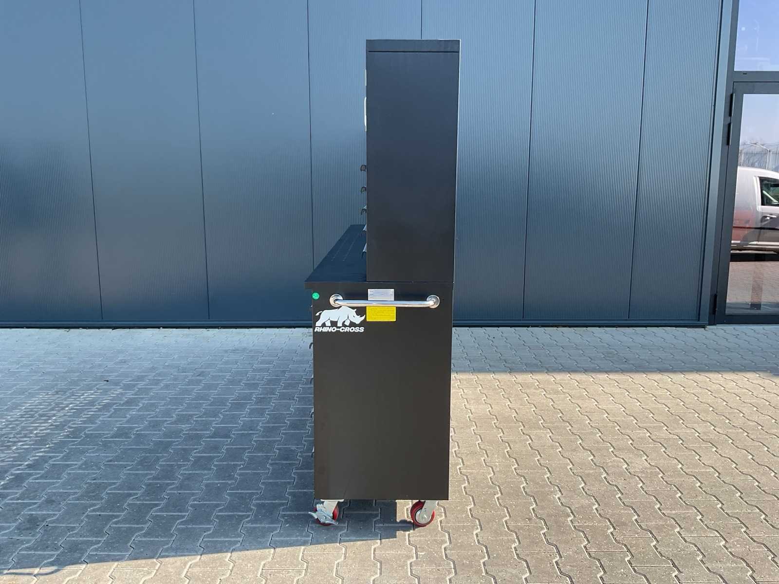 Merk: Rhino Cross Model: H10FT-35D-2-01C-01 Type: Industriële werkbank / gereedschapskast Materiaal: Gepoedercoat staal Kleur: Zwart Aantal laden: 35 Aantal kastdeuren: 2 Breedte: ca. 287 cm Diepte: ca. 58,5 cm Hoogte: ca. 205 cm Merk: Rhino Cross Model: H10FT-35D-2-01C-01