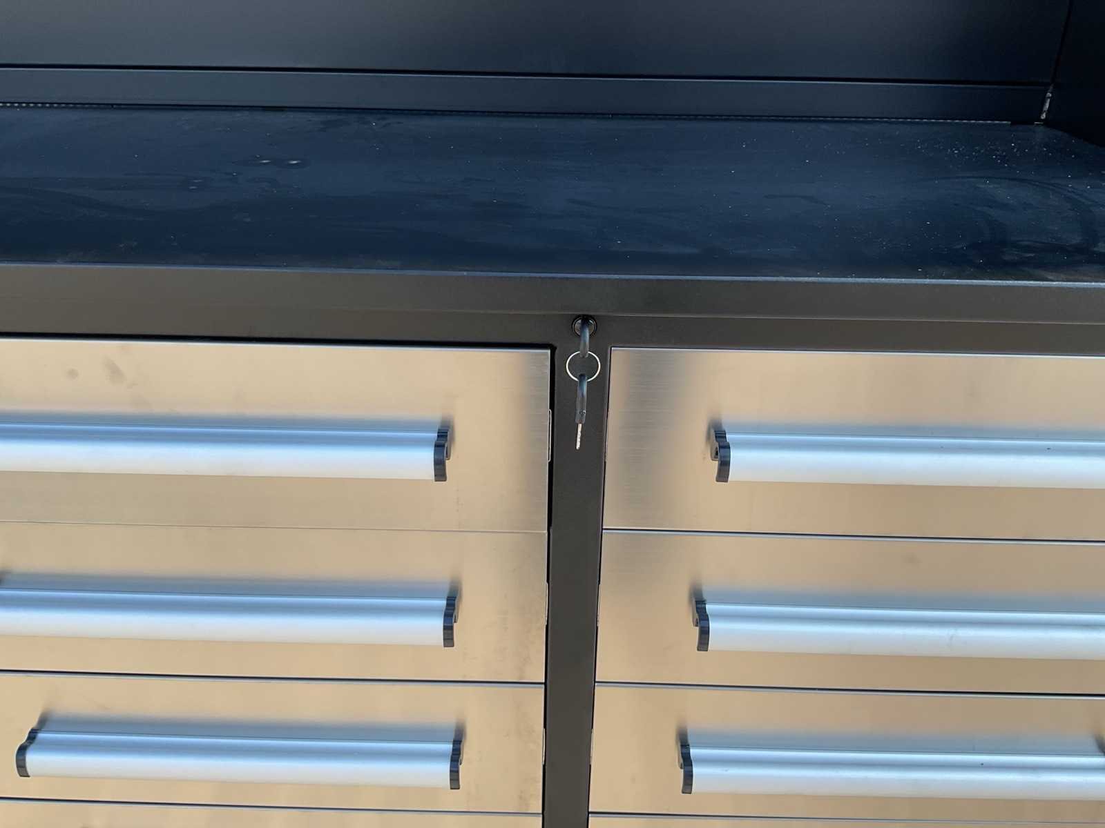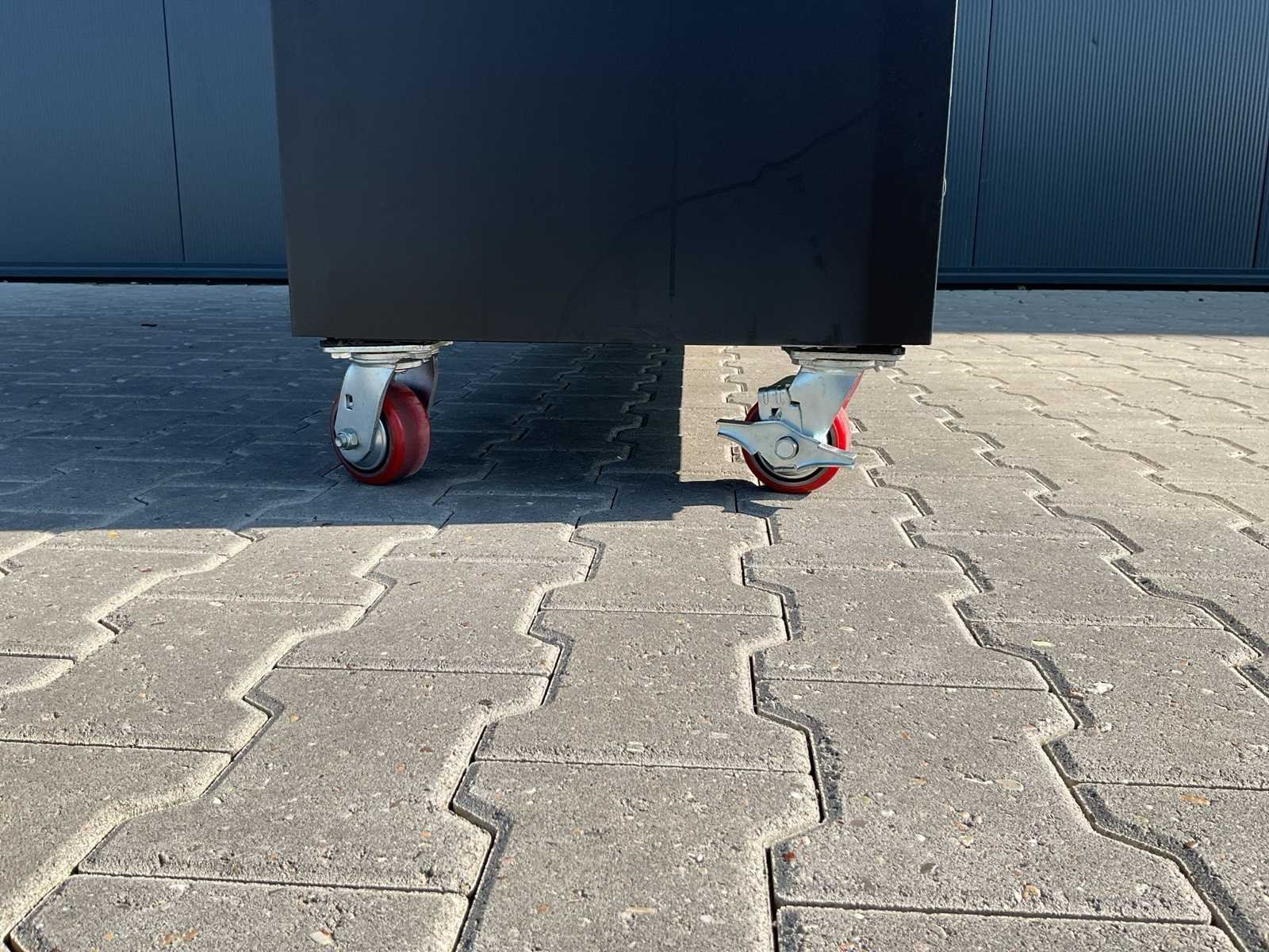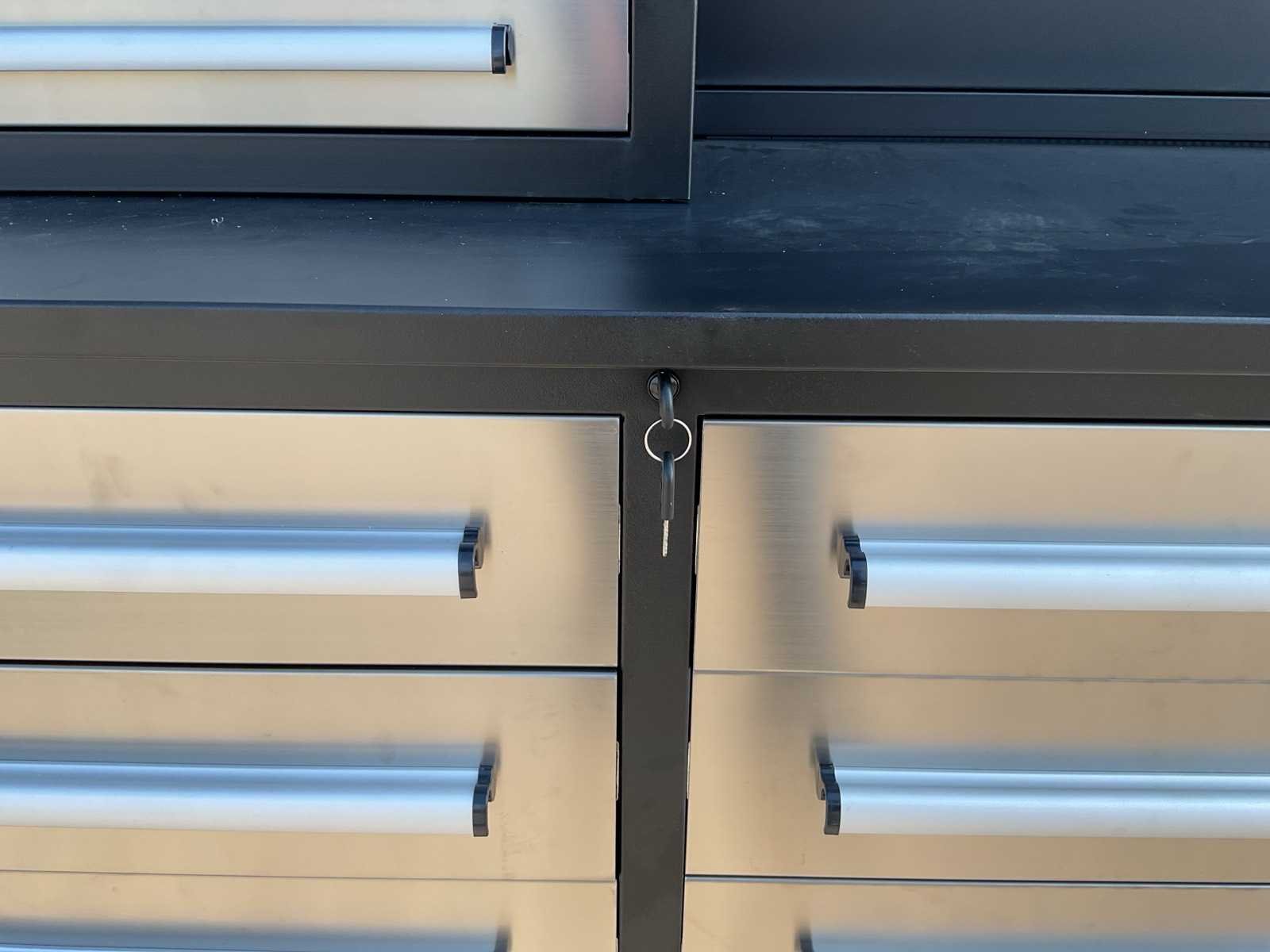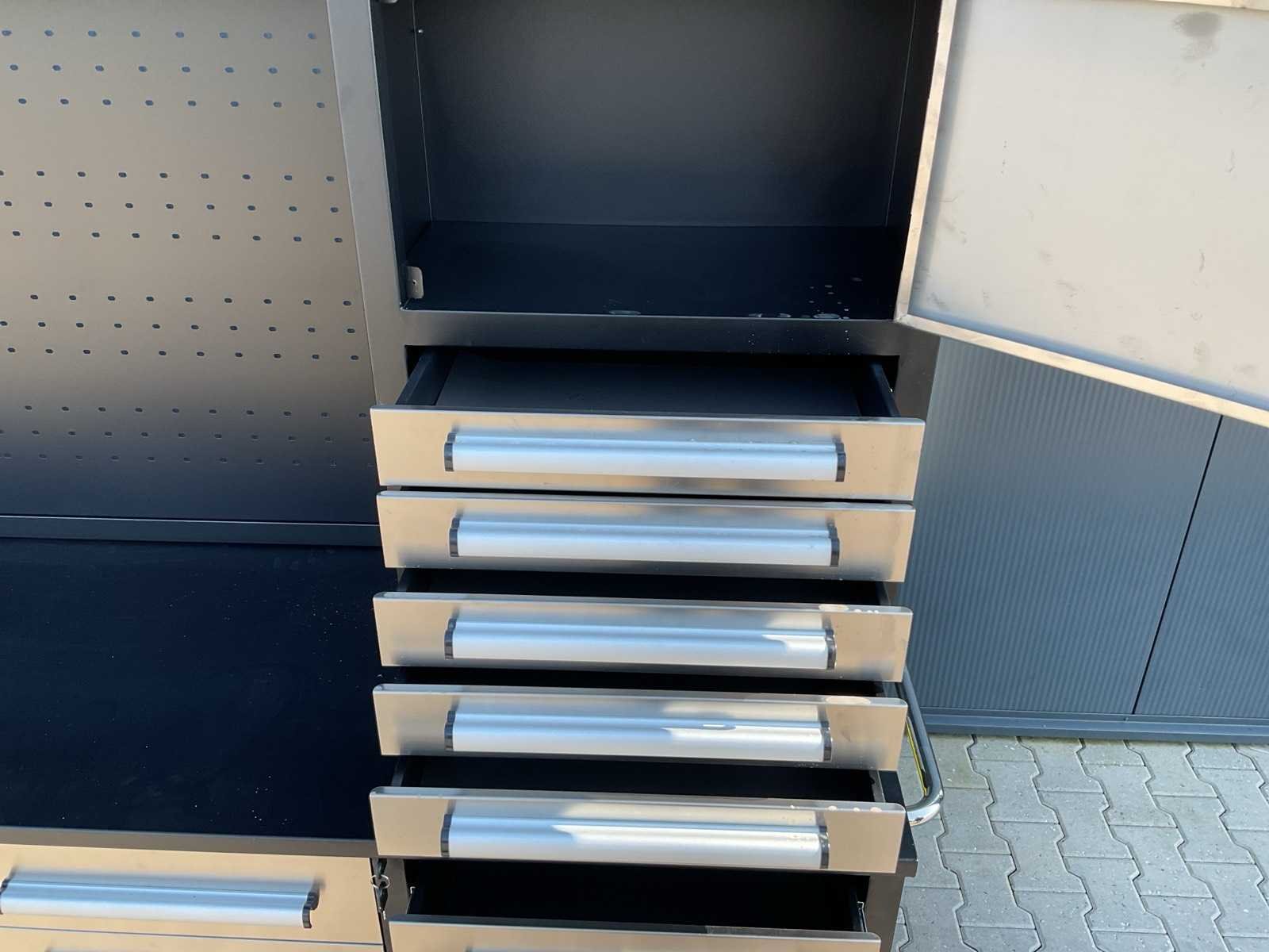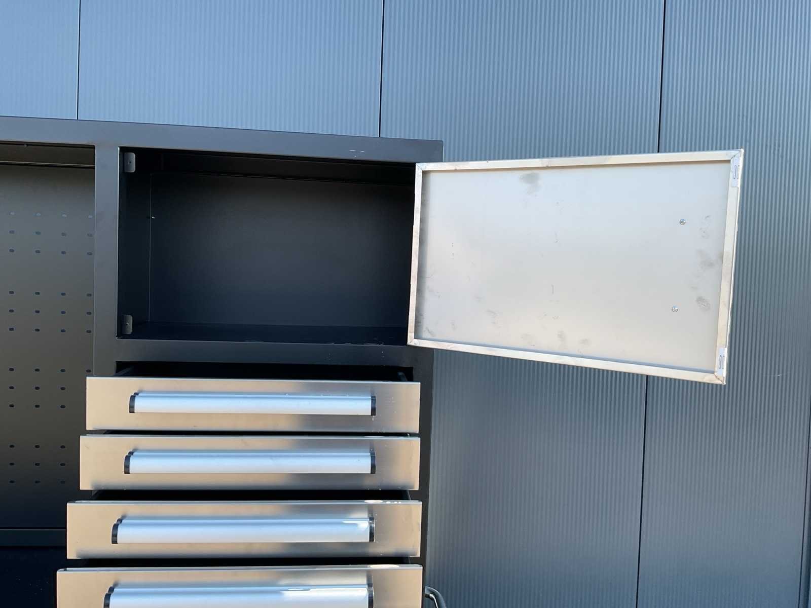 Merk: Rhino Cross Model: H10FT-35D-2-01C-01 Type: Industriële werkbank / gereedschapskast Materiaal: Gepoedercoat staal Kleur: Zwart Aantal laden: 35 Aantal kastdeuren: 2 Breedte: ca. 287 cm Diepte: ca. 58,5 cm Hoogte: ca. 205 cm Merk: Rhino Cross Model: H10FT-35D-2-01C-01