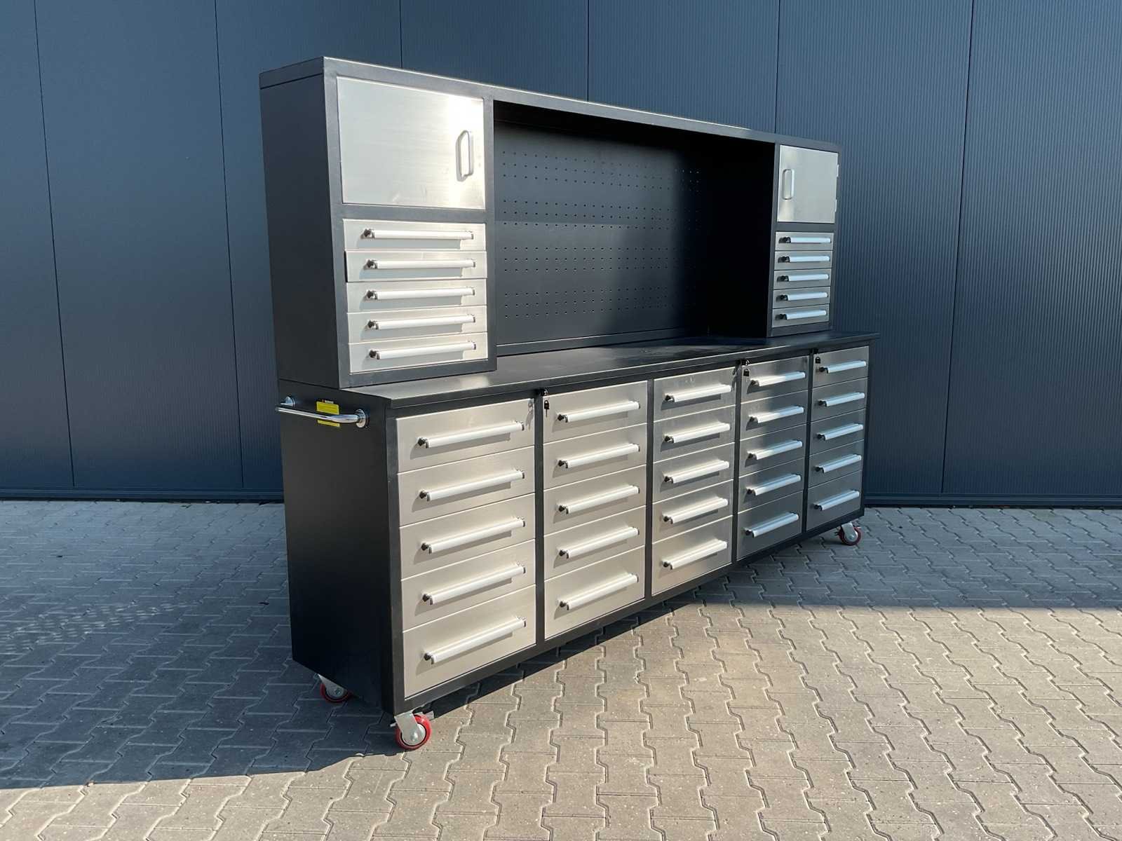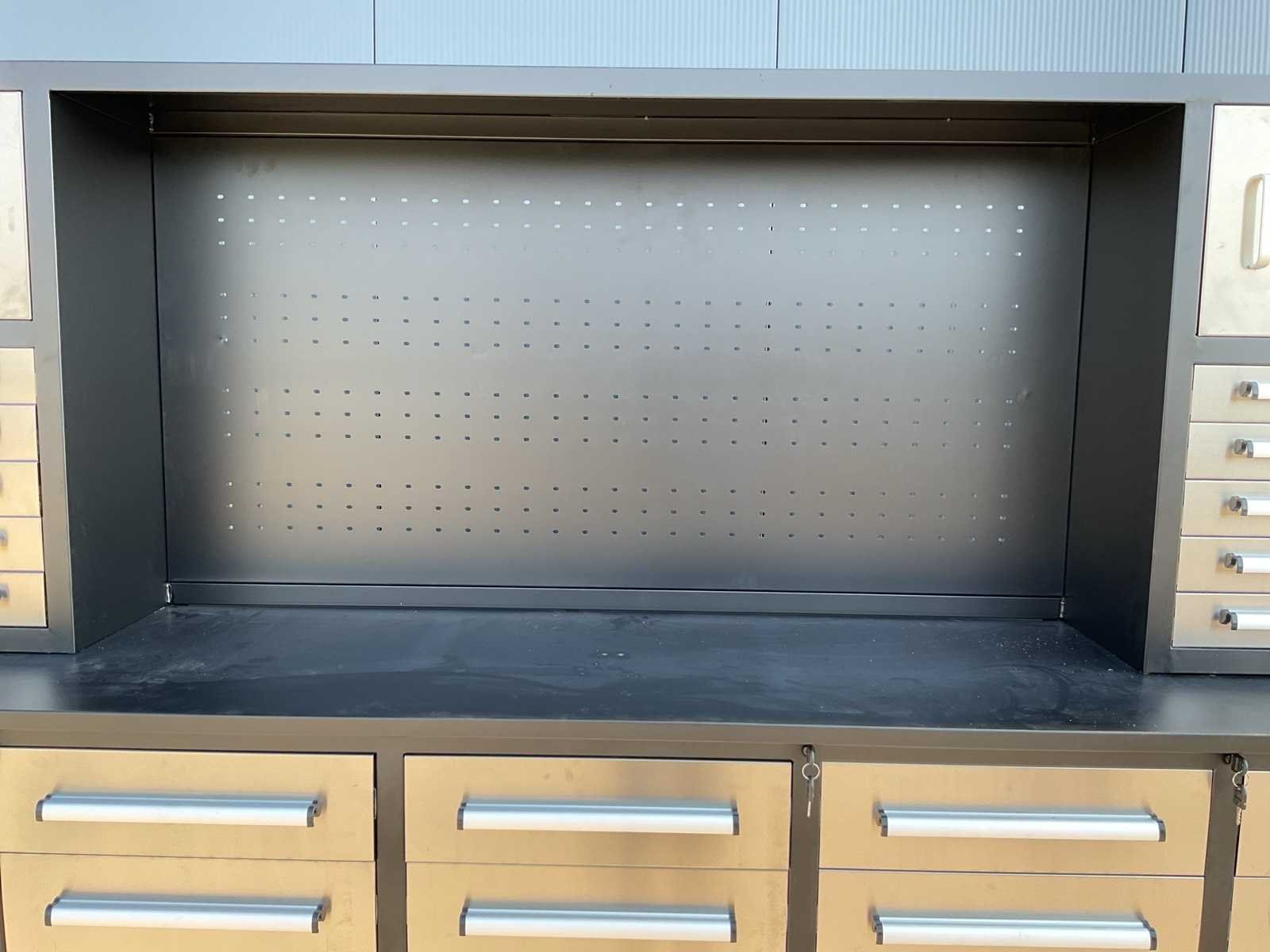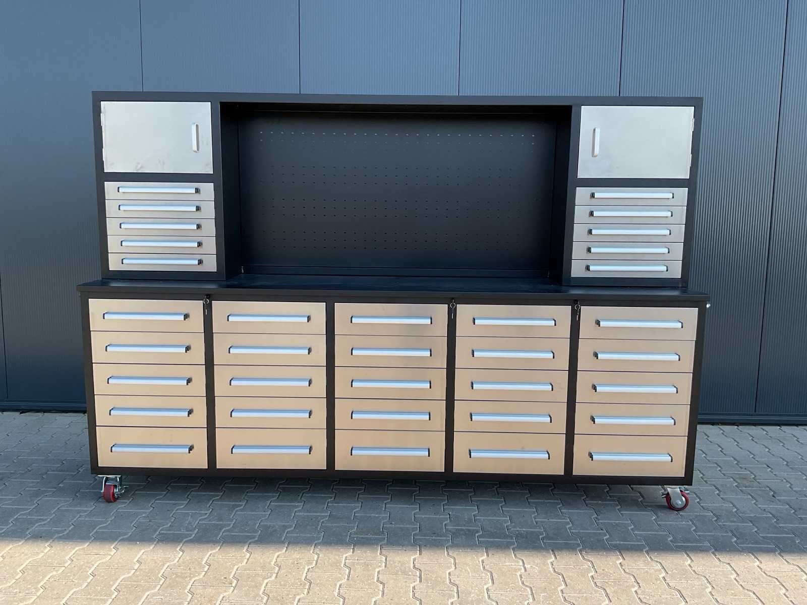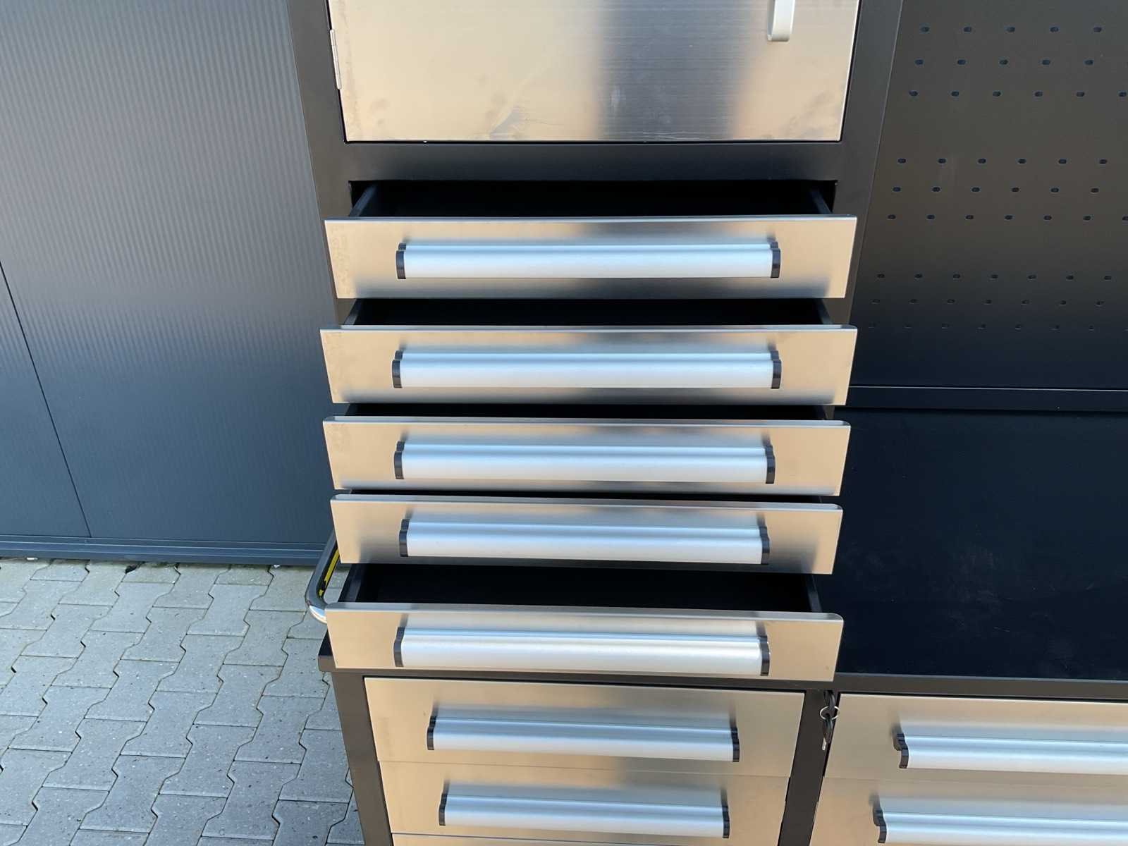 Merk: Rhino Cross Model: H10FT-35D-2-01C-01 Type: Industriële werkbank / gereedschapskast Materiaal: Gepoedercoat staal Kleur: Zwart Aantal laden: 35 Aantal kastdeuren: 2 Breedte: ca. 287 cm Diepte: ca. 58,5 cm Hoogte: ca. 205 cm Merk: Rhino Cross Model: H10FT-35D-2-01C-01