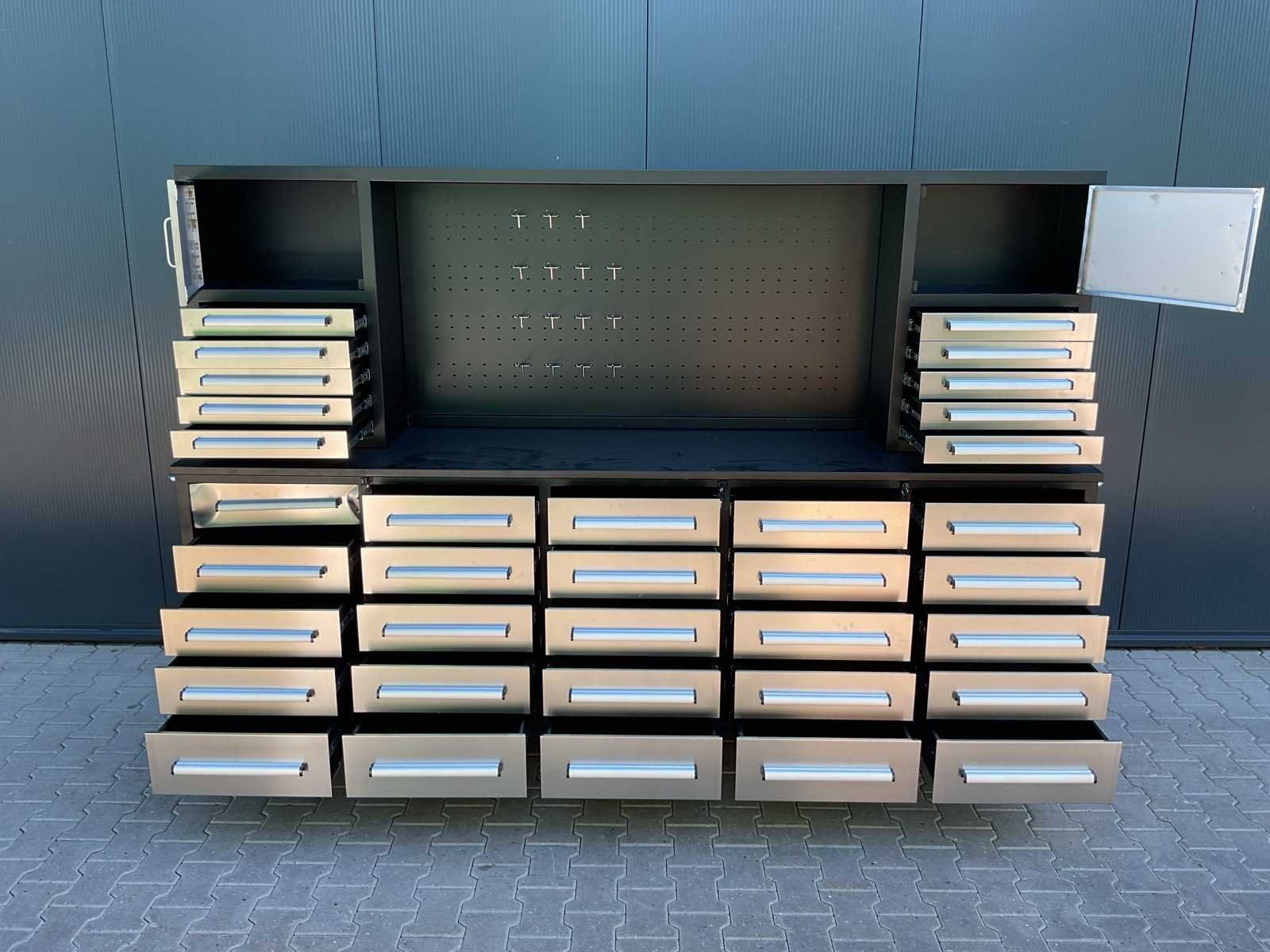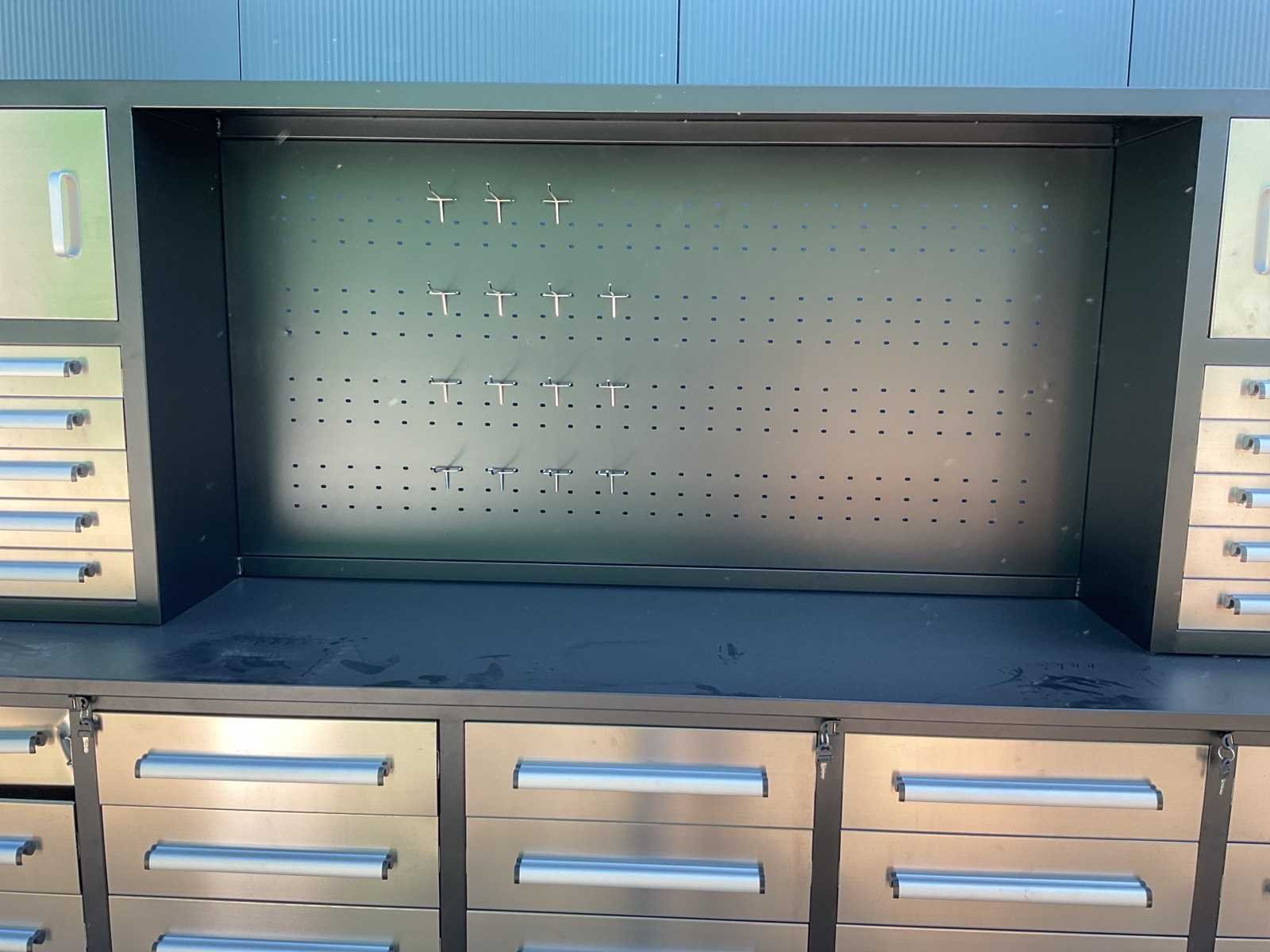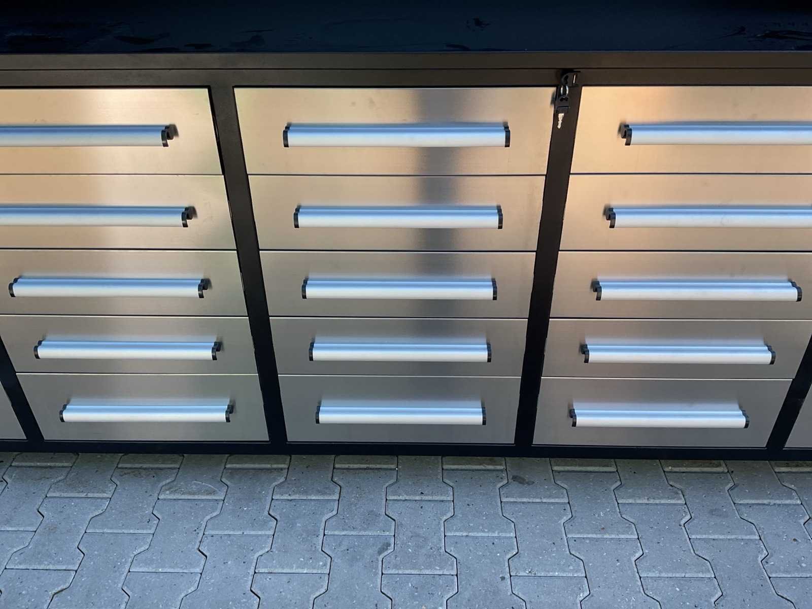 Merk: Rhino Cross Model: H10FT-35D-2-01C-01 Type: Industriële werkbank / gereedschapskast Materiaal: Gepoedercoat staal Kleur: Zwart/RVS Aantal laden: 35 Aantal kastdeuren: 2 Breedte: ca. 287 cm Diepte: ca. 58,5 cm Hoogte: ca. 205 cm Merk: Rhino Cross Model: H10FT-35D-2-01C-01 Product type: 202604071405