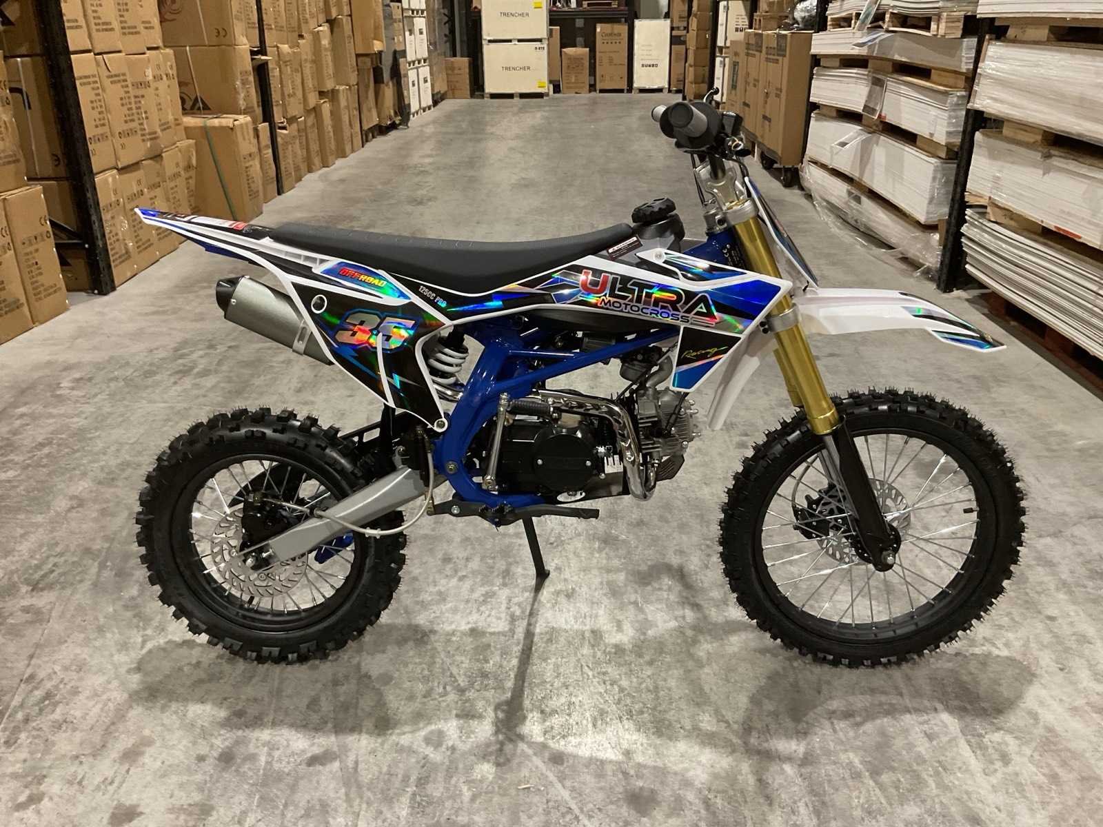 Voorzien van motor: 125 cc, 4-takt, 11 pk; Brandstof: benzine (4-takt); Transmissie: schakel; Remmen: hydraulische schijfremmen; Bandenmaat: voor 17" / achter 14"; Transportafmetingen (in doos): 135 × 45 × 65 cm; Transport gewicht: 78kg; ongebruikt in doos Merk: Ultra Motocross Model: DB003 26DE Type: 125cc Blauw Cilinderinhoud: 125cc
