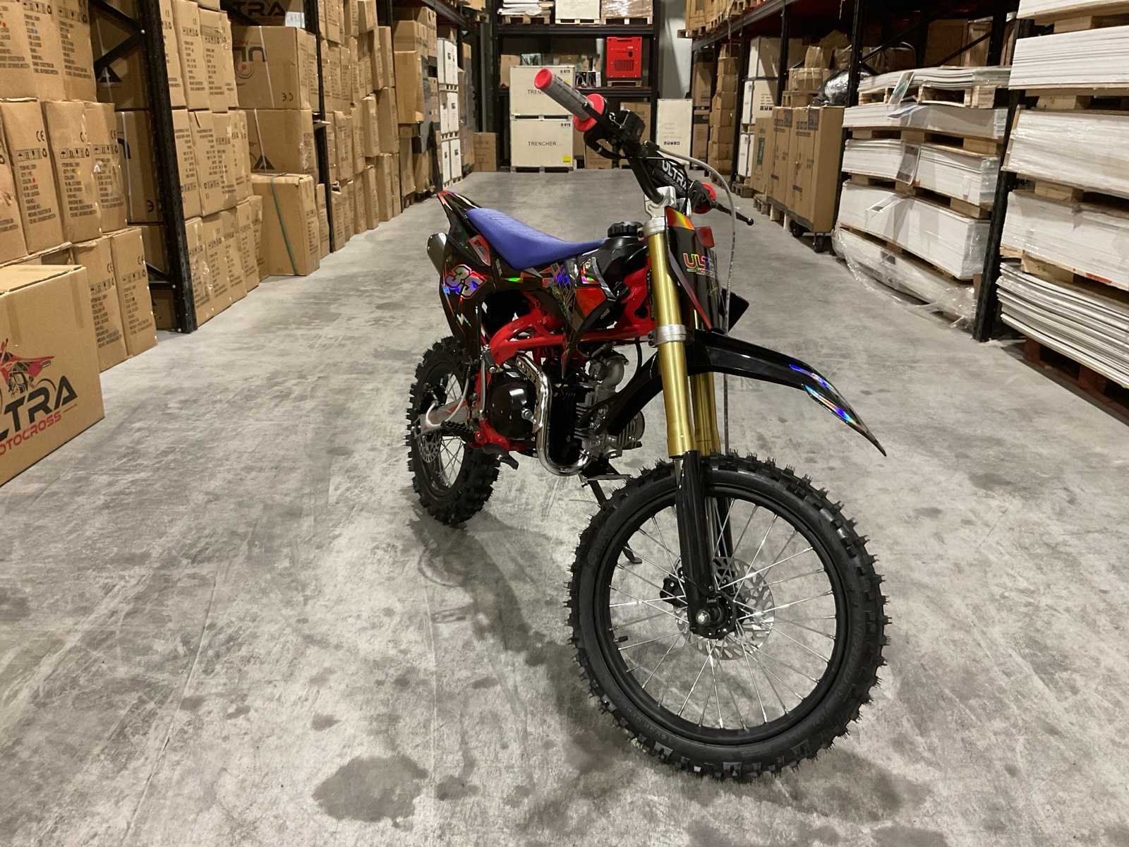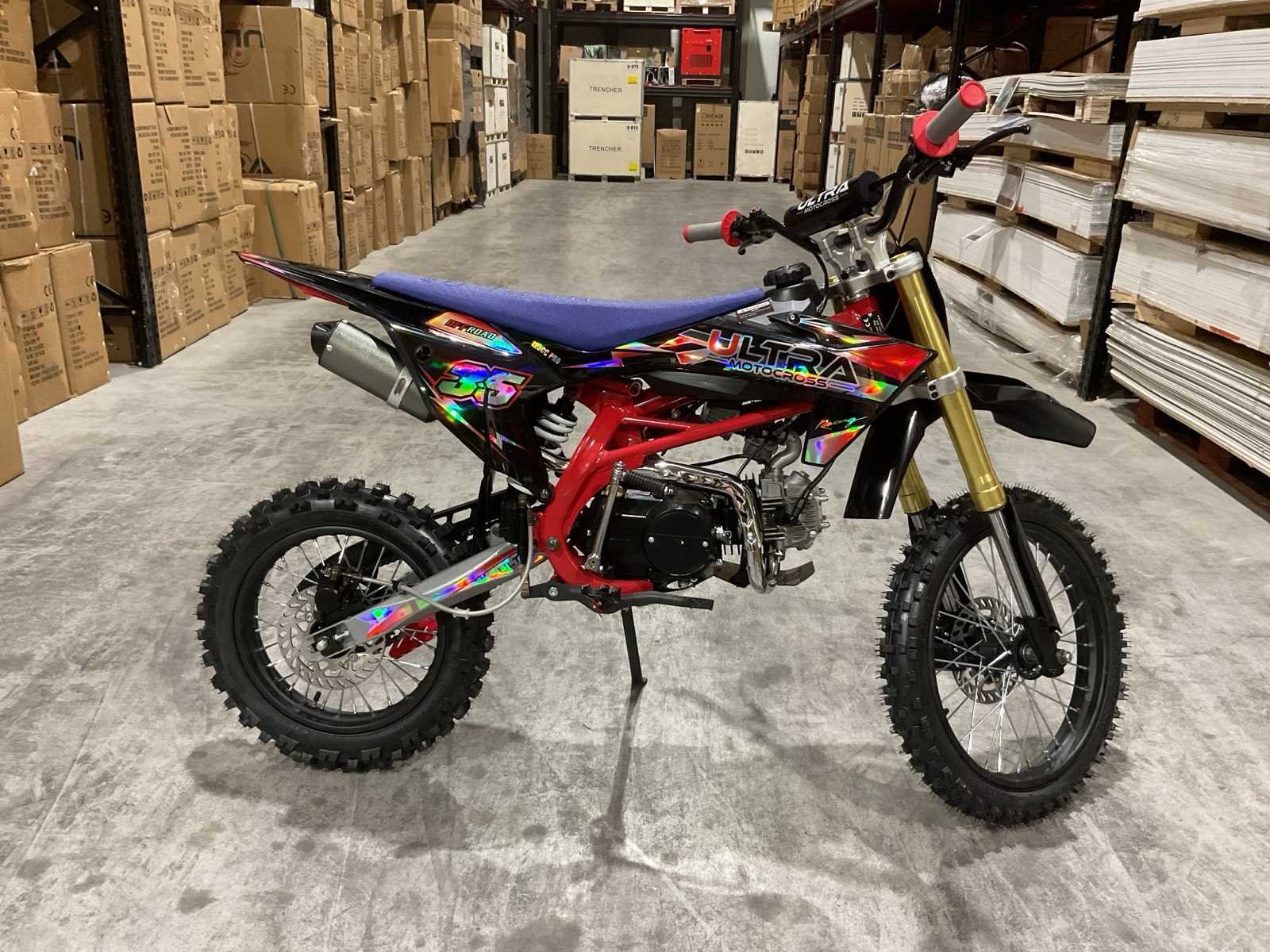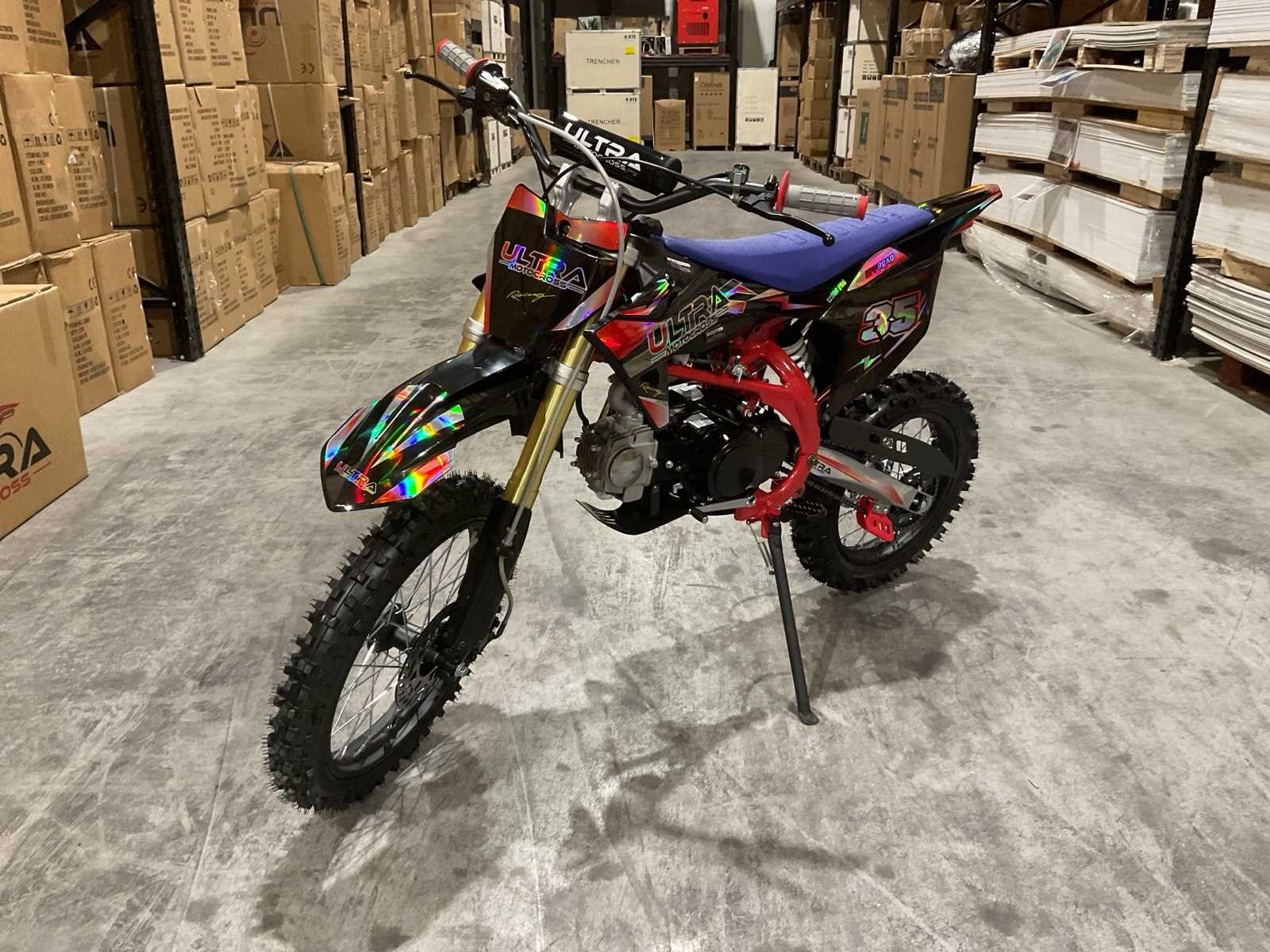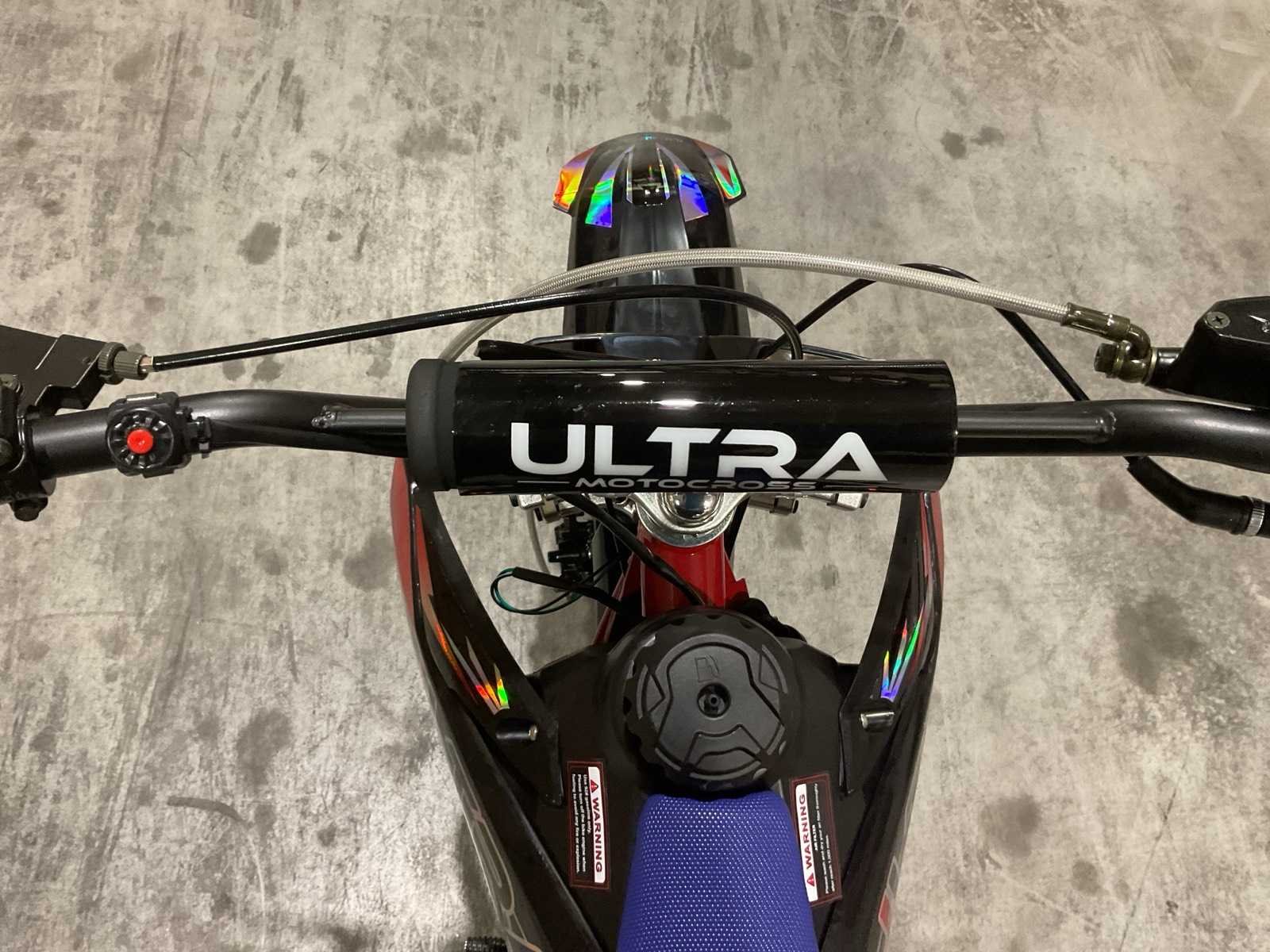 Voorzien van motor: 125 cc, 4-takt, 11 pk; Brandstof: benzine (4-takt); Transmissie: schakel; Remmen: hydraulische schijfremmen; Bandenmaat: voor 17" / achter 14"; Transportafmetingen (in doos): 135 × 45 × 65 cm; Transport gewicht: 78kg; ongebruikt in doos Merk: Ultra Motocross Model: DB003 26DE Type: 125cc Rood Cilinderinhoud: 125cc