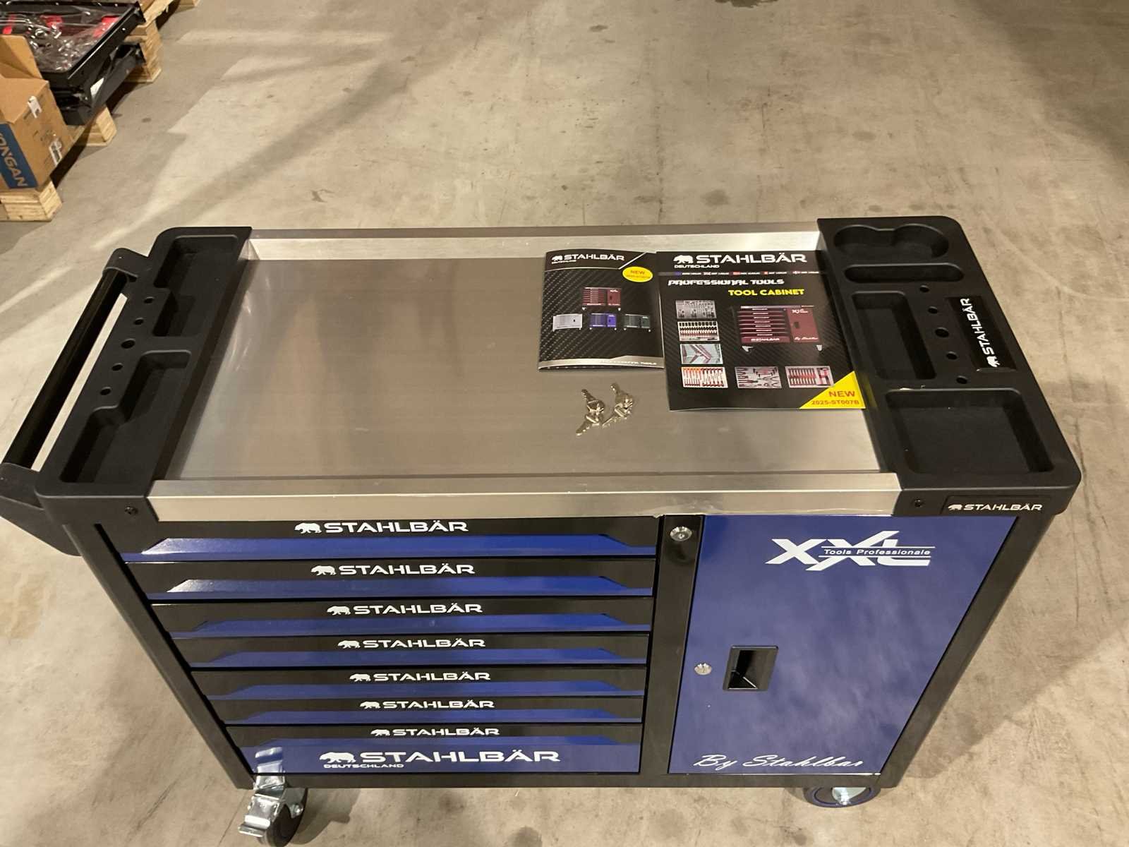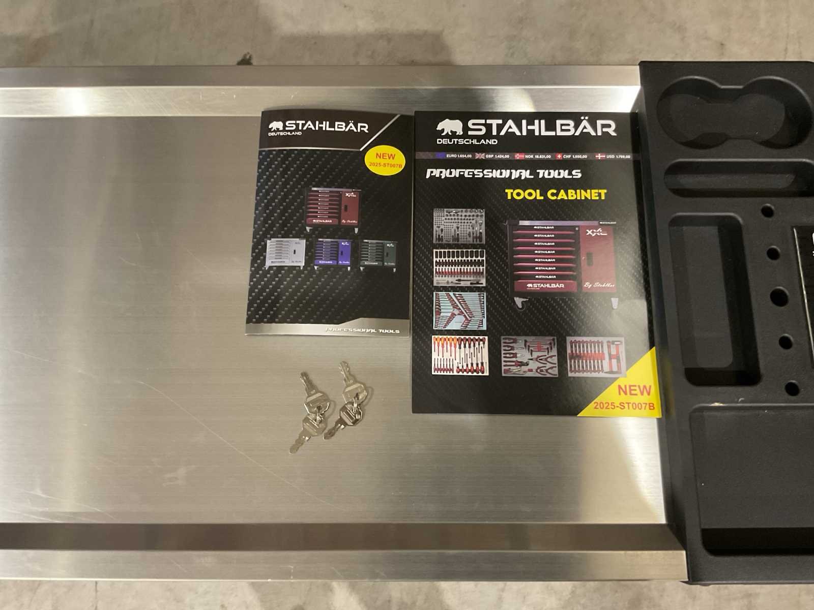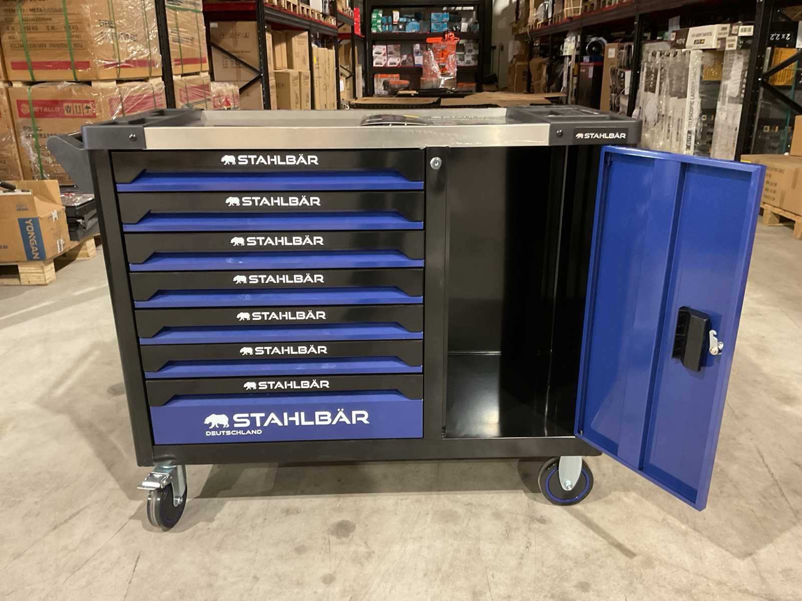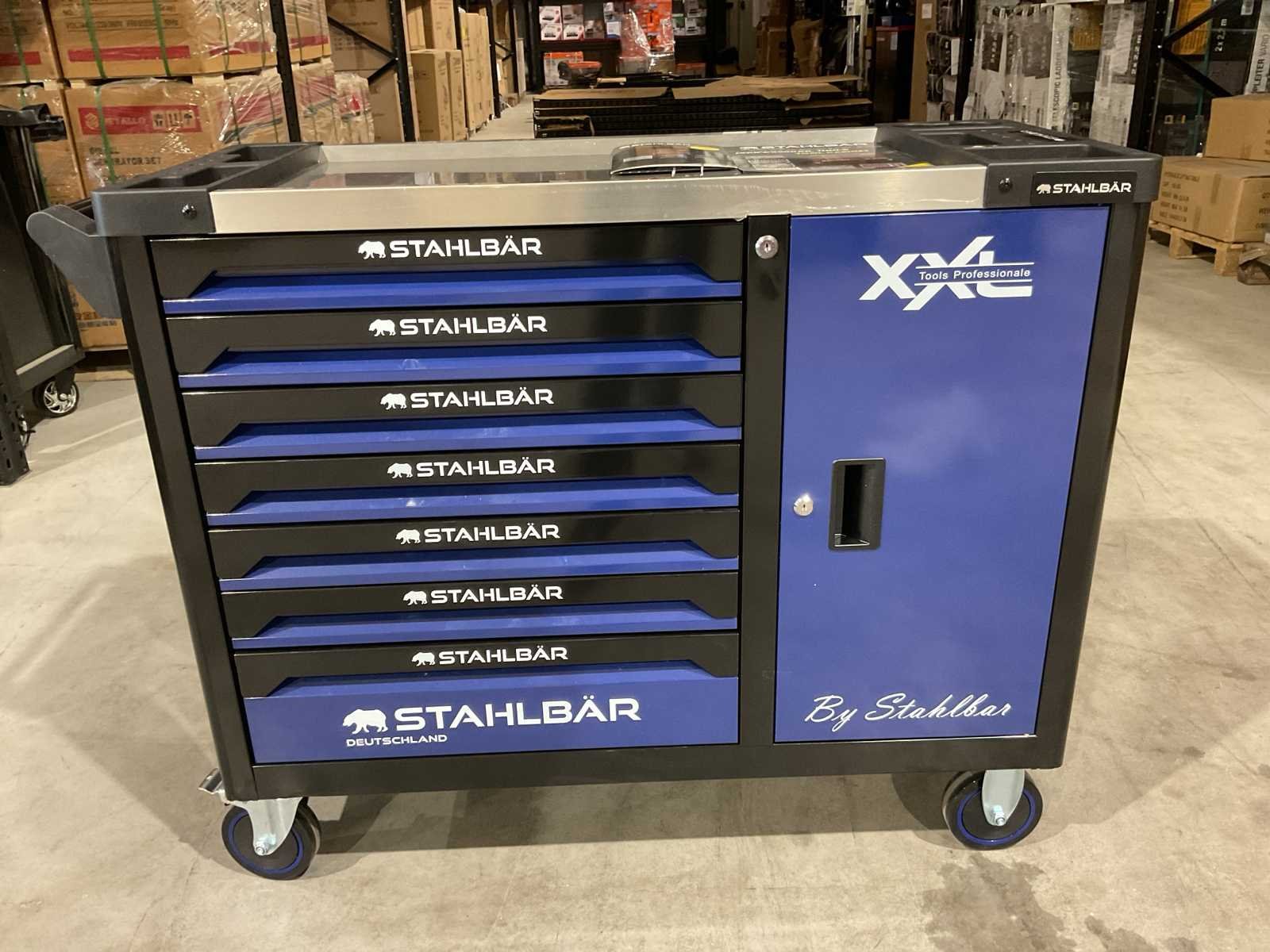 Voorzien van 7 lades waarvan 7 gevuld met gereedschap; zijdeur; professioneel chroom-vanadium gereedschap; heavy duty gereedschapswagen; 4 wielen; stevig handvat; ongebruikt in doos (transport afmetingen 110x50x80 cm) Merk: Stahlbär Type: Deutschland jumbo Bouwjaar: 2025 Aantal laden: 7 Met inhoud: true Eigen gewicht: 75kg Totale afmeting L: 1100mm Totale afmeting Breedte: 500mm Totale afmeting Hoogte: 800mm
