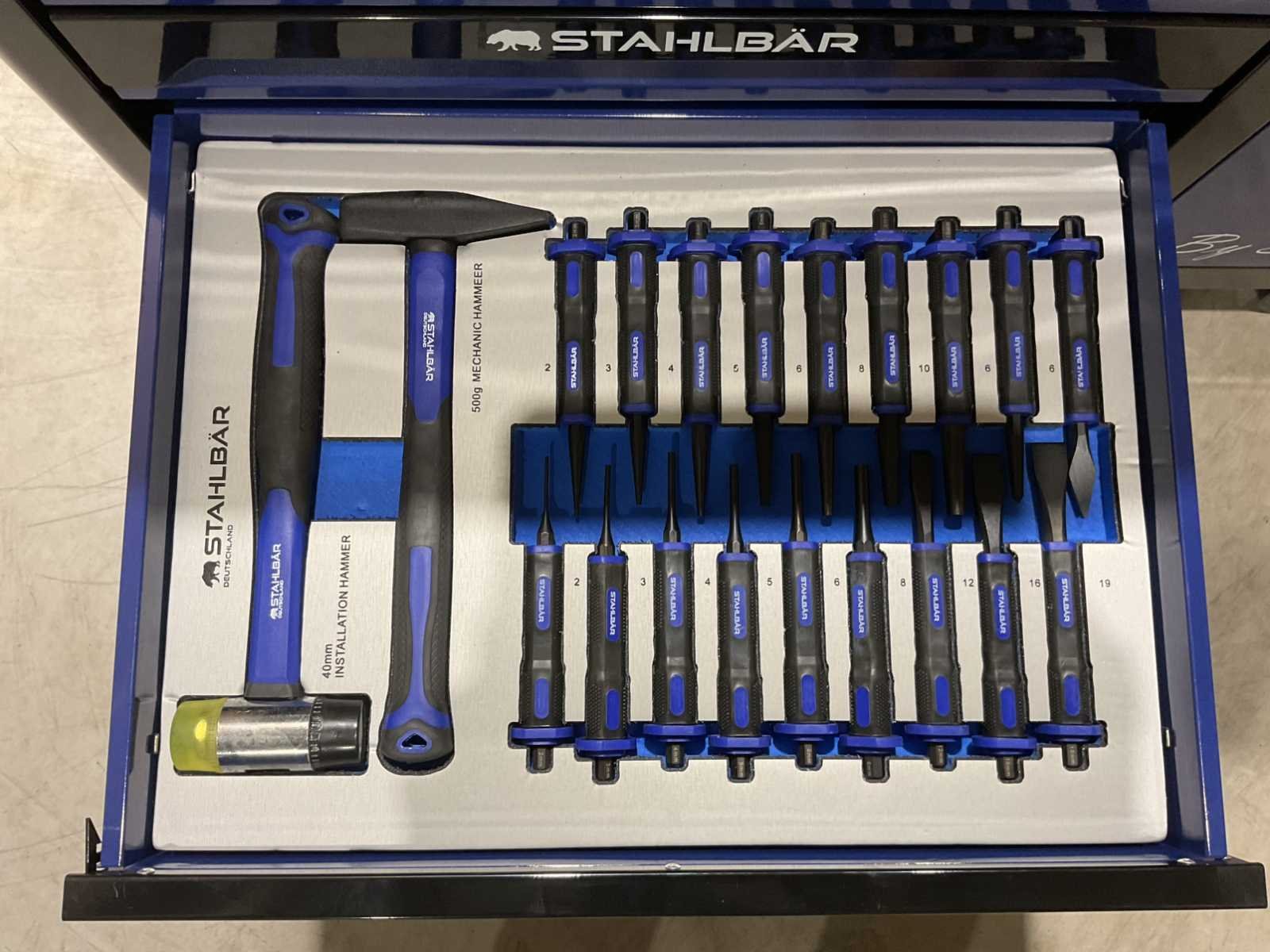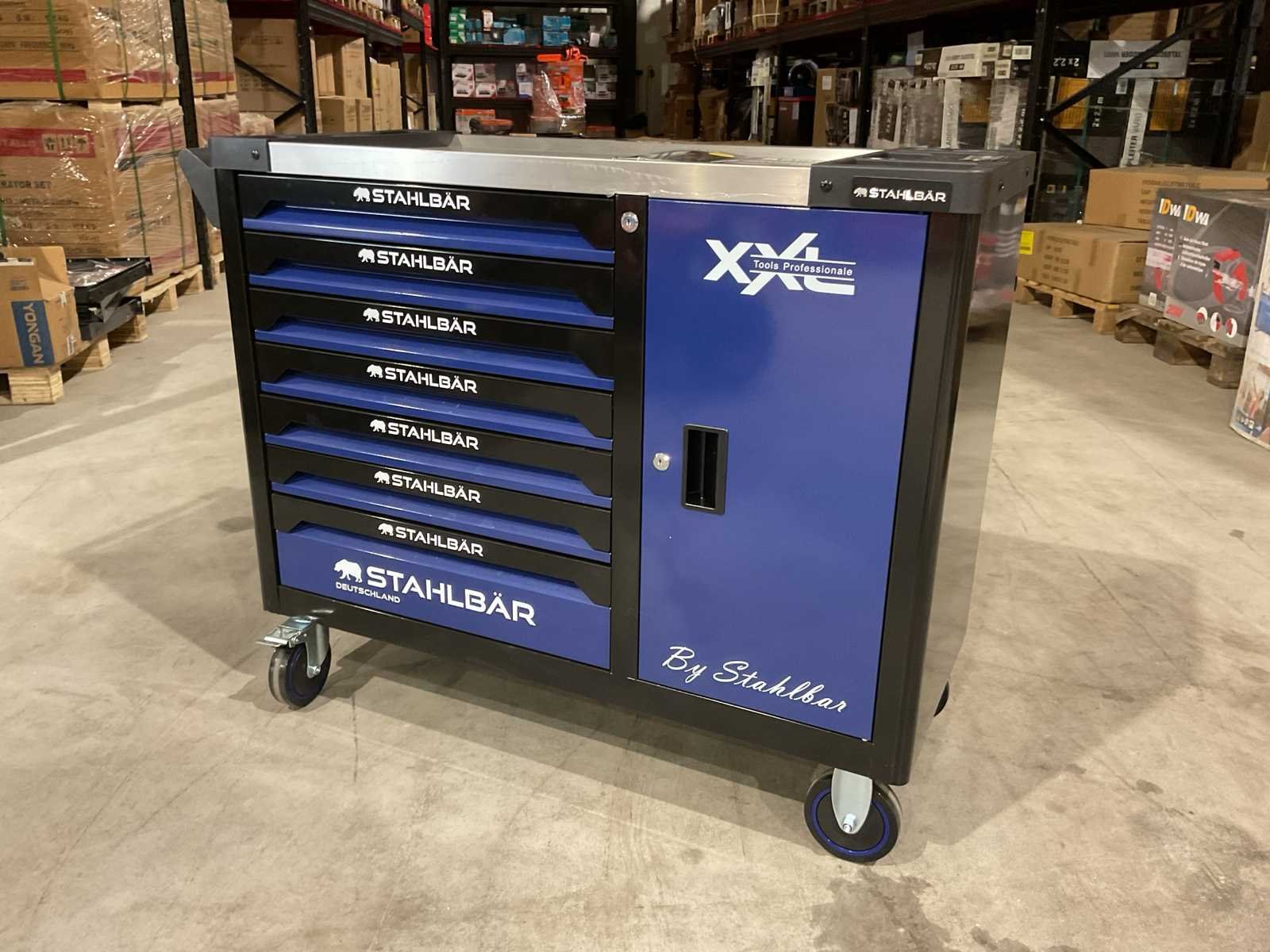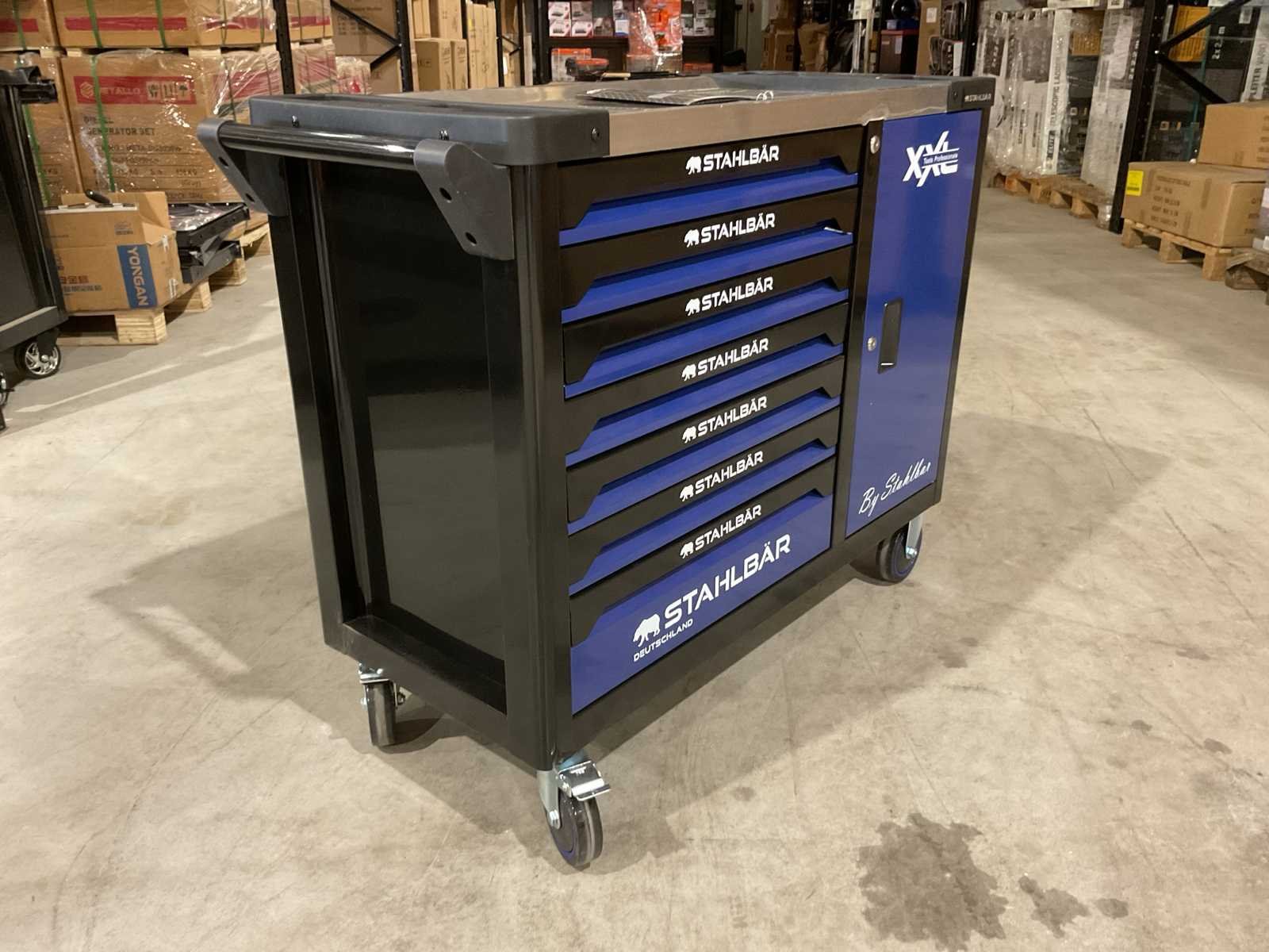Voorzien van 7 lades waarvan 7 gevuld met gereedschap; zijdeur; professioneel chroom-vanadium gereedschap; heavy duty gereedschapswagen; 4 wielen; stevig handvat; ongebruikt in doos (transport afmetingen 110x50x80 cm) Merk: Stahlbär Type: Deutschland jumbo Bouwjaar: 2025 Aantal laden: 7 Met inhoud: true Eigen gewicht: 75kg Totale afmeting L: 1100mm Totale afmeting Breedte: 500mm Totale afmeting Hoogte: 800mm