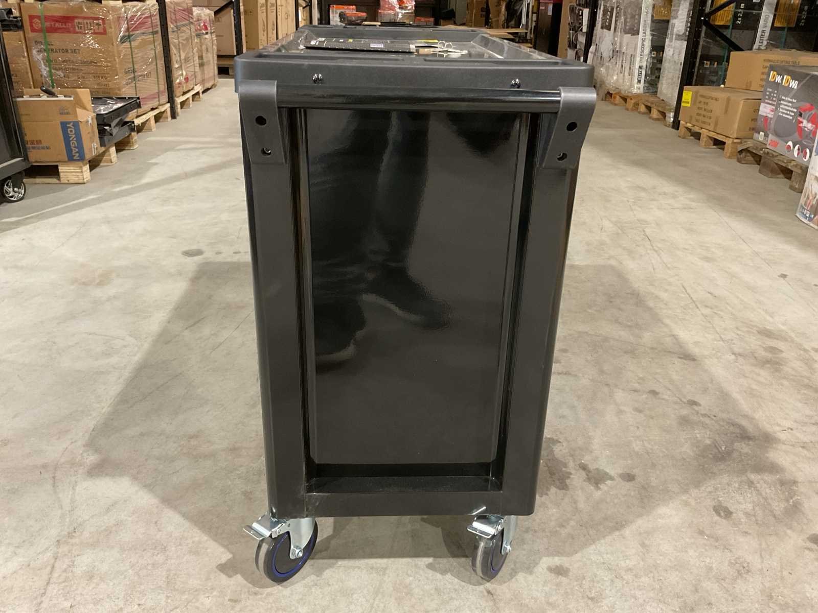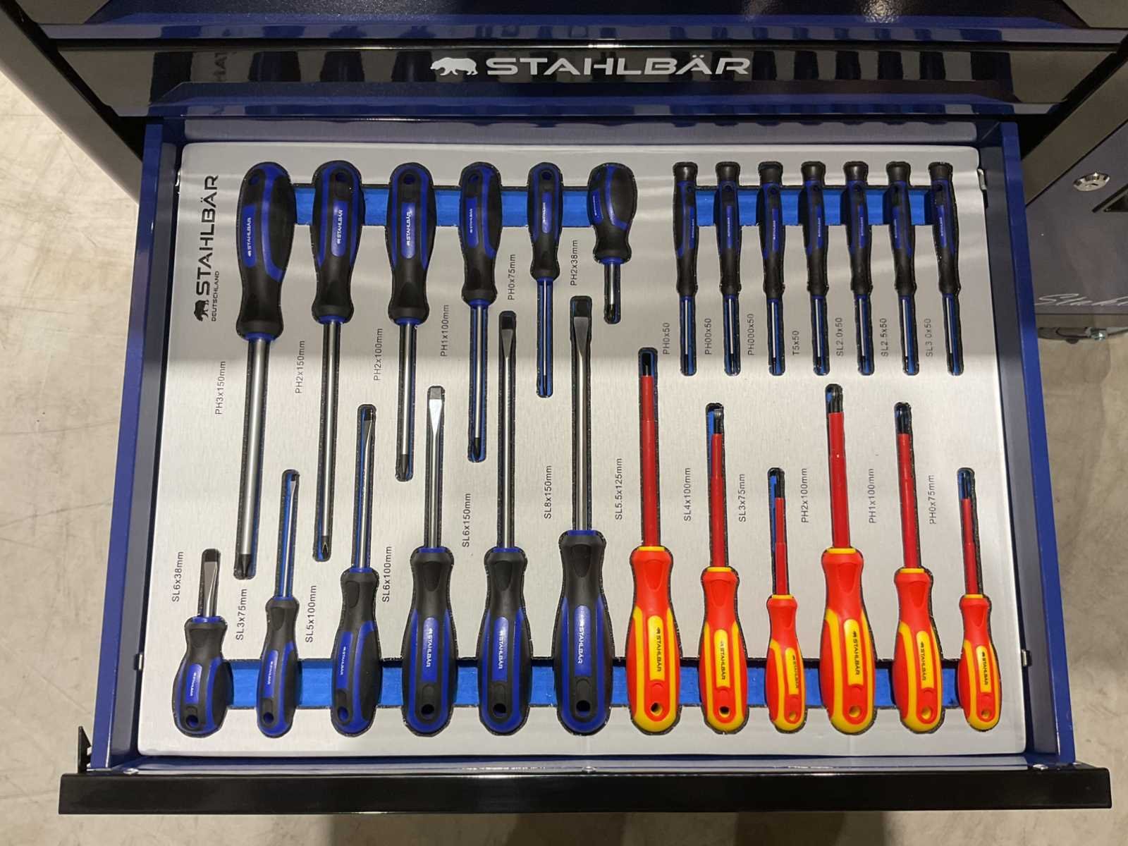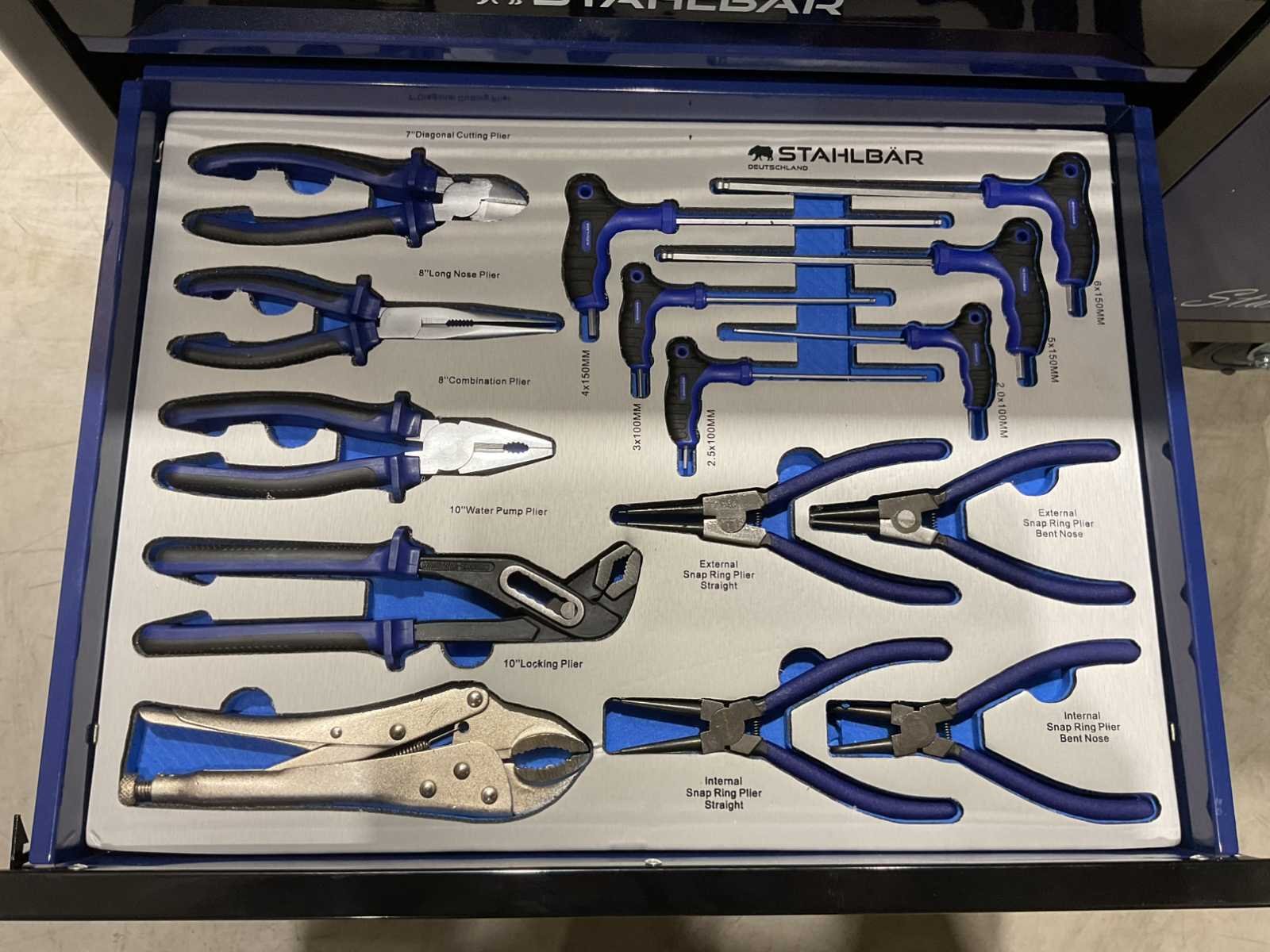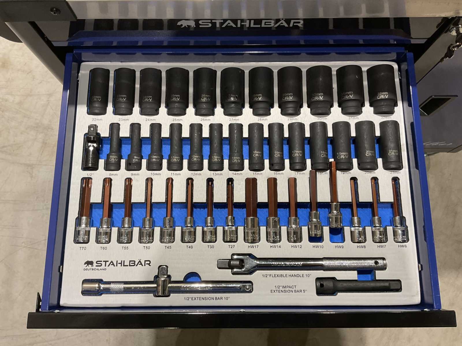 Voorzien van 7 lades waarvan 7 gevuld met gereedschap; zijdeur; professioneel chroom-vanadium gereedschap; heavy duty gereedschapswagen; 4 wielen; stevig handvat; ongebruikt in doos (transport afmetingen 110x50x80 cm) Merk: Stahlbär Type: Deutschland jumbo Bouwjaar: 2025 Aantal laden: 7 Met inhoud: true Eigen gewicht: 75kg Totale afmeting L: 1100mm Totale afmeting Breedte: 500mm Totale afmeting Hoogte: 800mm