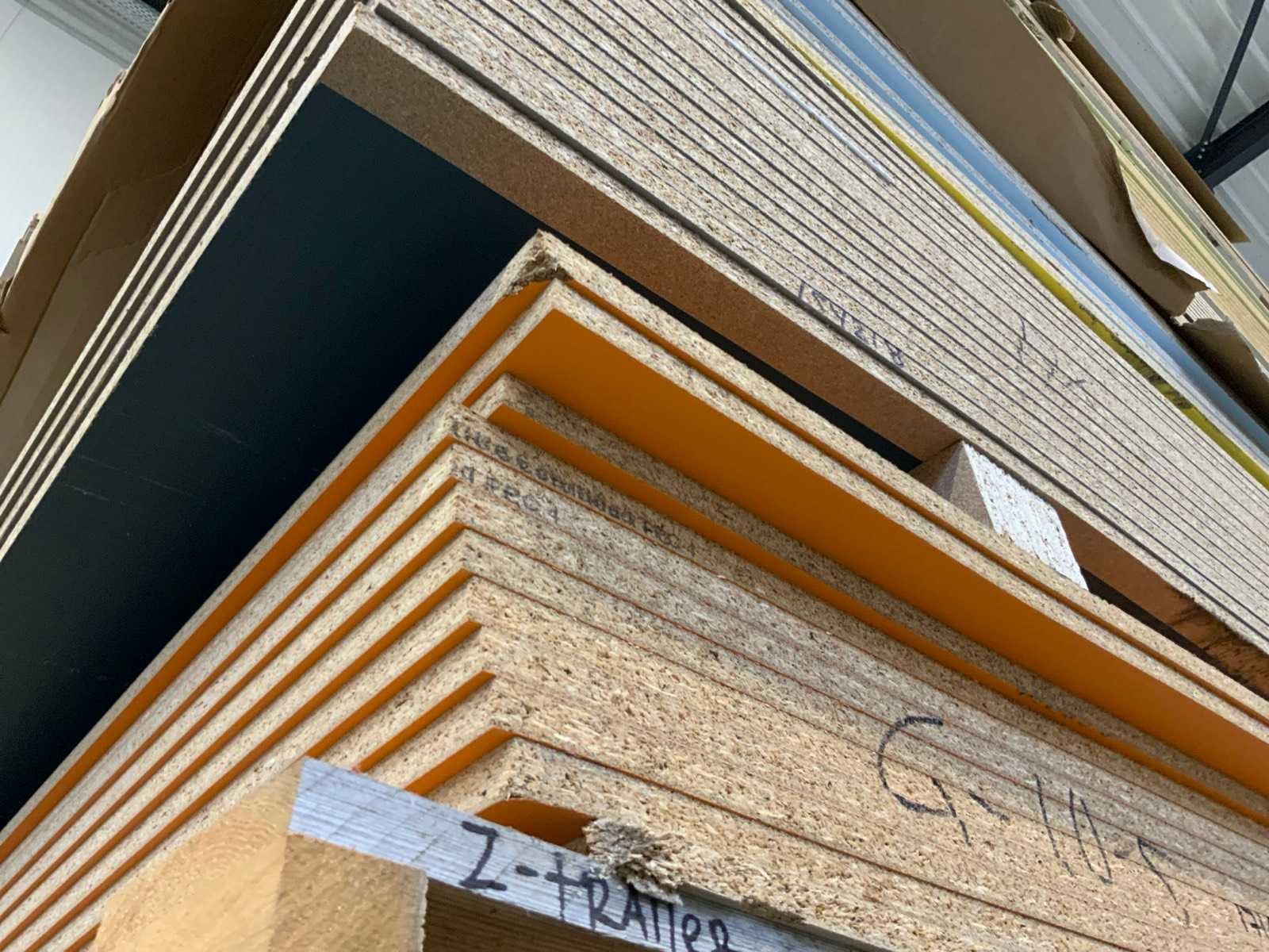 Platen zijn ca 2800x2070x20mm; circa 230 platen;diverse soorten; afmetingen kunnen afwijken; decoratie spaanplaat; sommige dubbelzijdig gelamineerd; past in 1 tautliner; 7 pakken; stapel met gele sticker nummer 6;
