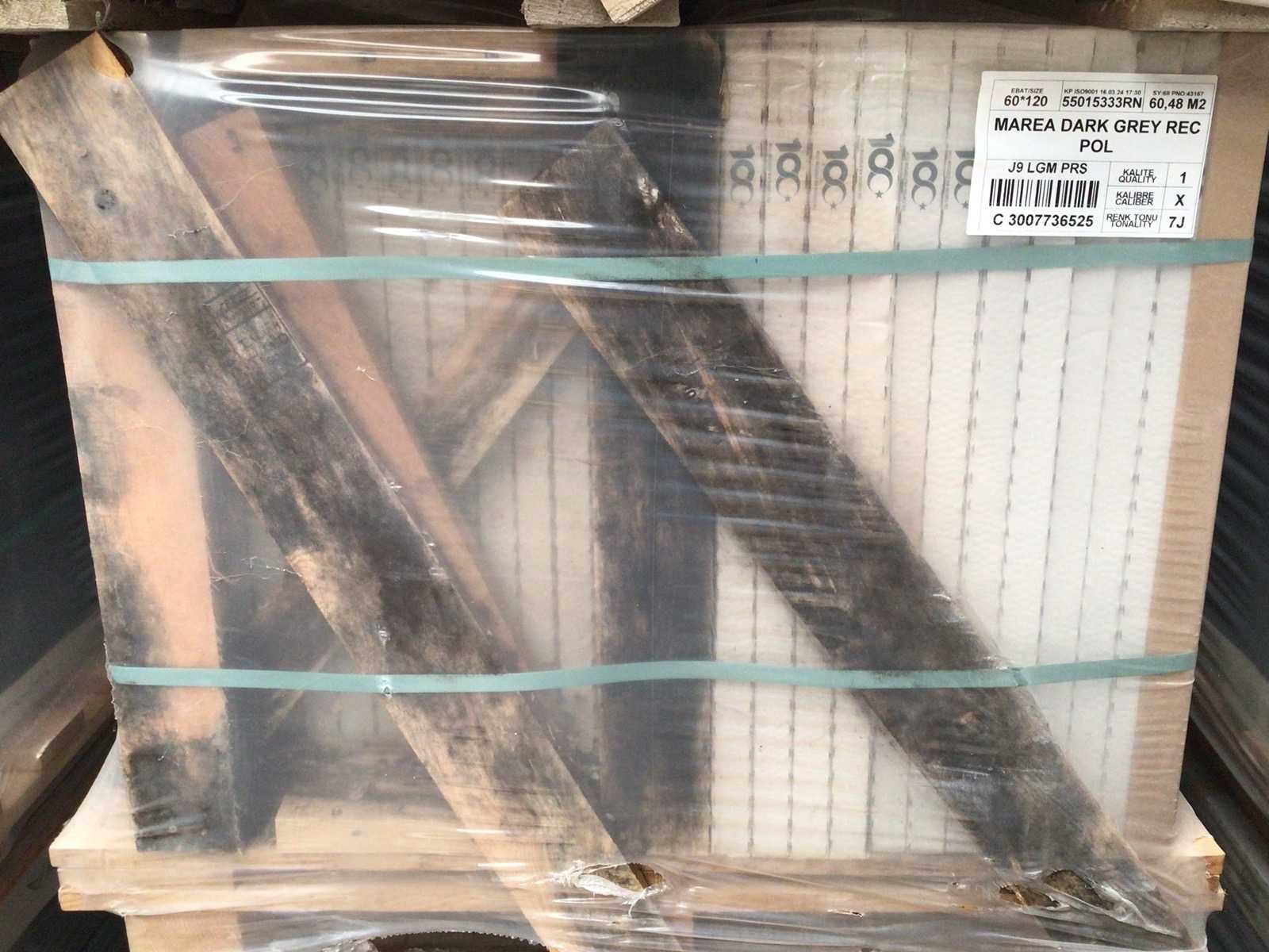 1 pallet Bezorgtermijn 14 dagen Merk: Kutahya Kleur: Marea Dark Grey Afwerking: Gepolijst Lengte: 600mm Breedte: 1200mm Dikte: 9mm Materiaal: Keramiek Type: Vloertegel Aantal m² per verpakking: 2.16m² Aantal pakken: 28 Totaal oppervlakte: 60.48m² Totaal gewicht: 1200kg