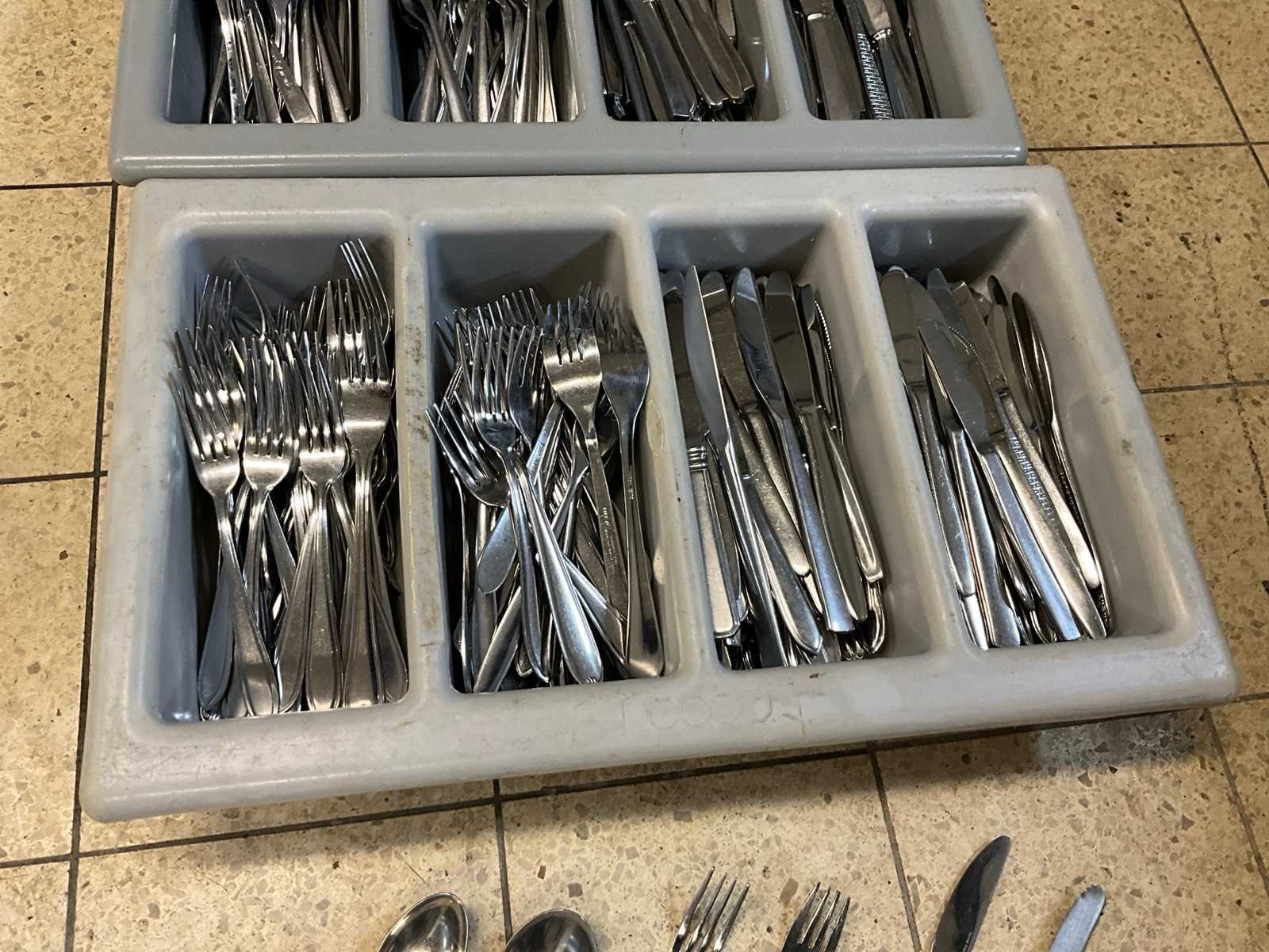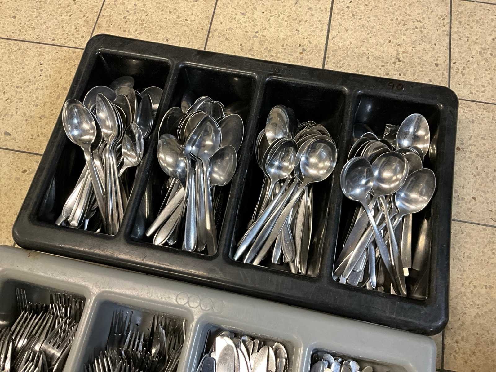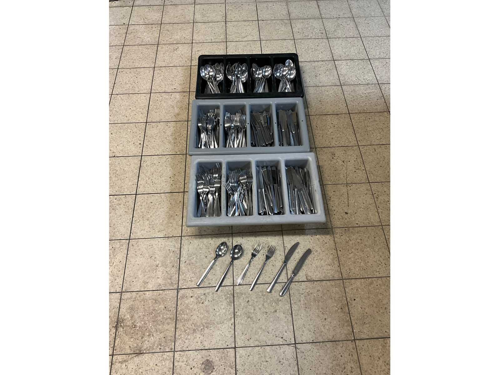 200 x vork; 200 x mes en 200 x lepel; niet identiek; inclusief 3 bestekbakken. Totale afmeting L: 20cm