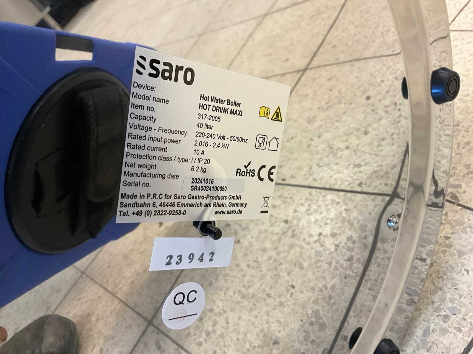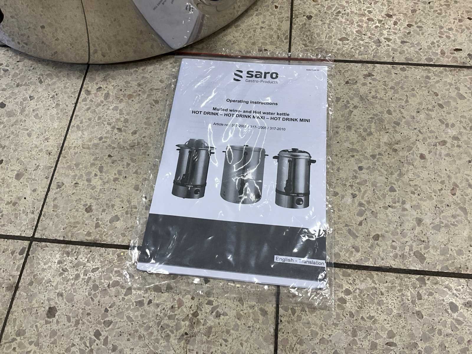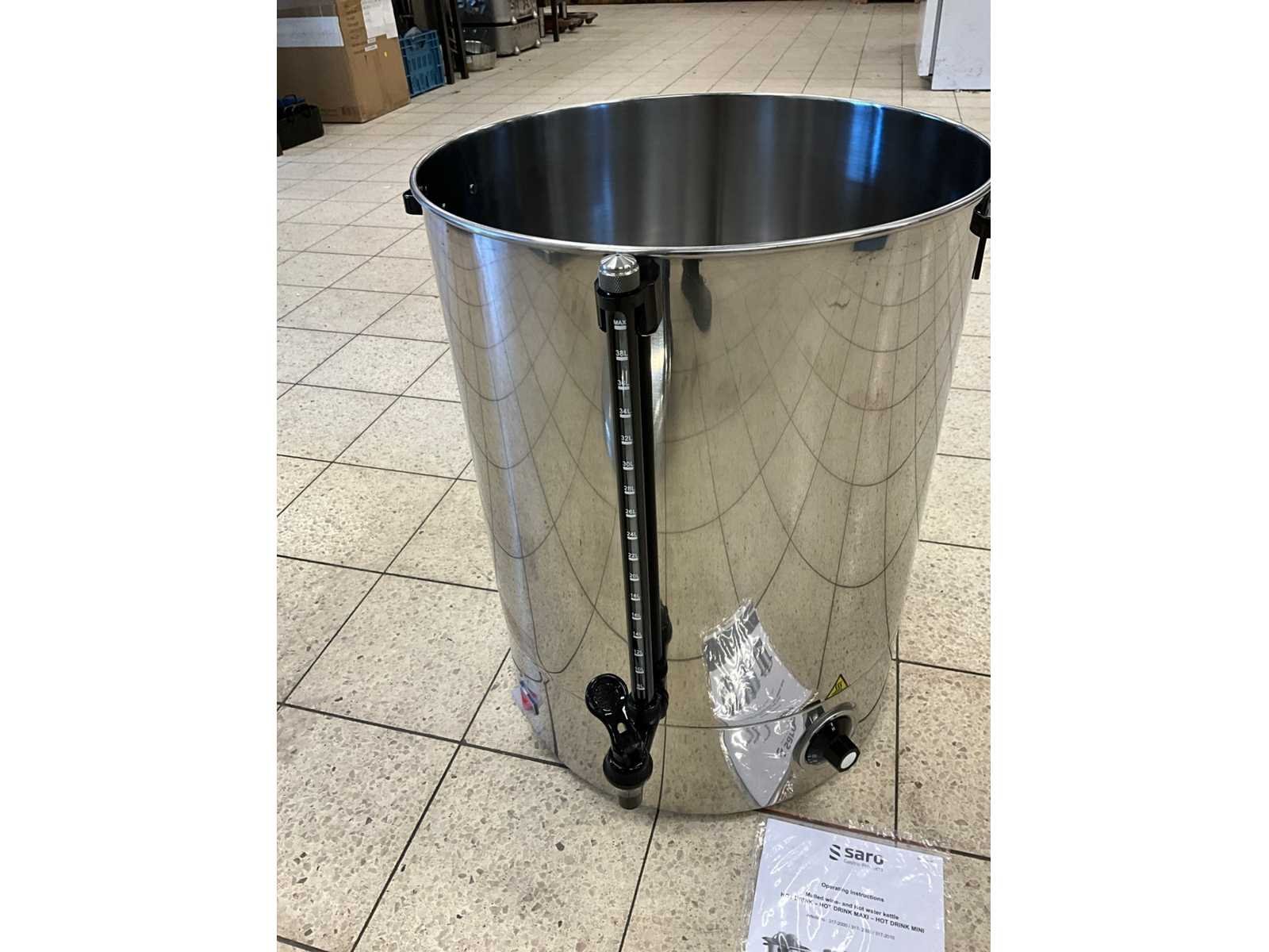 Ongebruikt; diam. 38 cm. ; 40 liter inhoud; 2400 watt. Merk: Saro Type: Hot drink maxi Totale afmeting Hoogte: 55cm Rvs: true Regelbare thermostaat: true Aansluiting: 230V Eigen gewicht: 6kg