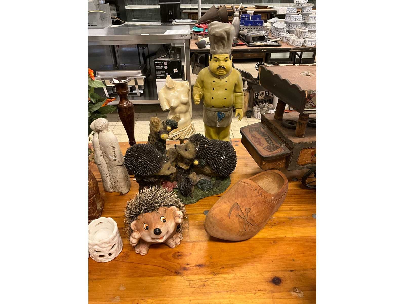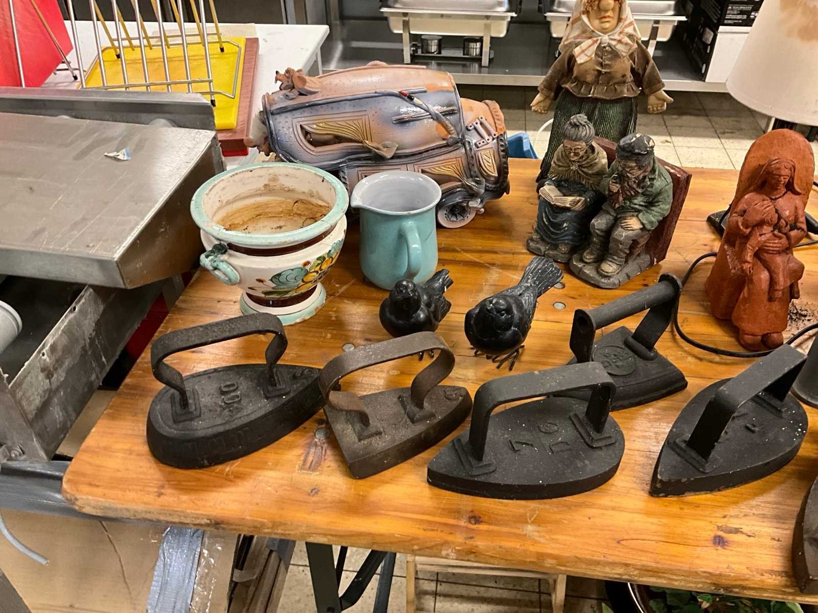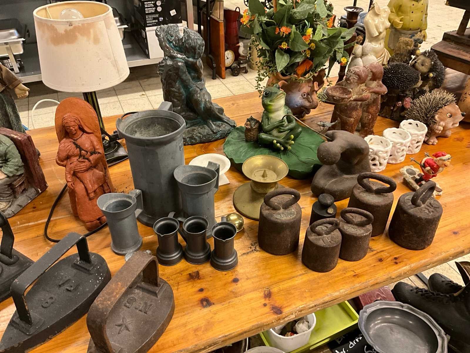 Beelden, schaatsen, strijkijzers en bloempotten. Metaal: true Hout: true