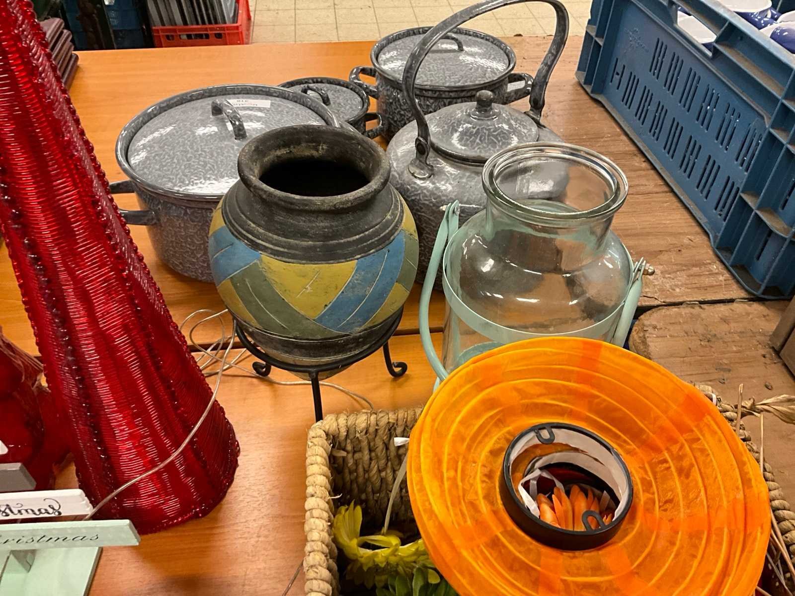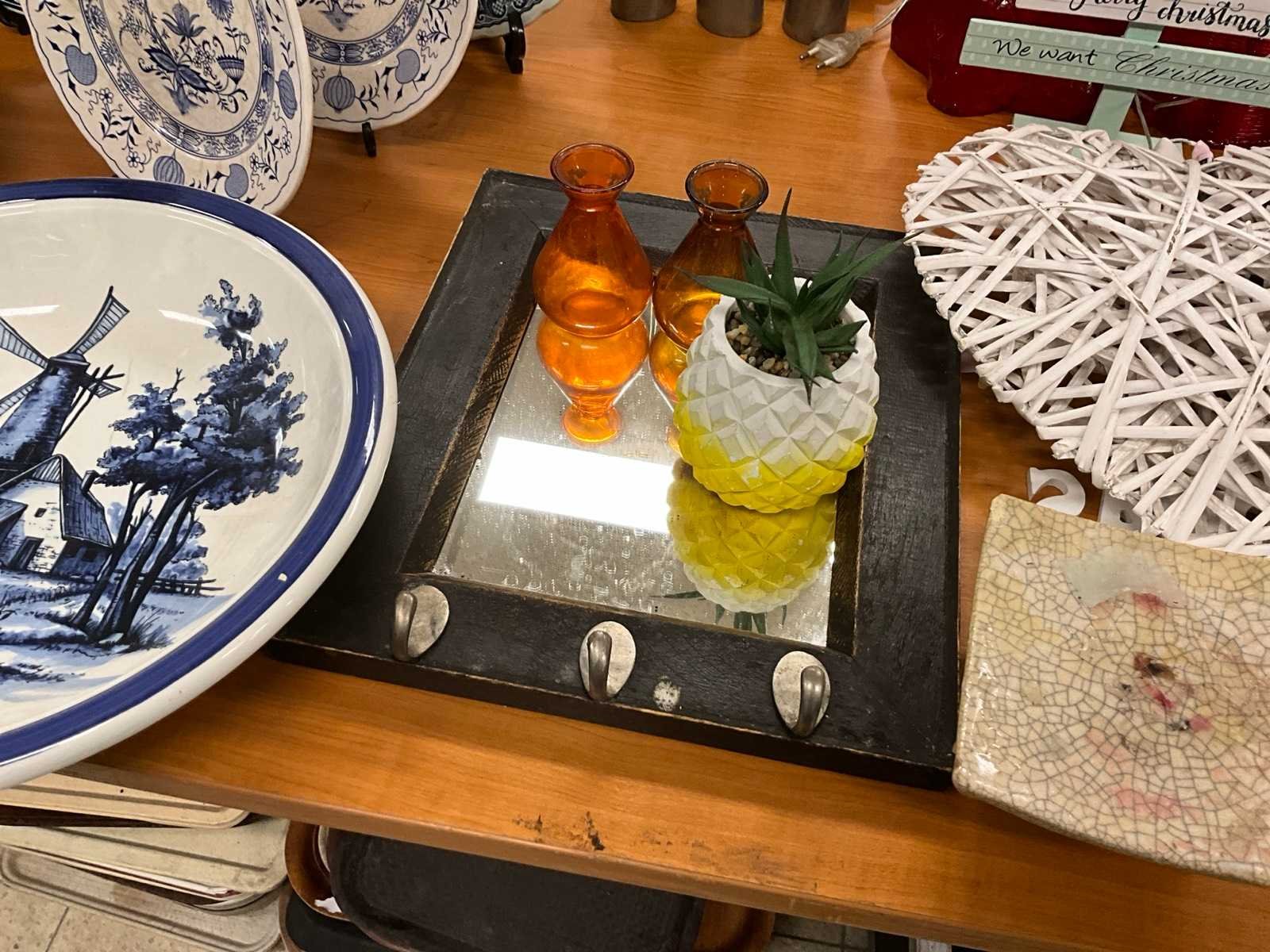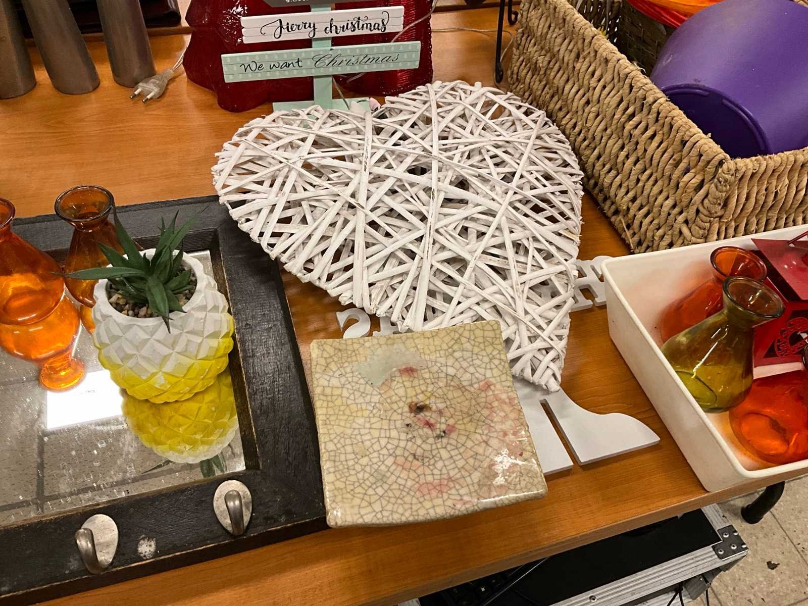 Vazen, potten, spiegel en houten hart. Metaal: true Kunststof: true