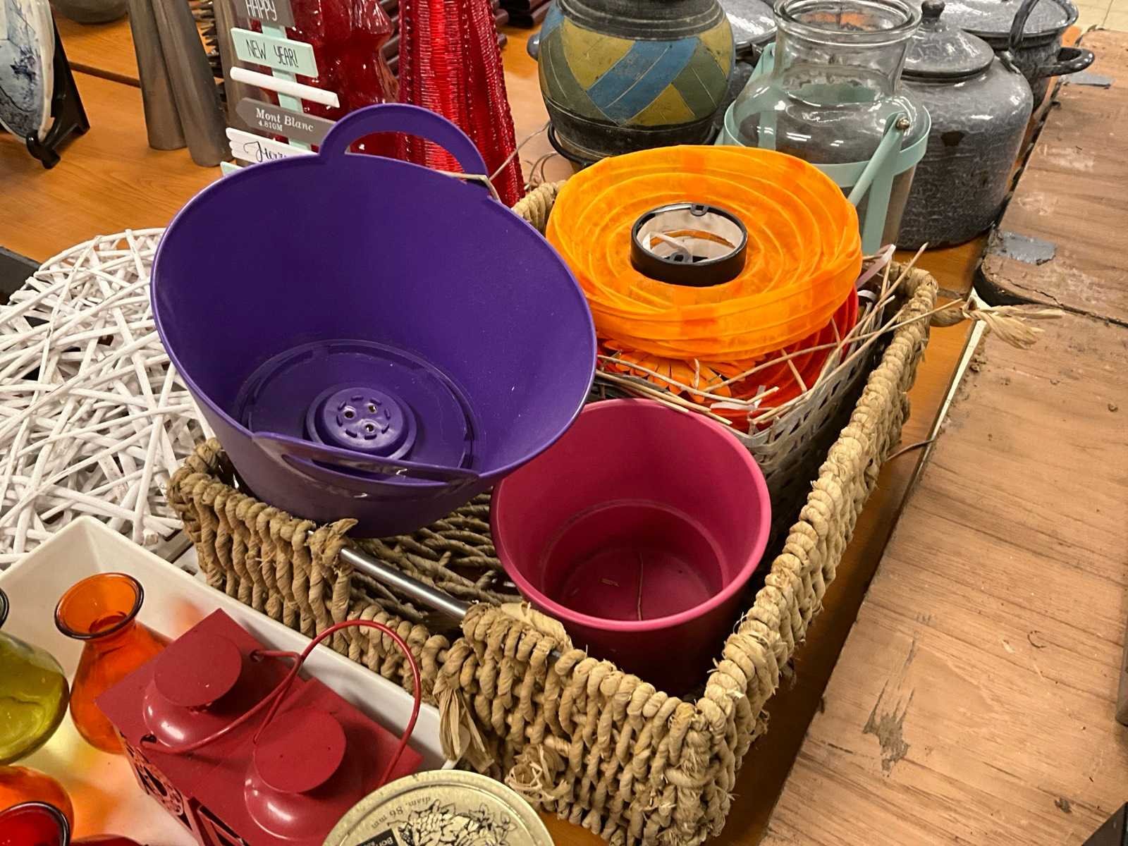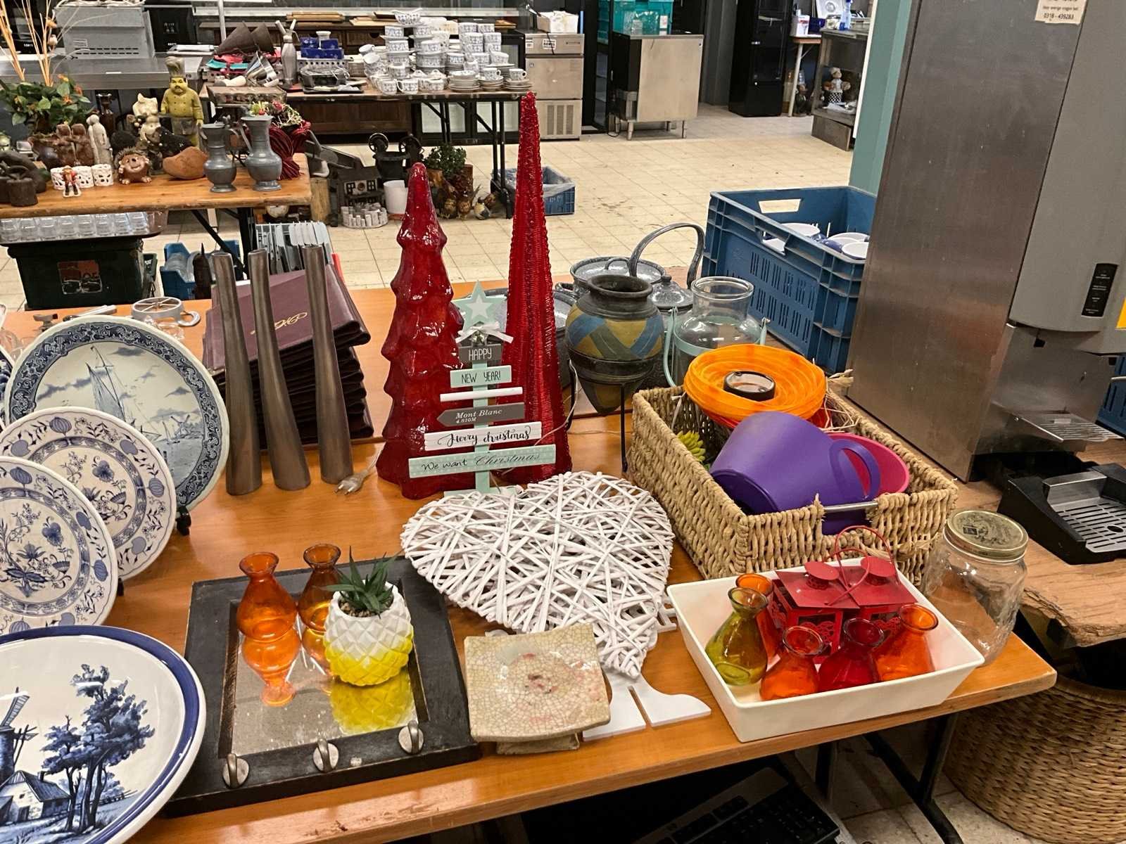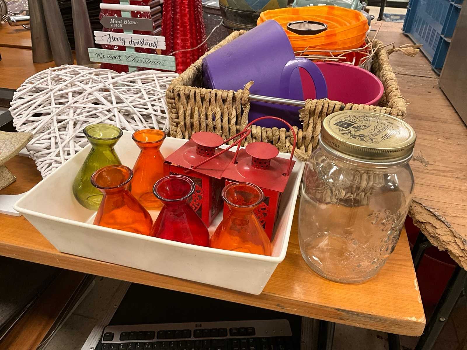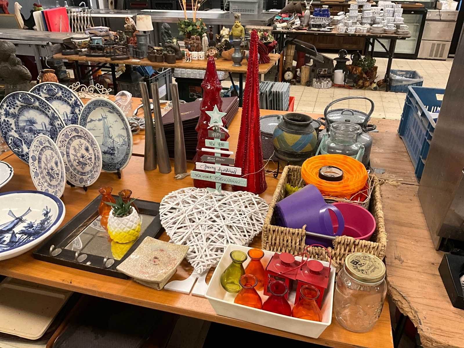 Vazen, potten, spiegel en houten hart. Metaal: true Kunststof: true