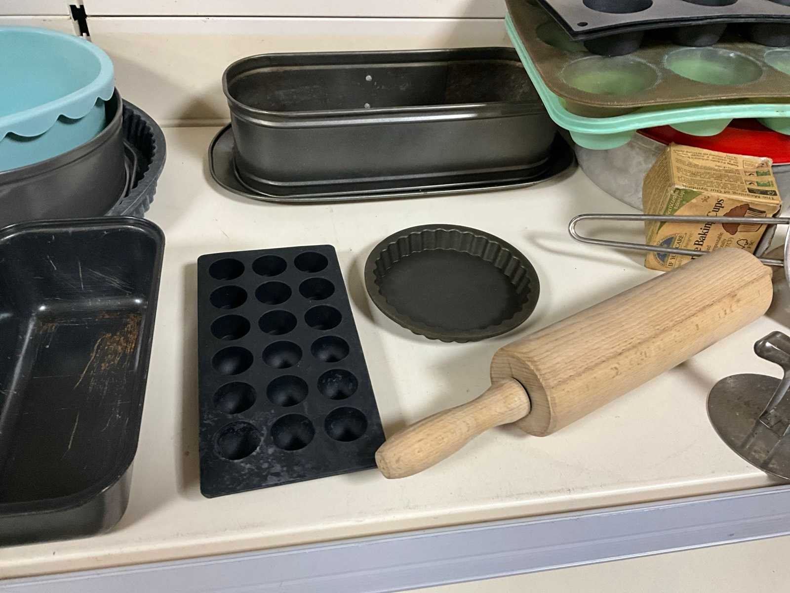 Siliconen bakvormen, deegroller, spuitzakken en weegschaal.