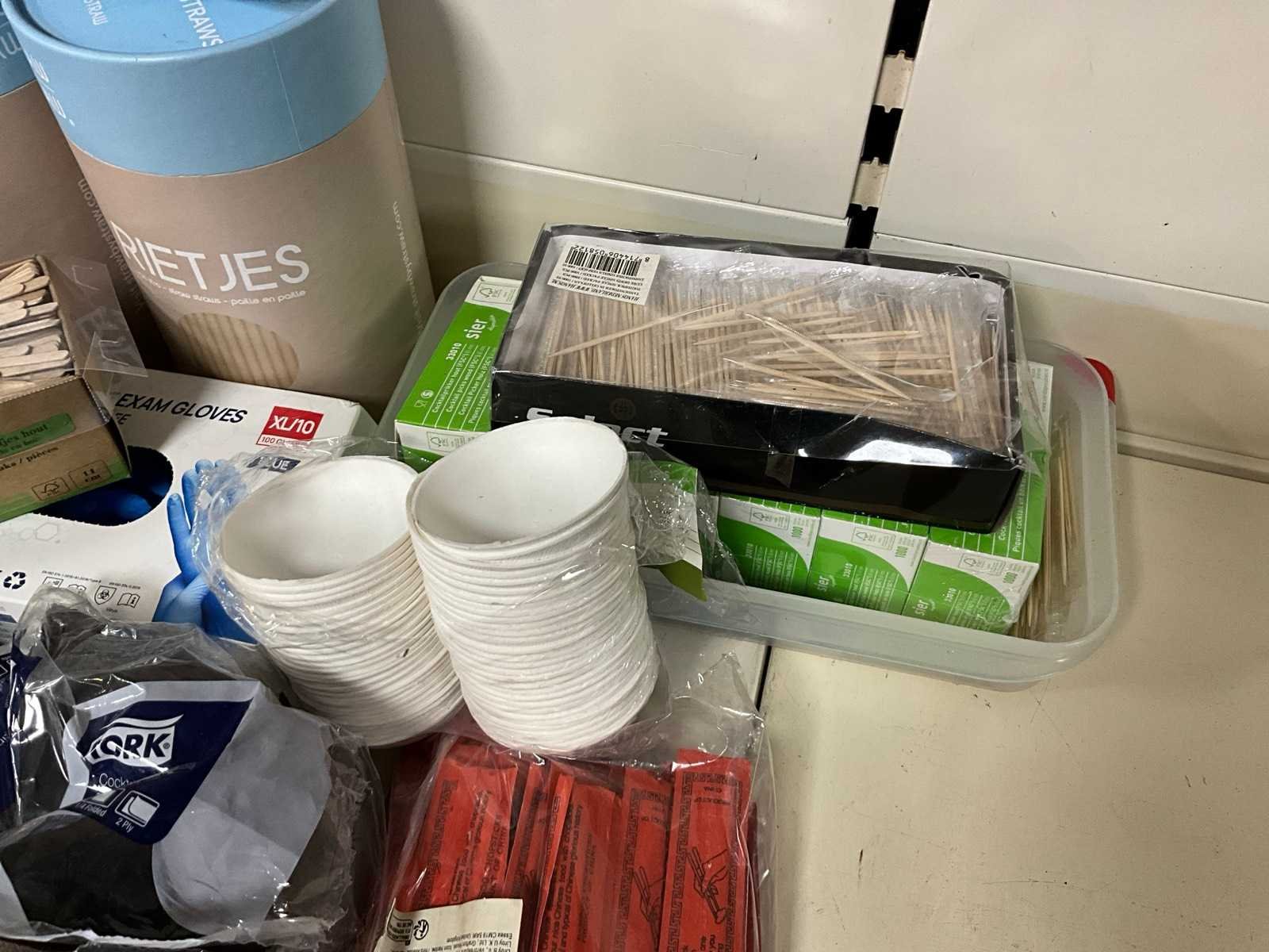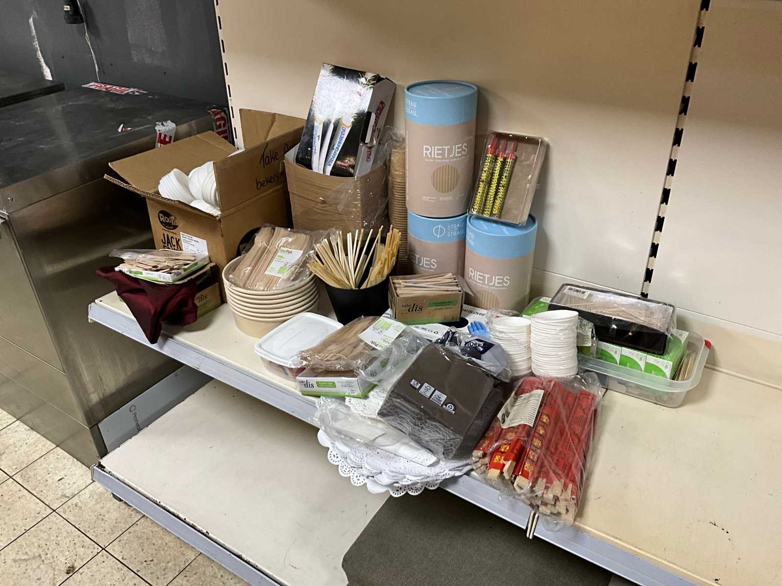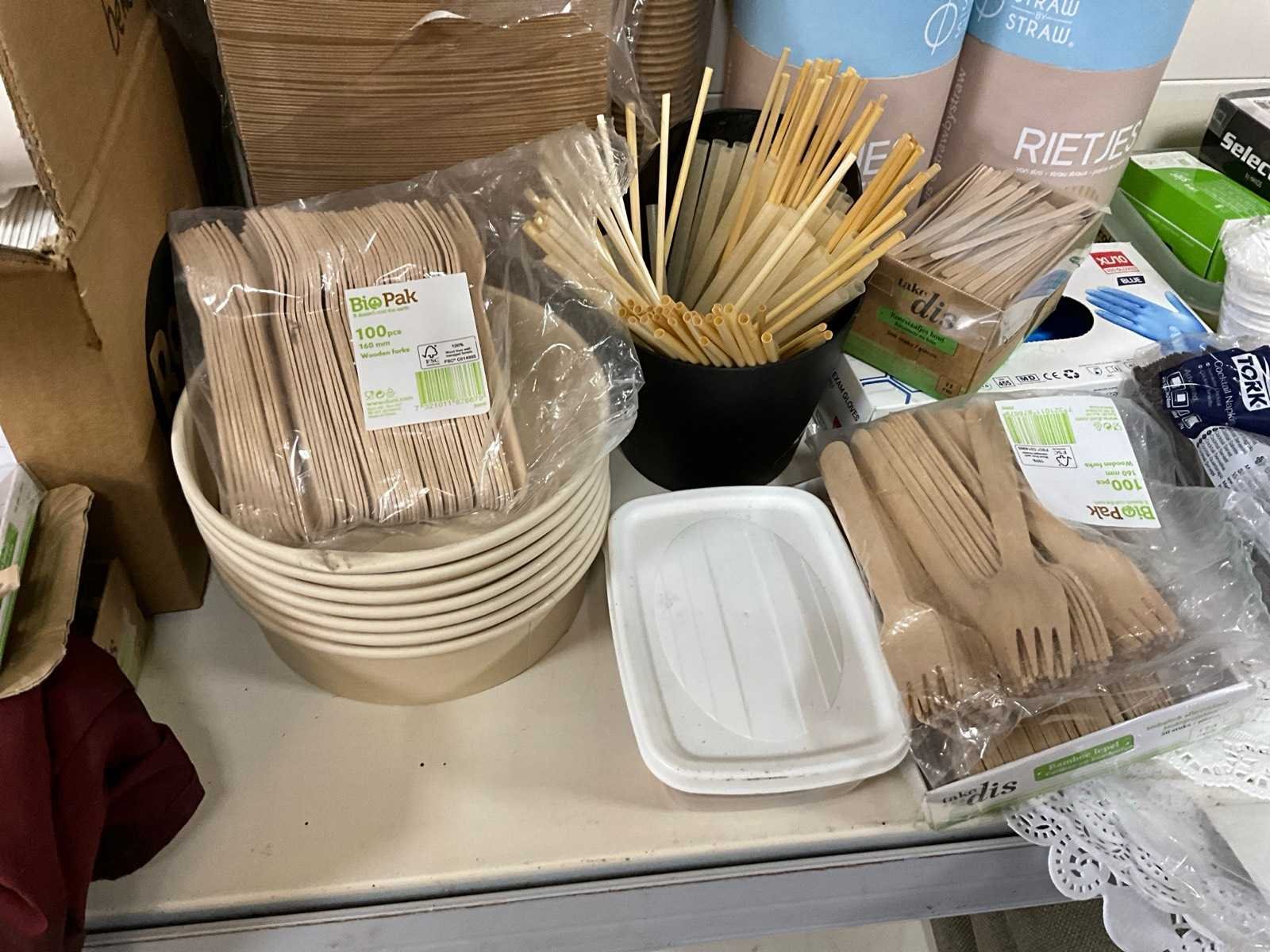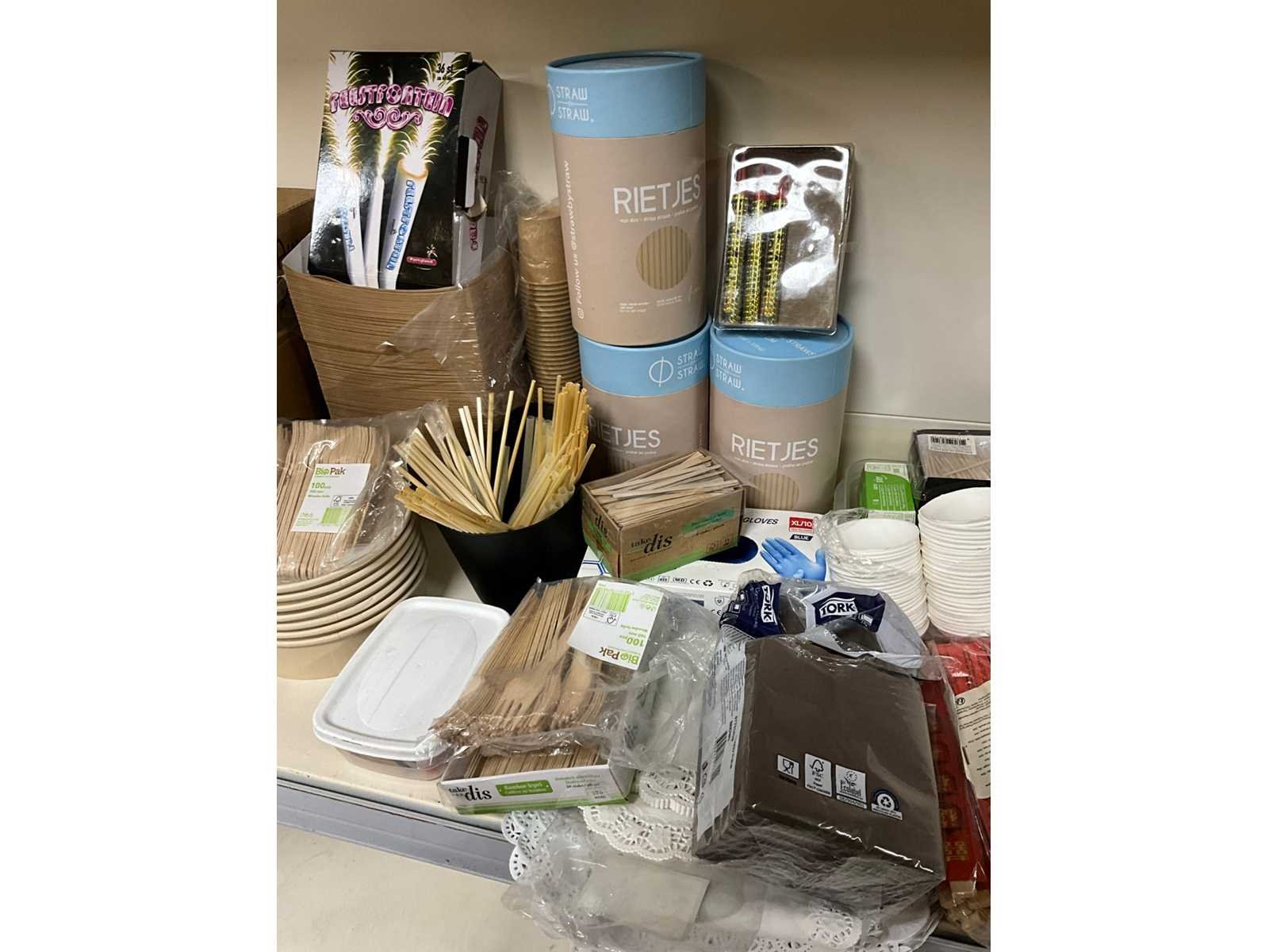 Ongebruikt; vorkjes, rietjes en papieren bakjes. Merk: Take Dis