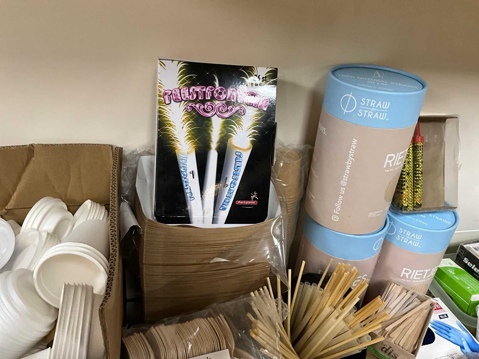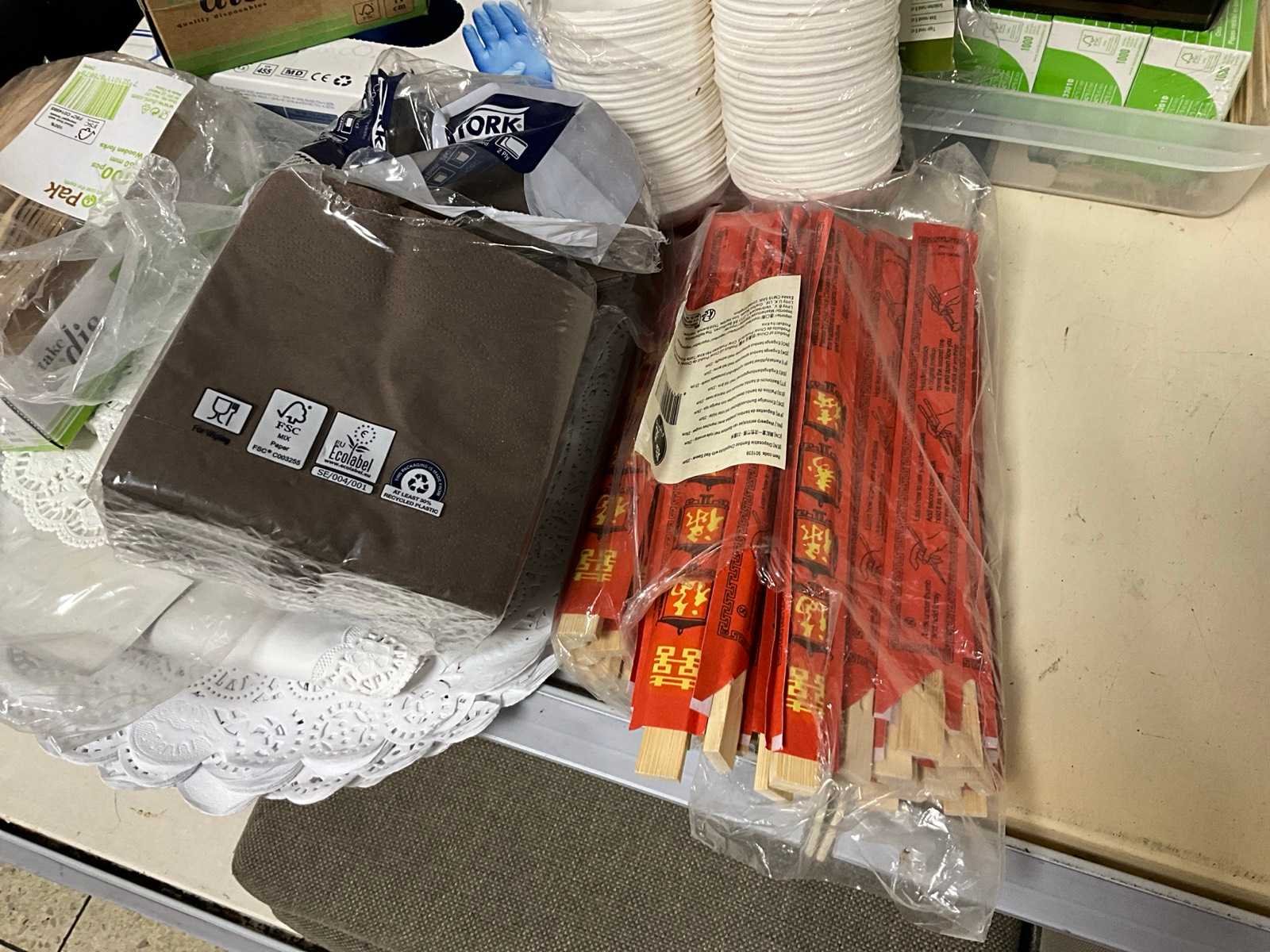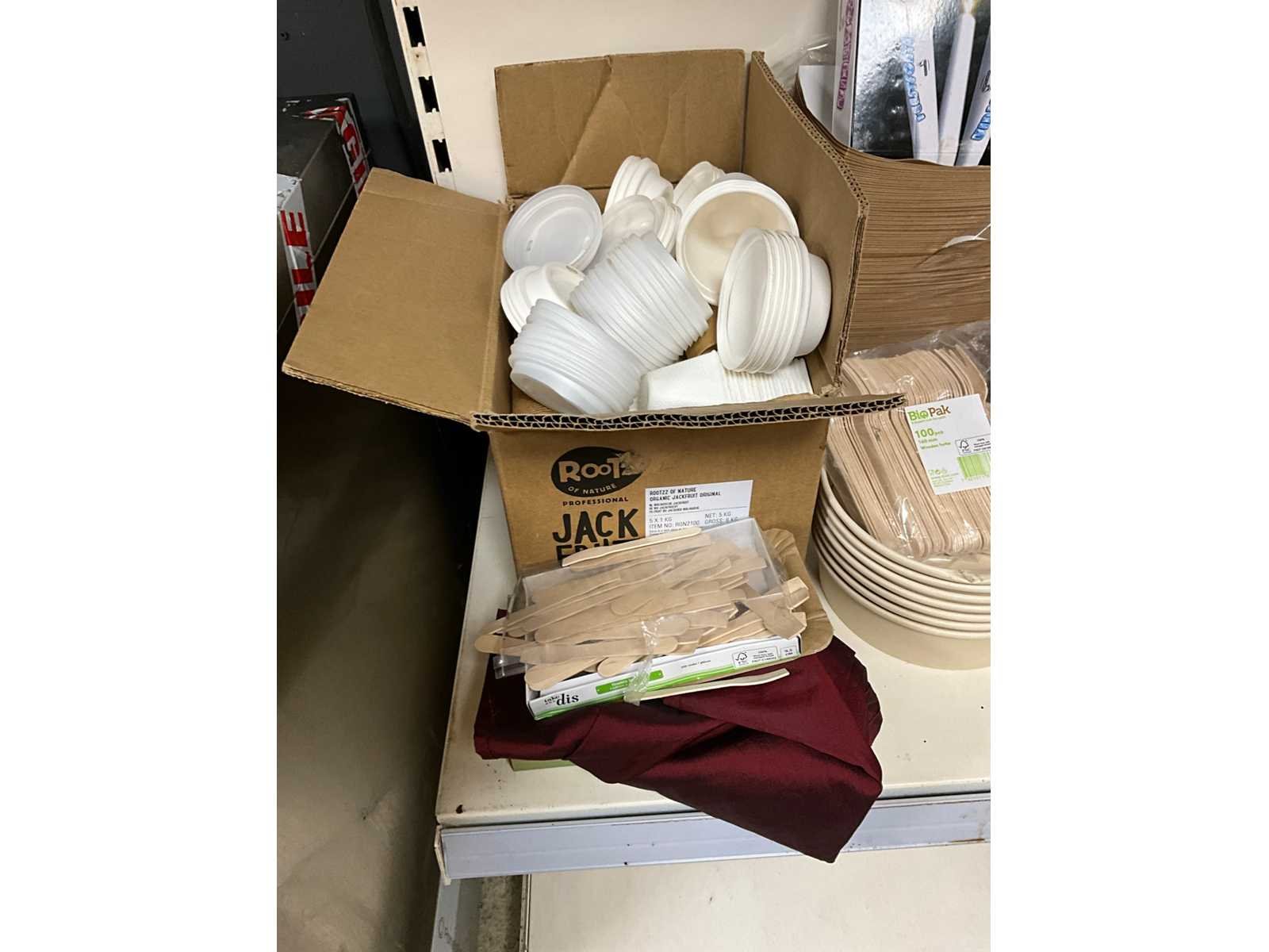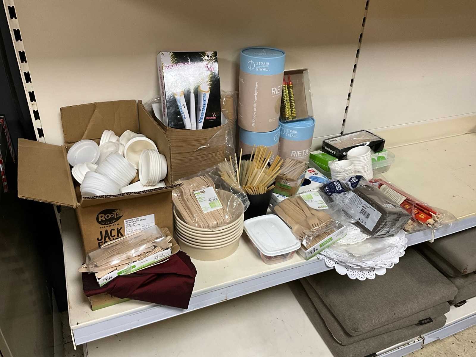 Ongebruikt; vorkjes, rietjes en papieren bakjes. Merk: Take Dis