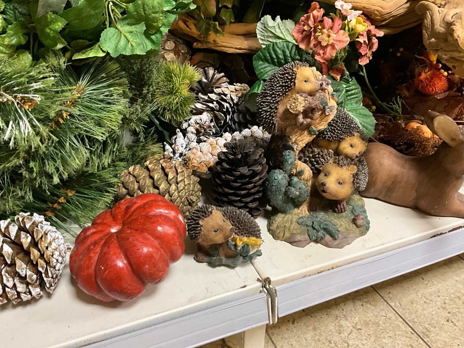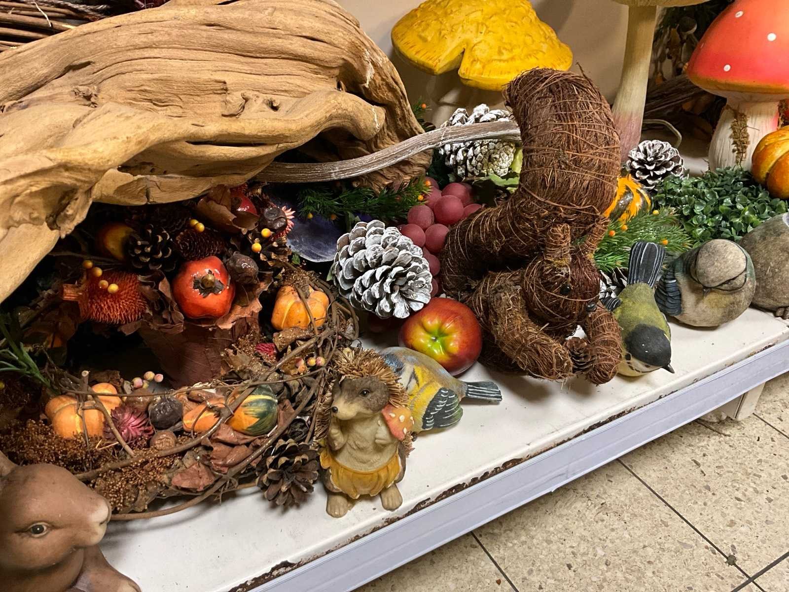 Dennenappels, paddenstoelen en decoratie stammen. Hout: true Kunststof: true