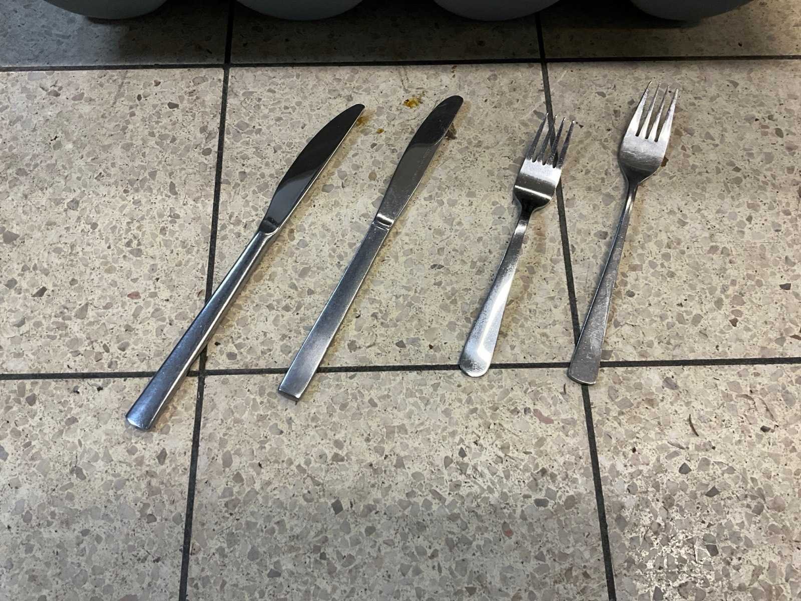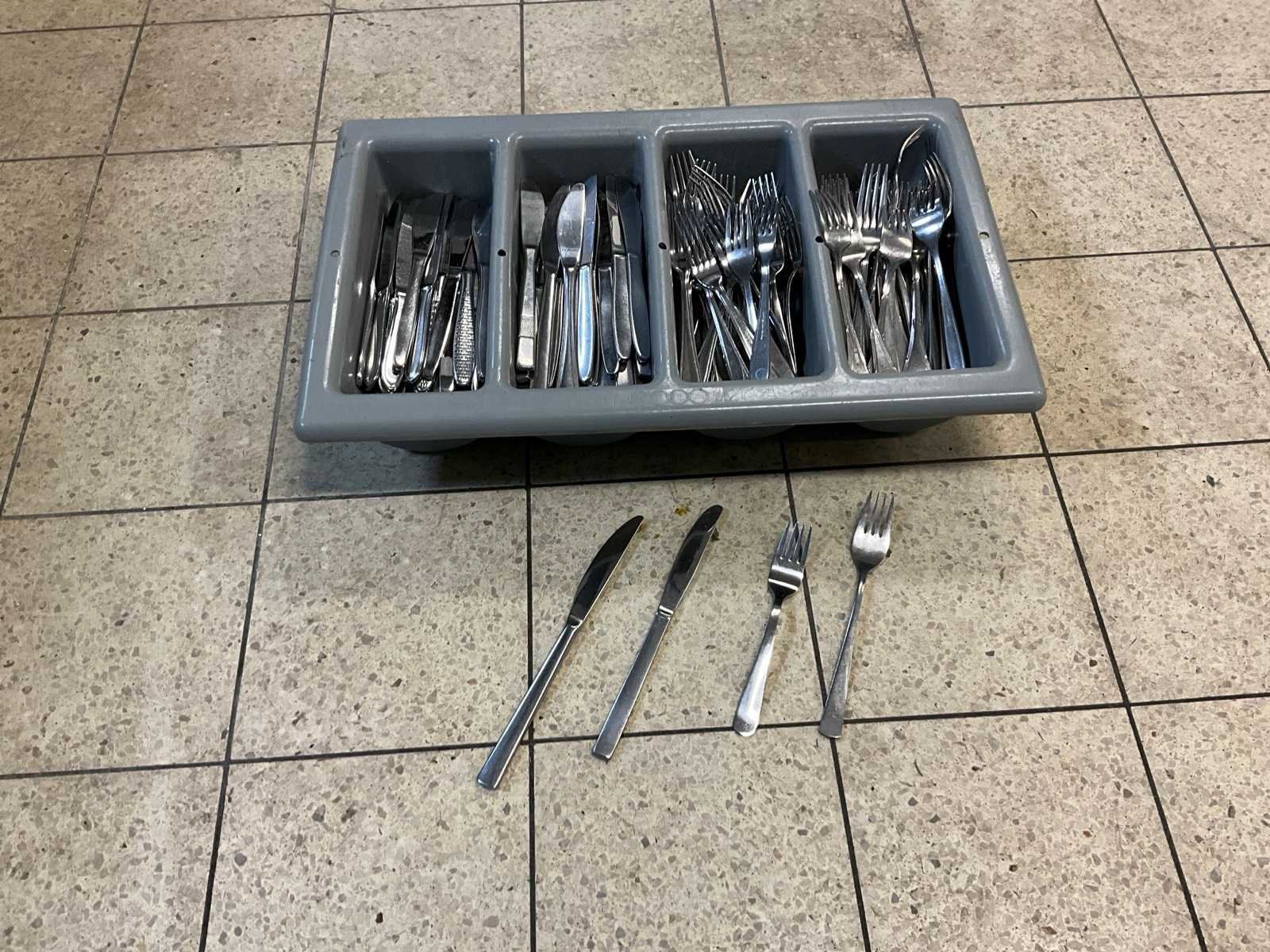 100 x vork; 100 x mes; niet identiek; inclusief bestekbak. Totale afmeting L: 20cm