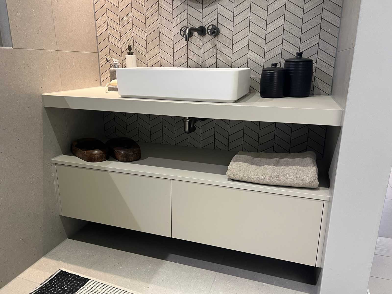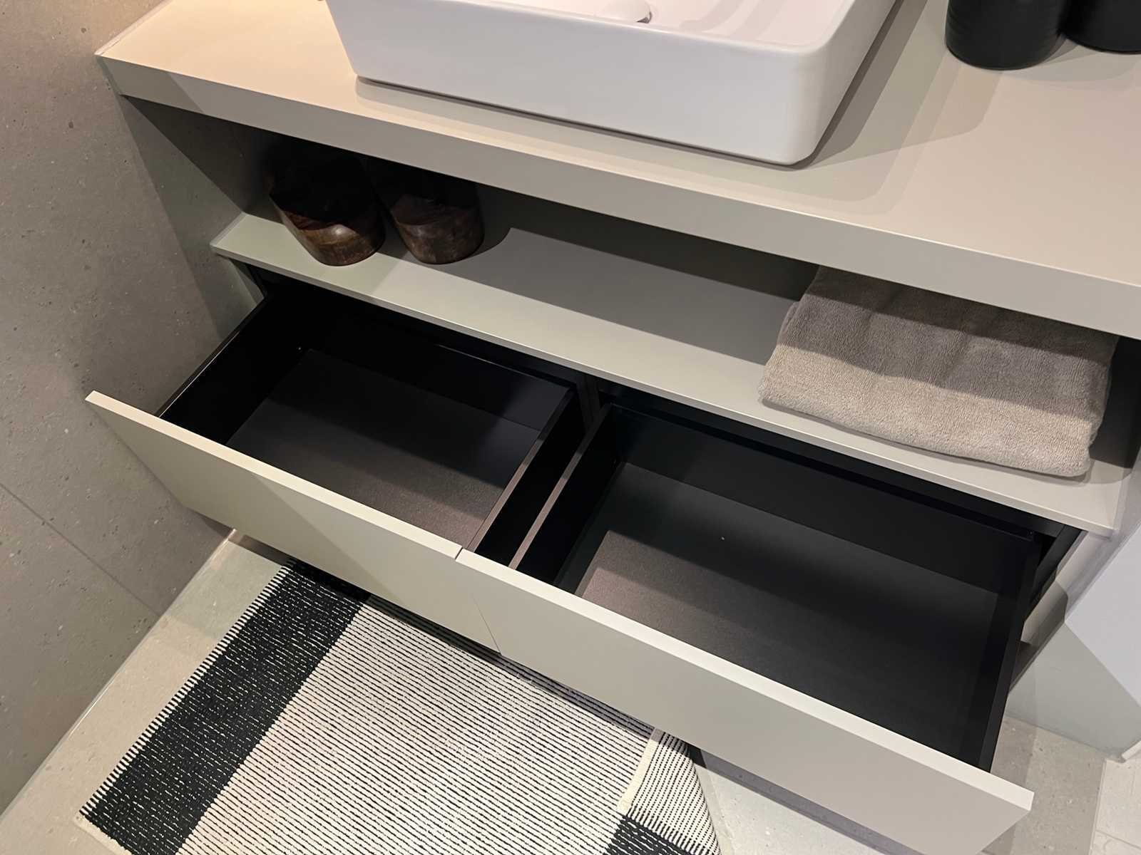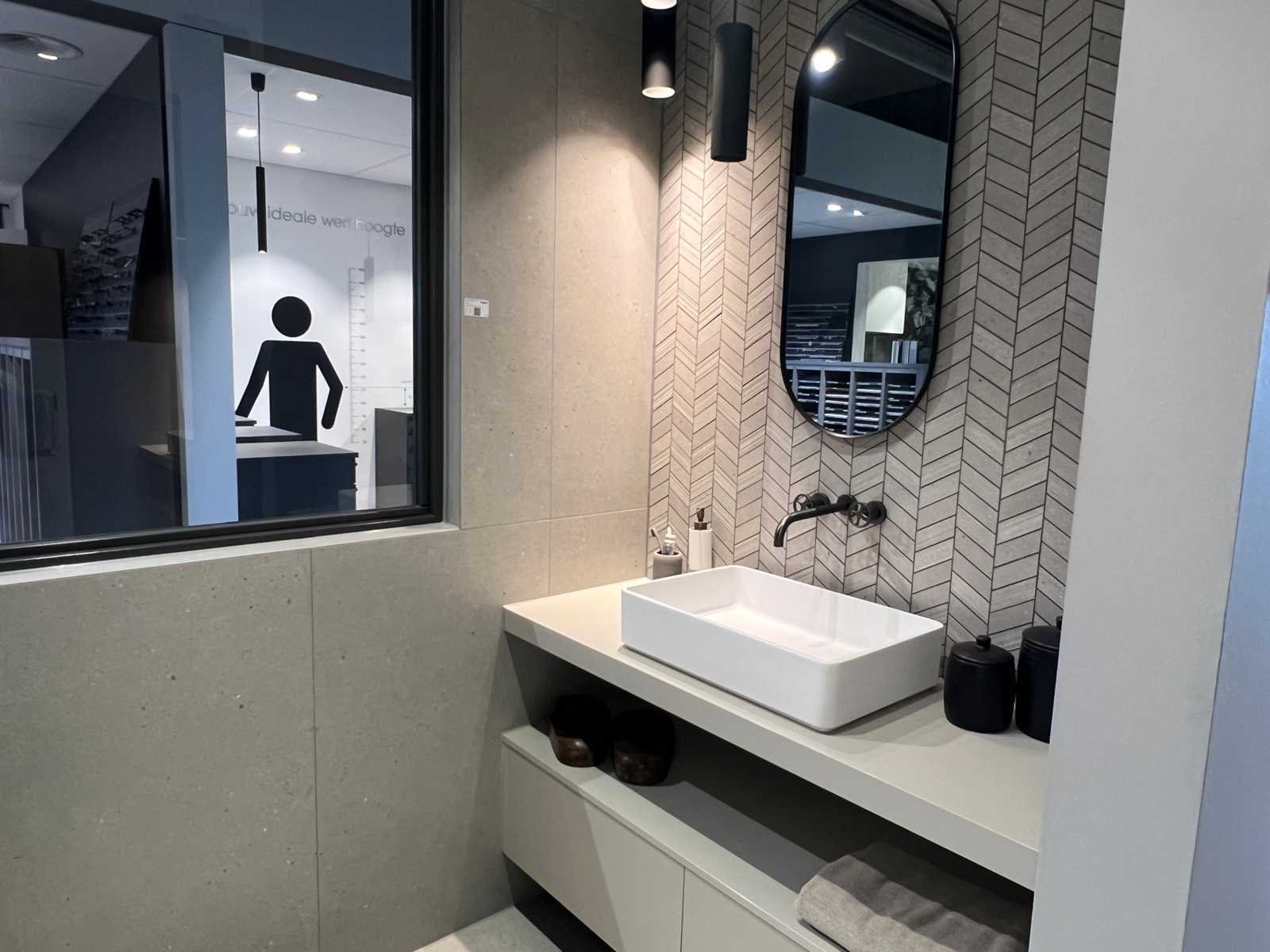 Reeds gedemonteerd; kraan zonder inbouwgedeelte Merk: Baderie Hoogte: 4cm Breedte: 141cm Kraan: Ja Waskom: Ja Spiegel: Ja