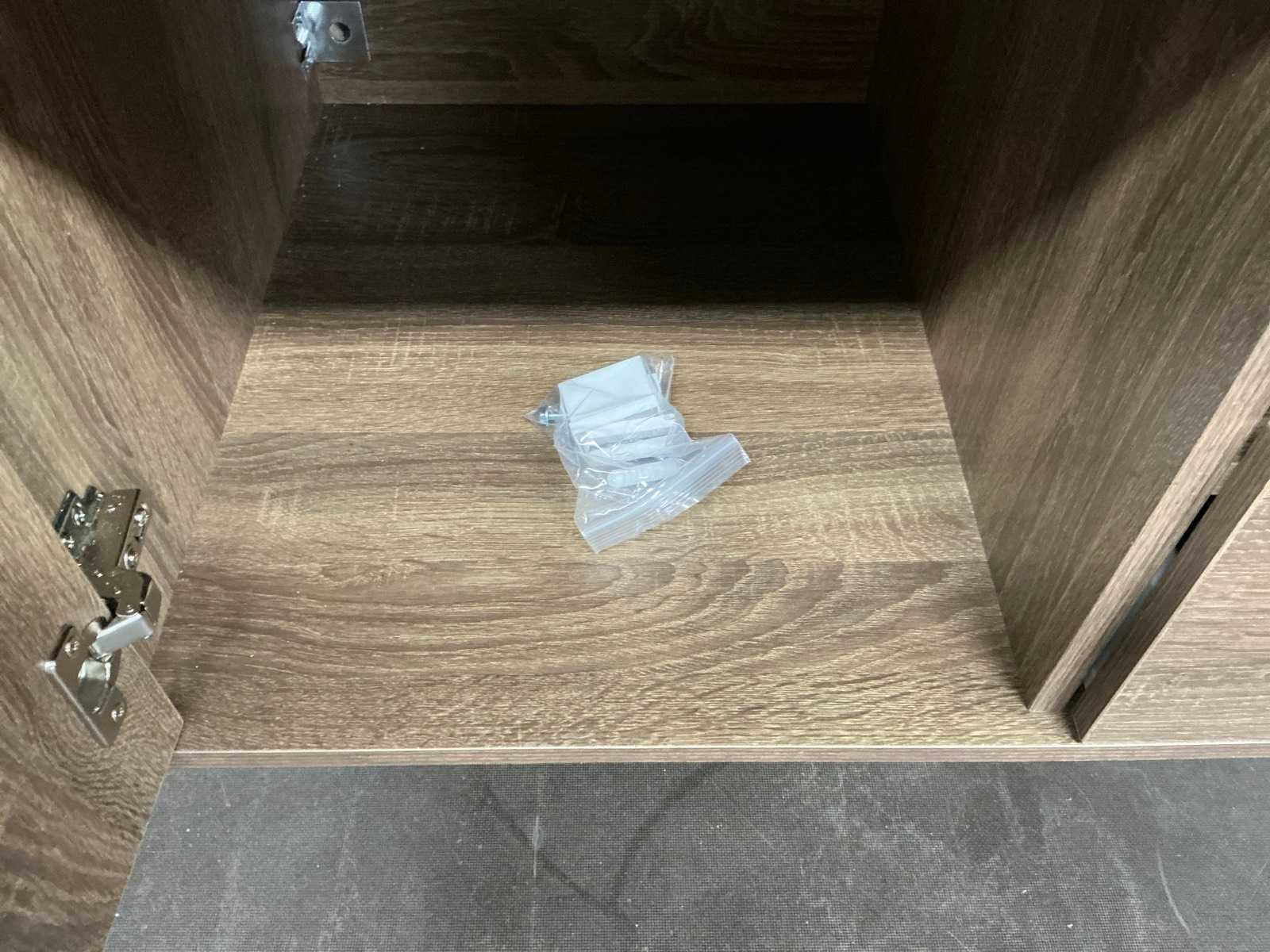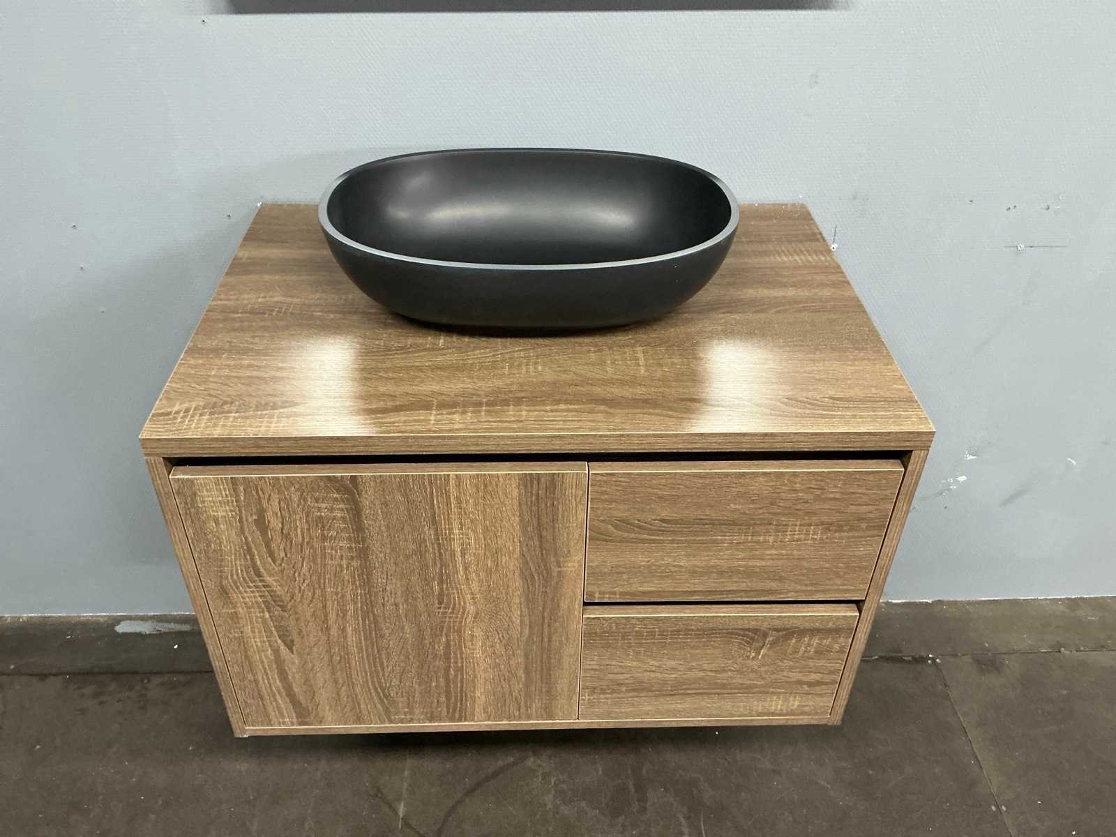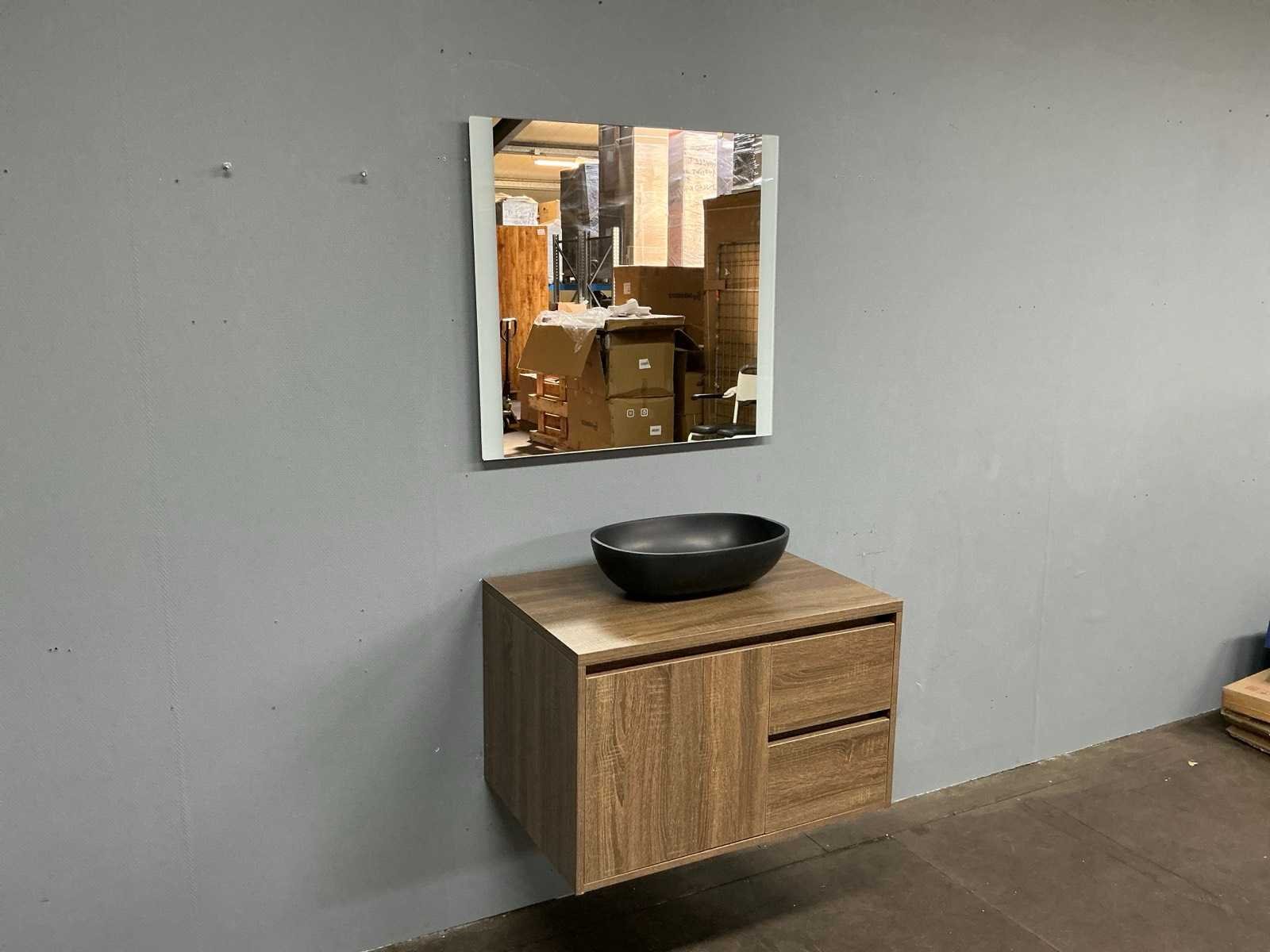 Badmeubelset met: onderkast 55x80x50 cm, waskom 48x32,5x13,5 cm, spiegel 80x75 cm Kleur: Hout,Antraciet Mat Waskom: Luca Sanitair Spiegel met verlichting: Primabad Lades: 2 Bevestigingsmateriaal: true