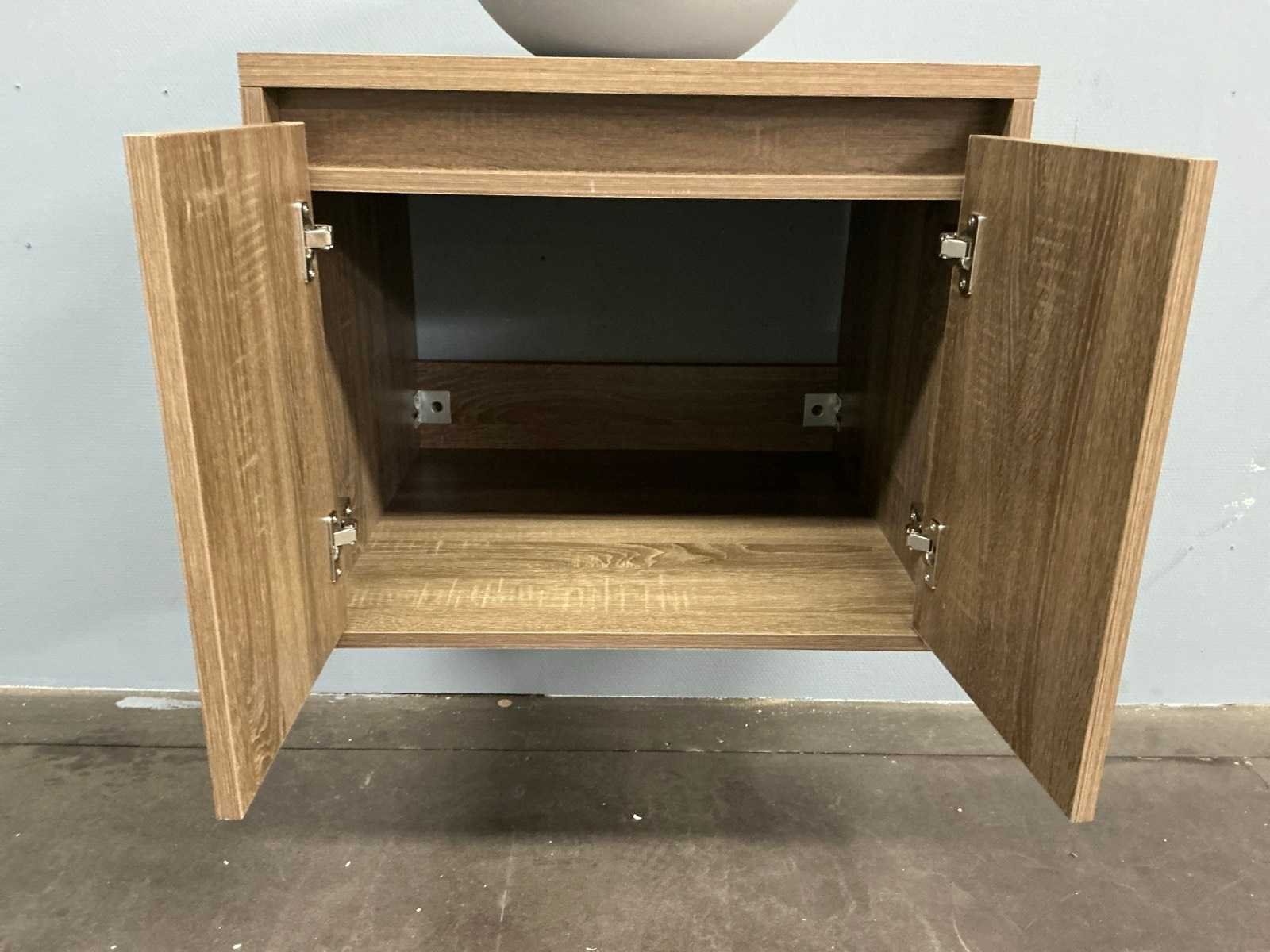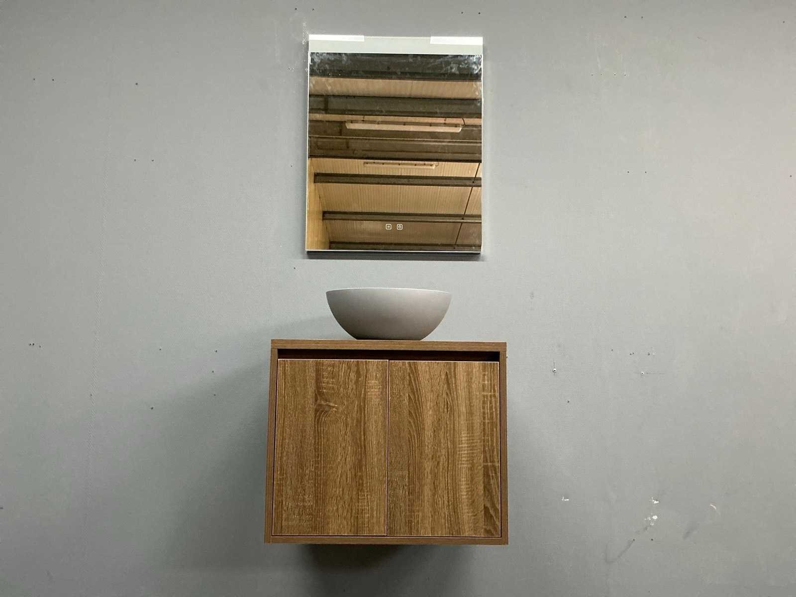 Badmeubelset met: onderkast 55x60x50 cm, waskom 38 cm, spiegel 60x75 cm Kleur: Hout,Mat Grijs Waskom: Arqua Case Spiegel met verlichting: Primabad